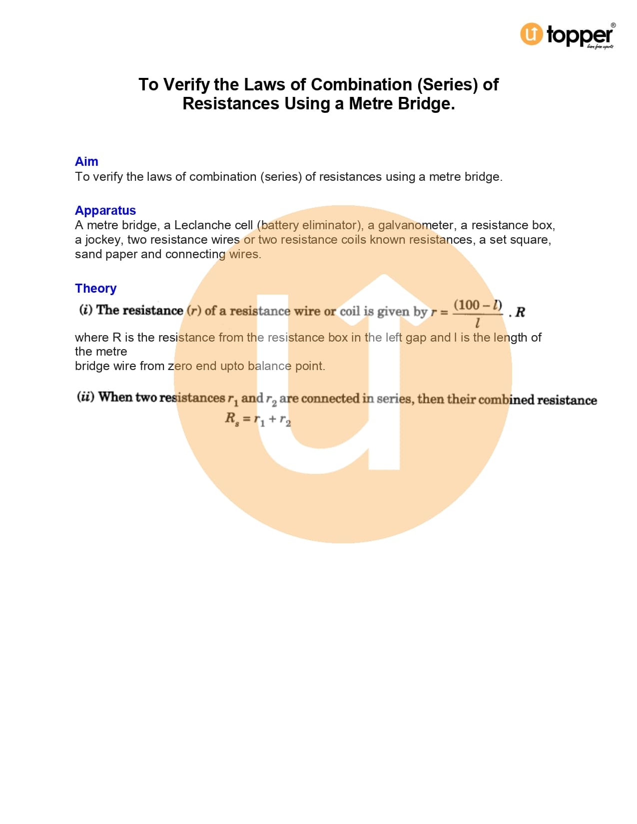 - To verify the laws of combination (parallel) of resistances using a metre bridge.