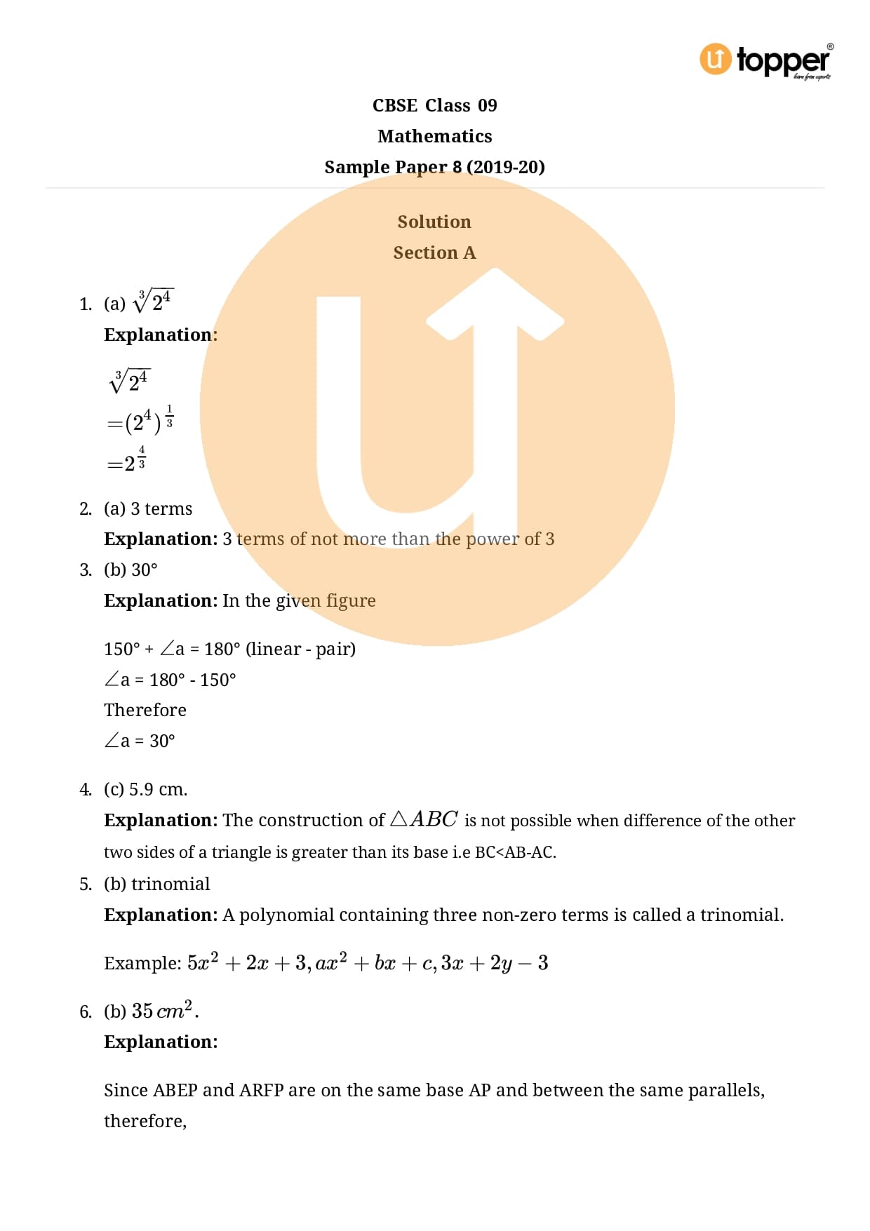CBSE Class 9 Maths Exam Sample Paper 8 with Solutions Pdf
