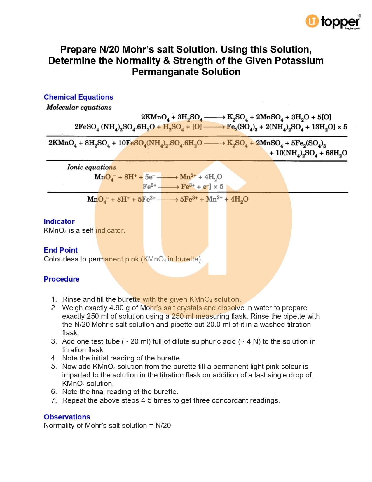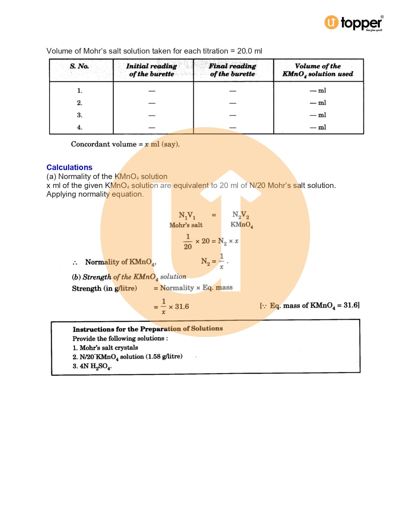 - Exp-11.15 : Prepare N/20 Mohr’s salt solution. Using this solution, determine the normality and strength of the given potassium permanganate solution.