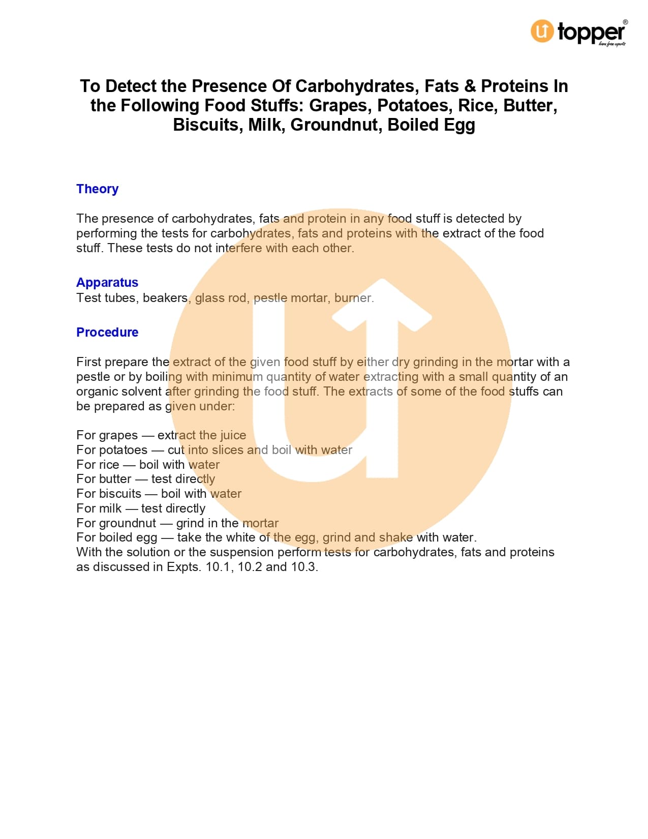 - Exp-10.4 : To detect the presence of carbohydrates, fats and proteins in the following food stuffs : Grapes, potatoes, rice, butter, biscuits, milk, groundnut, boiled egg .