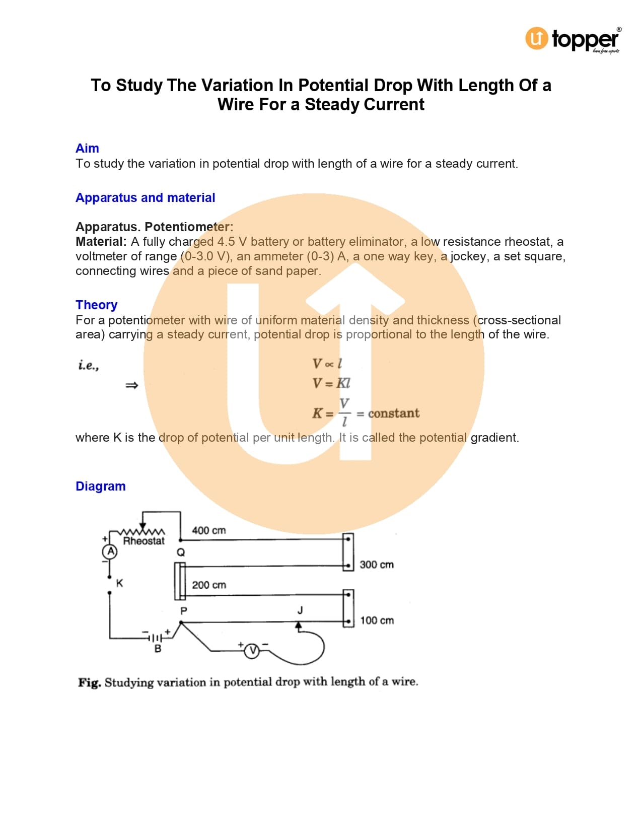- To study the variation in potential drop with length of a wire for a steady current.
