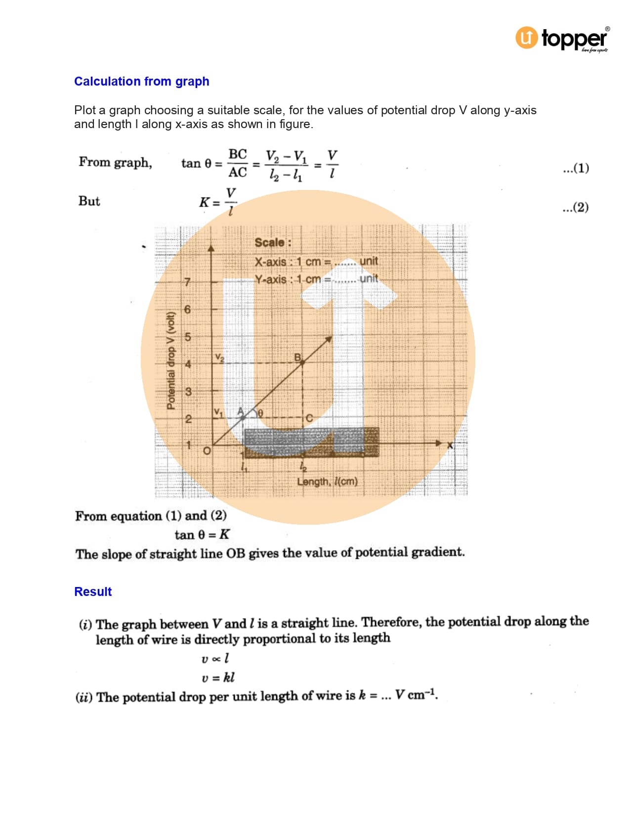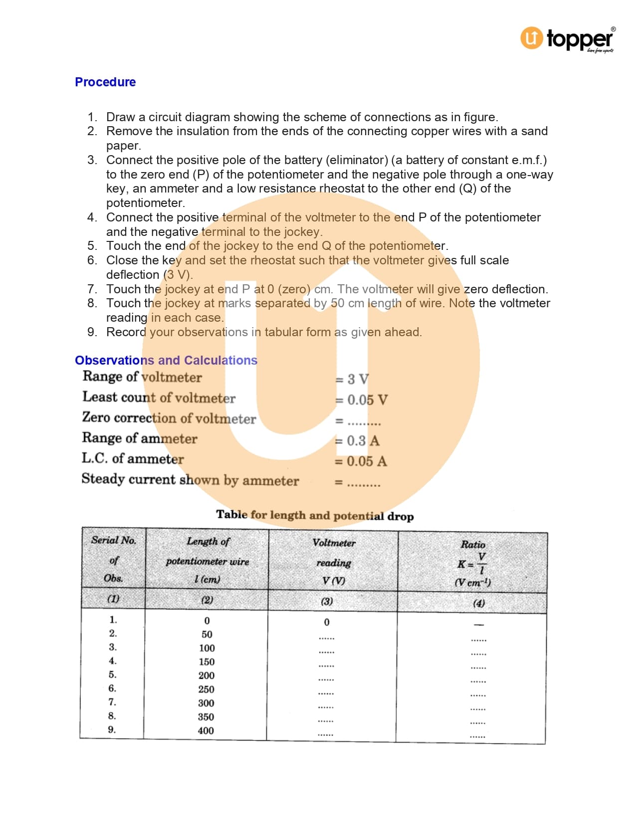 - To determine resistance per cm of a given wire by plotting a graph of potential difference versus current.