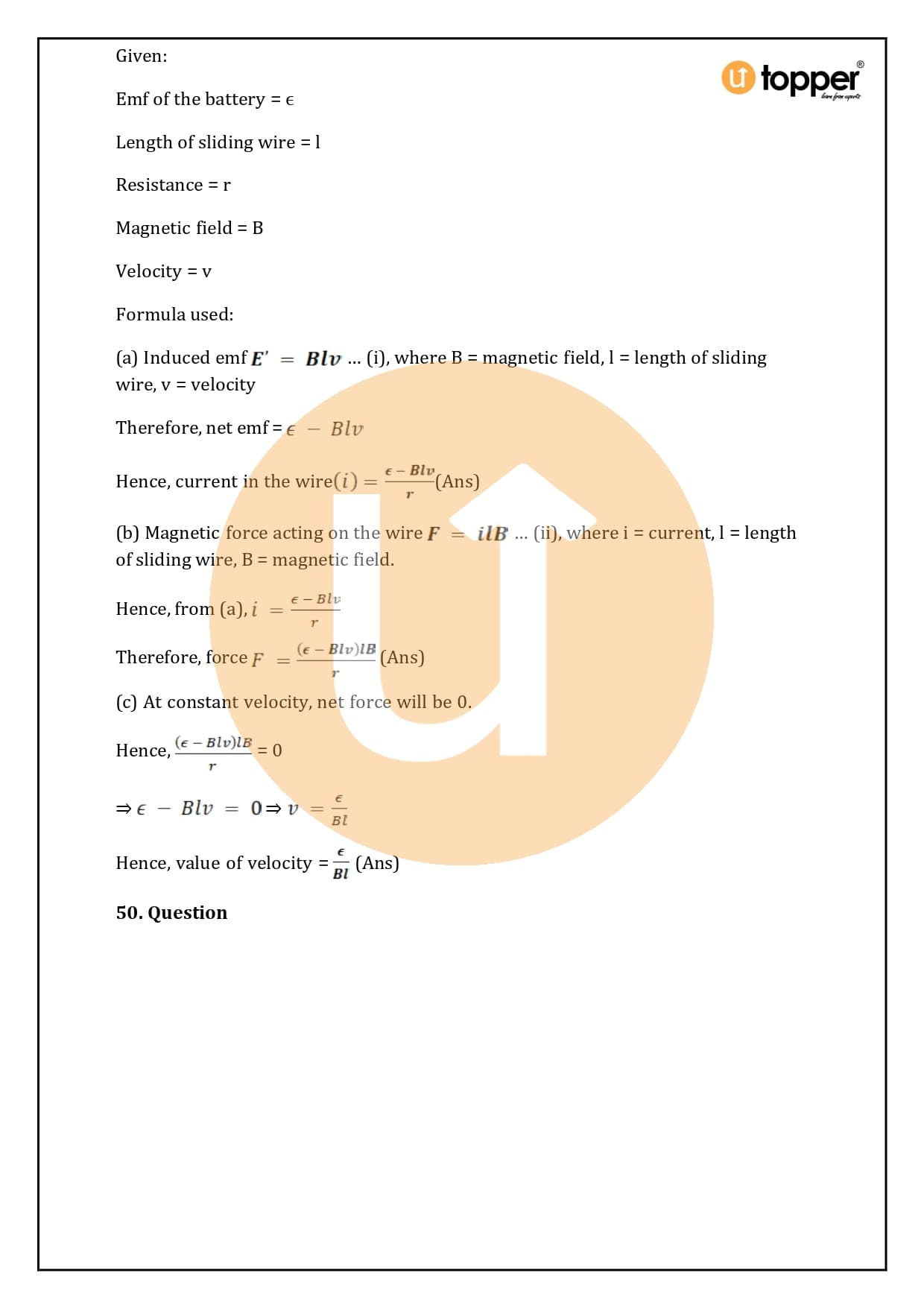 There are a total of 98 questions in the HC Verma Class 12 Physics Solutions Chapter 38- Electromagnetic Induction. Every question is answered step by step, with a full explanation of how the ideas in the question are used. Most of the questions are based on numbers and derivations, which require a strong understanding of the ideas covered in Electromagnetic Induction. It is important to always understand and remember the ideas.