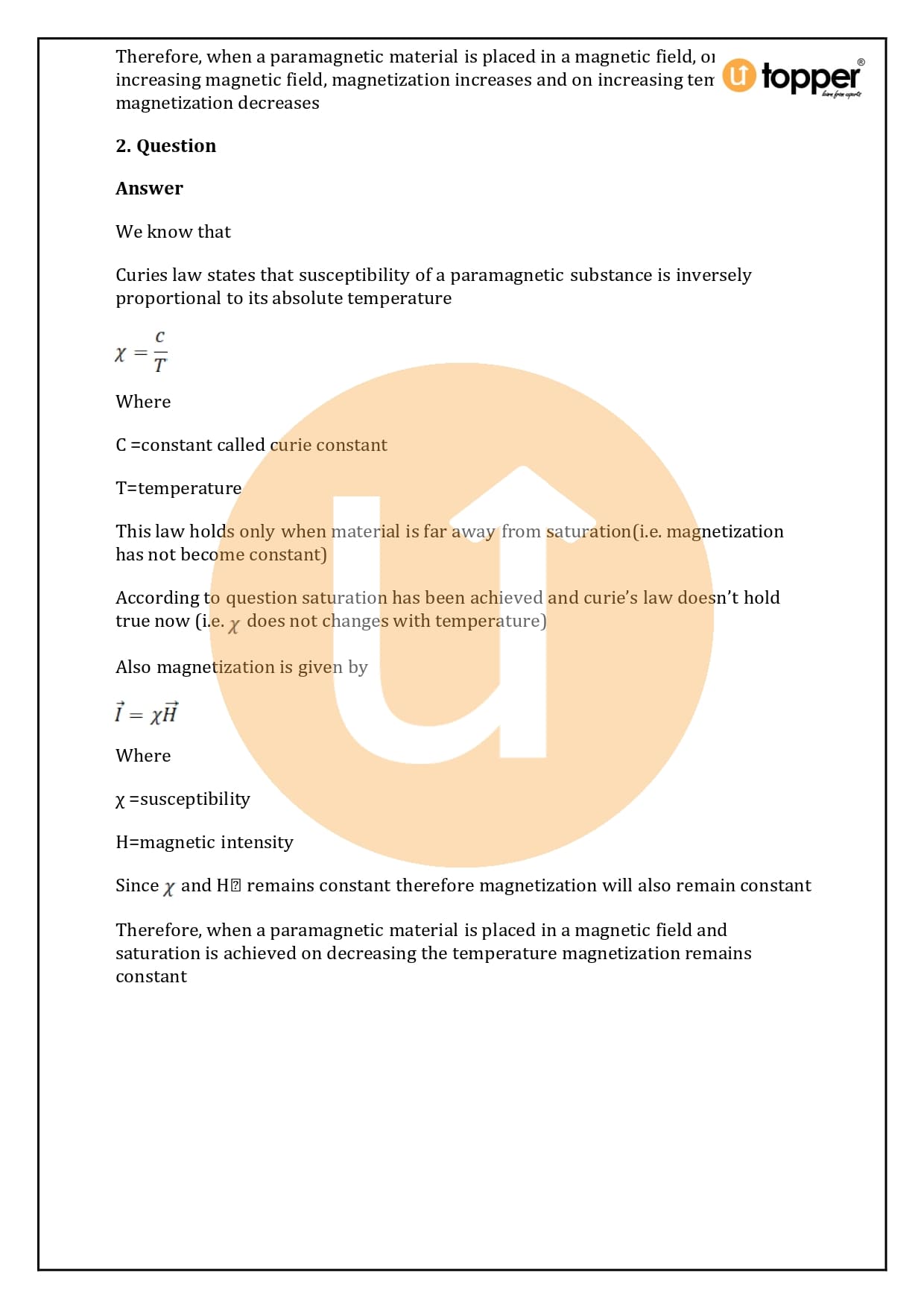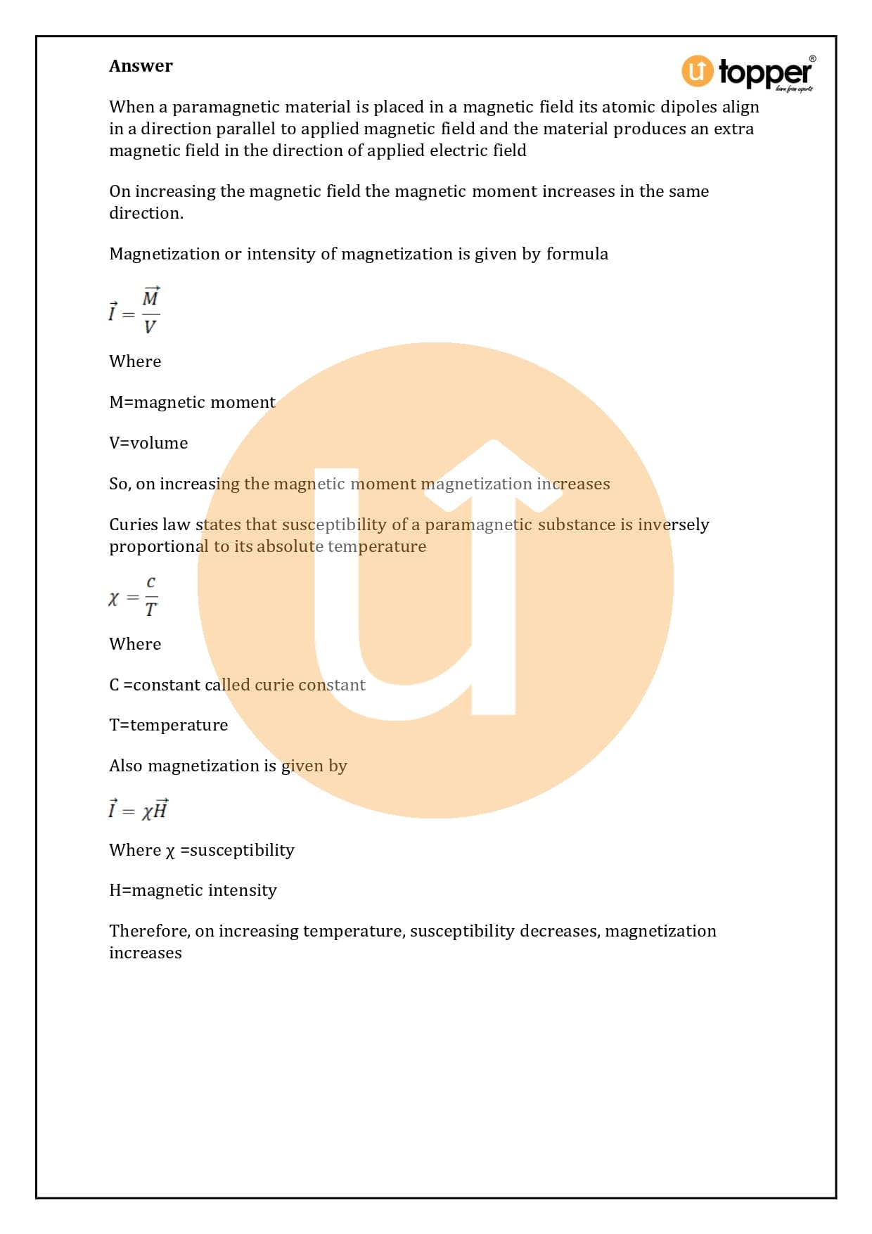 Curie’s law is important for this kind of magnetization. Curie’s law says that the magnetic susceptibility of paramagnetic materials goes down as their temperature goes up. It is shown to be;