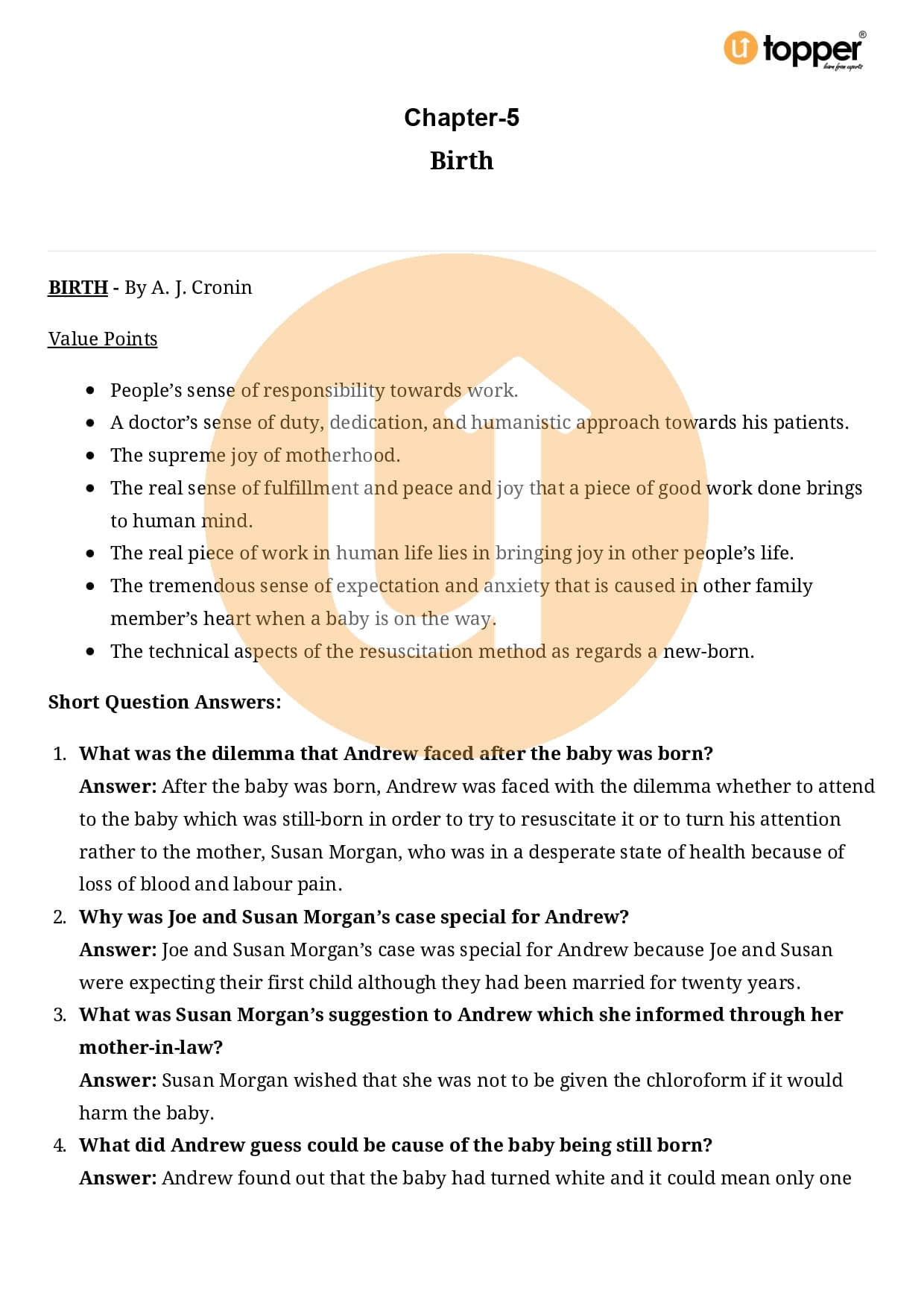 Class 11 English Snapshots Important Questions Chapter 5 Pdf – Birth