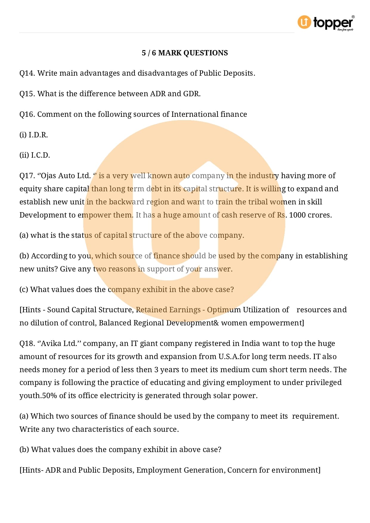 Class 11 Business Studies Important Questions Chapter 8 Pdf – Sources of Business Finance