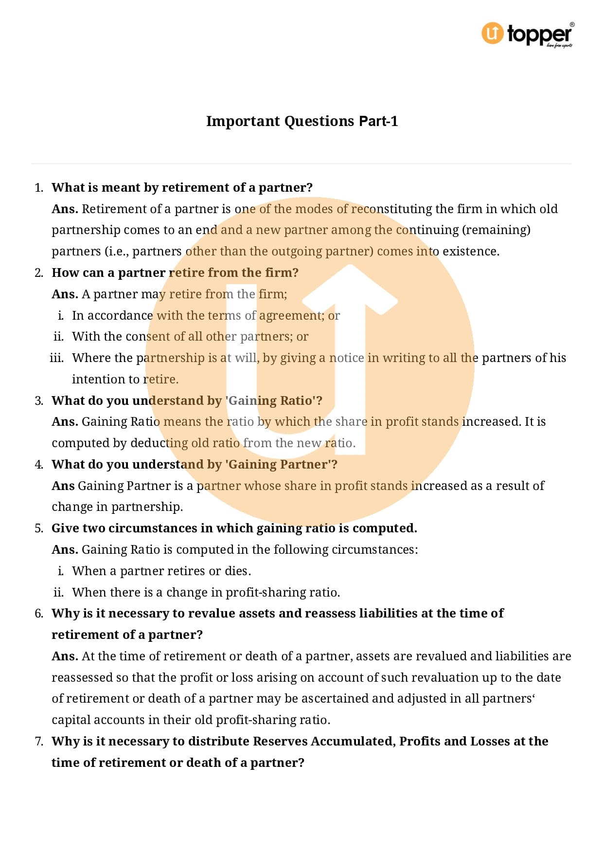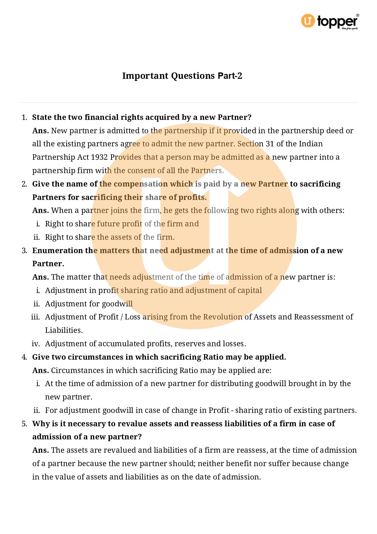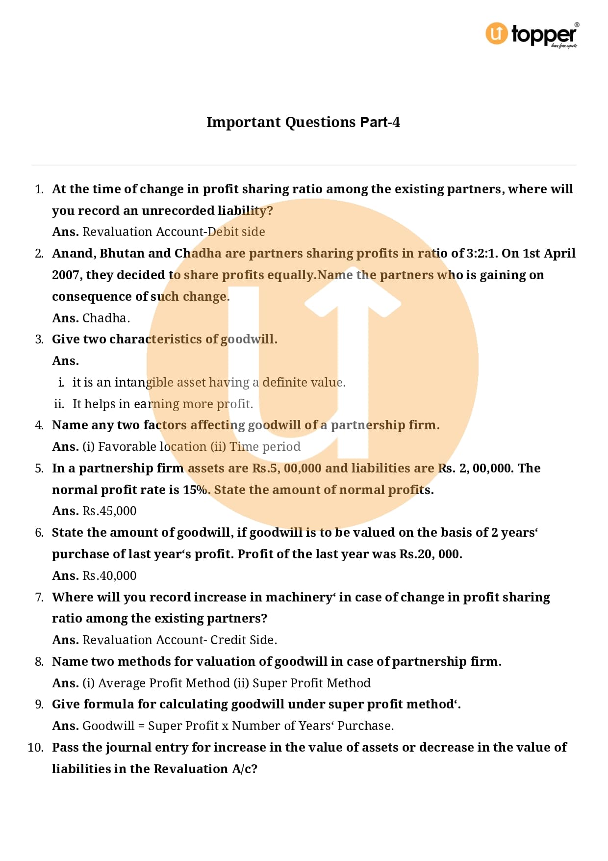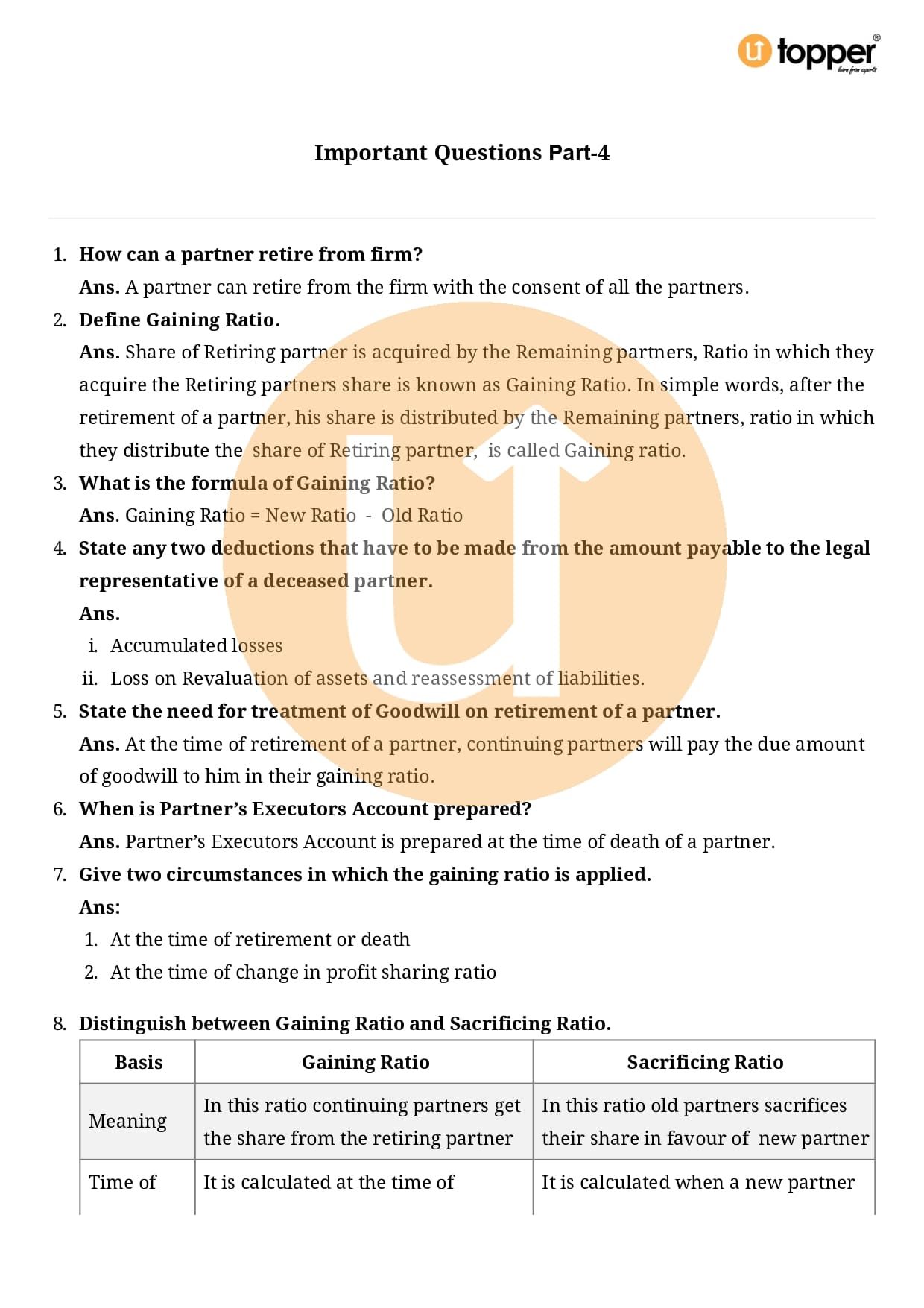 Class 12 Accountancy Important Questions Chapter 4 Pdf – Reconstitution of a Partnership Firm – Retirement /Death of a Partner