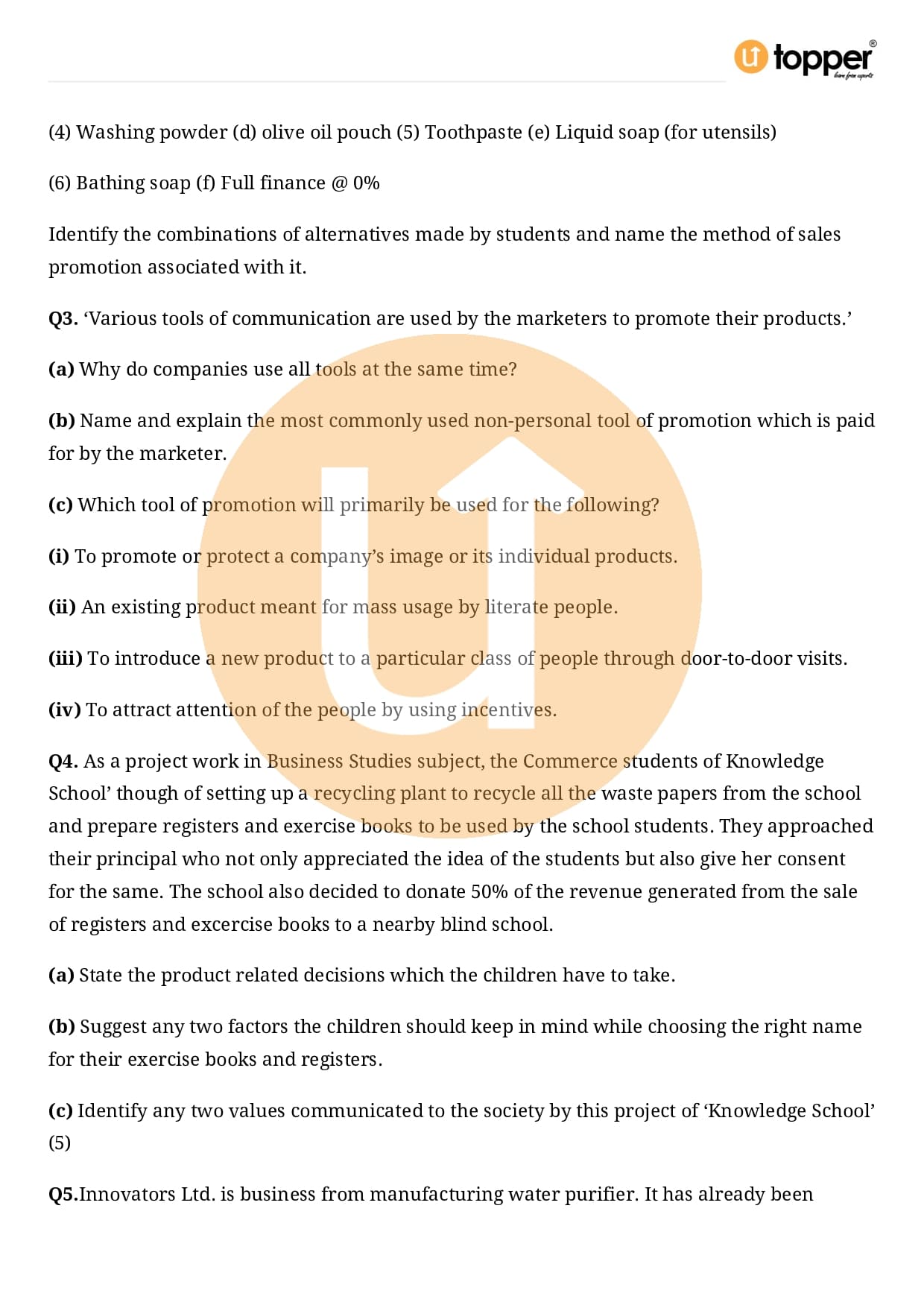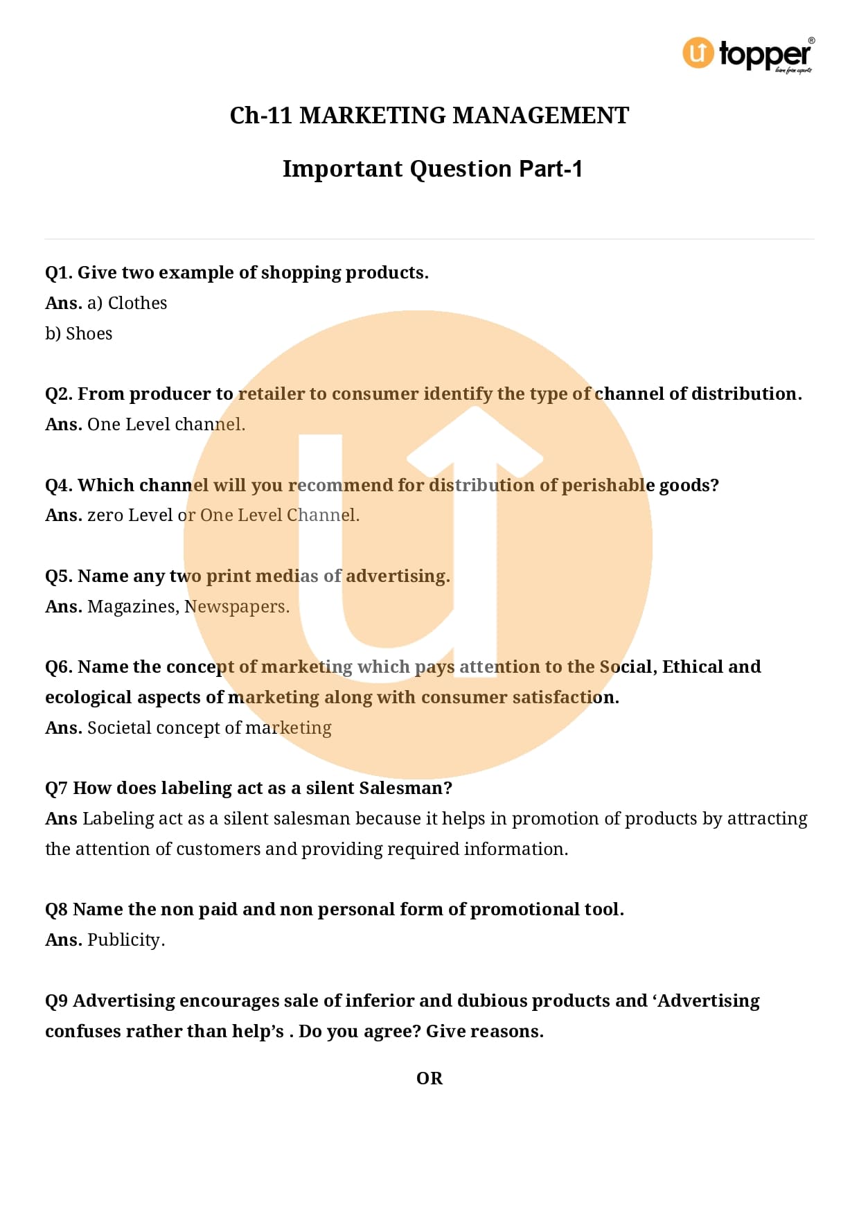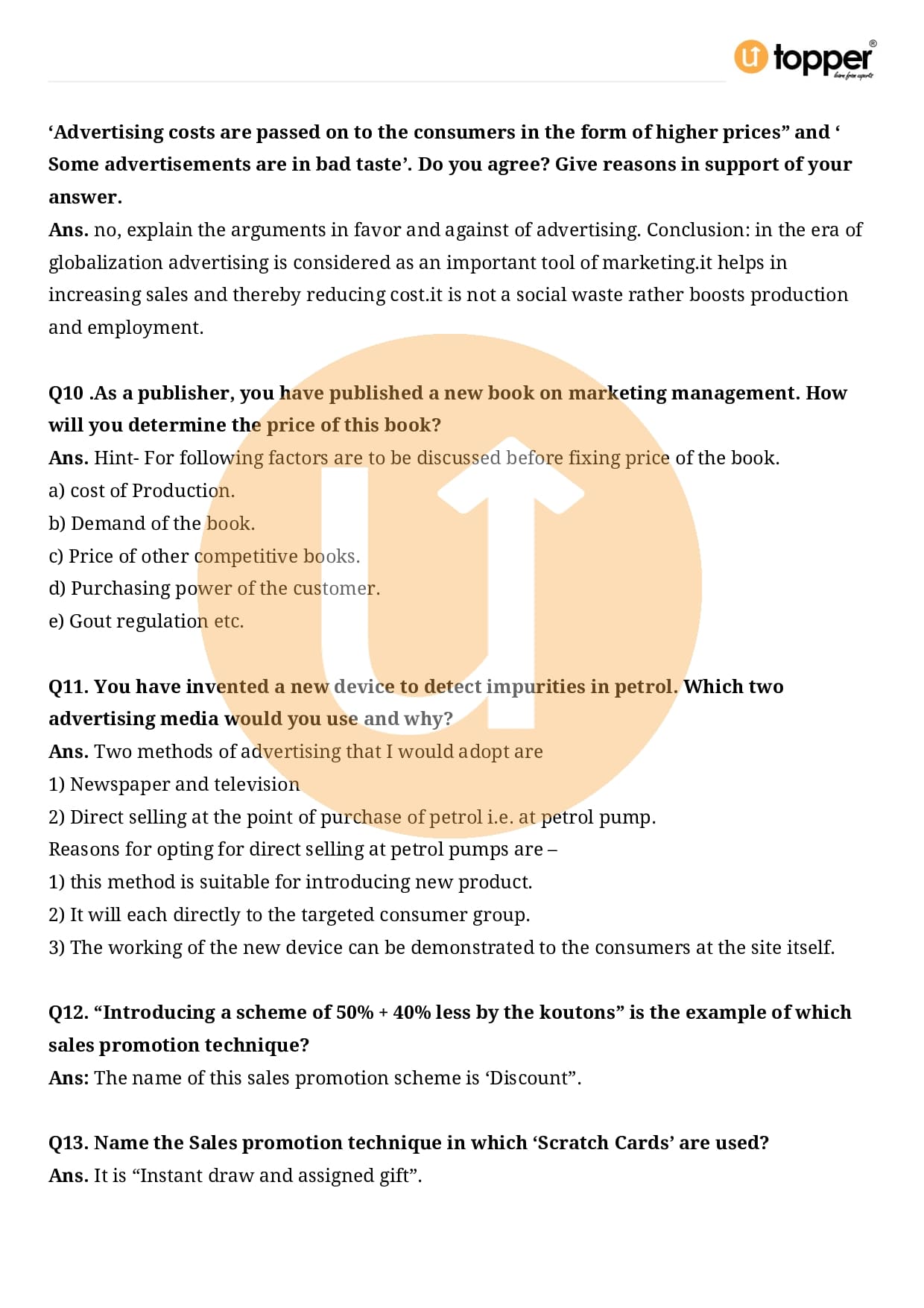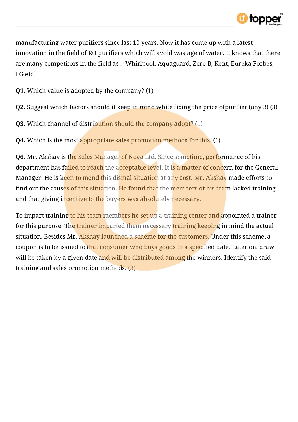 Class 12 Business Studies Important Questions Chapter 11 Pdf – Marketing