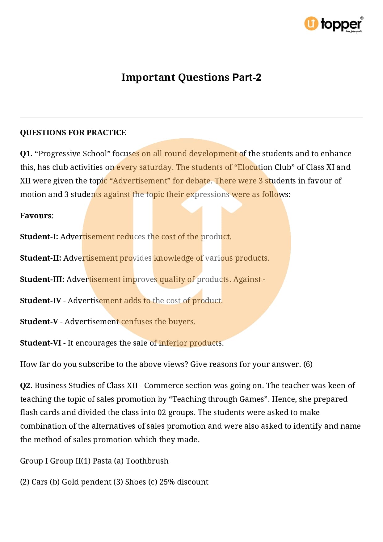 Important Questions for Class 12 Business Studies – Free PDF Download
