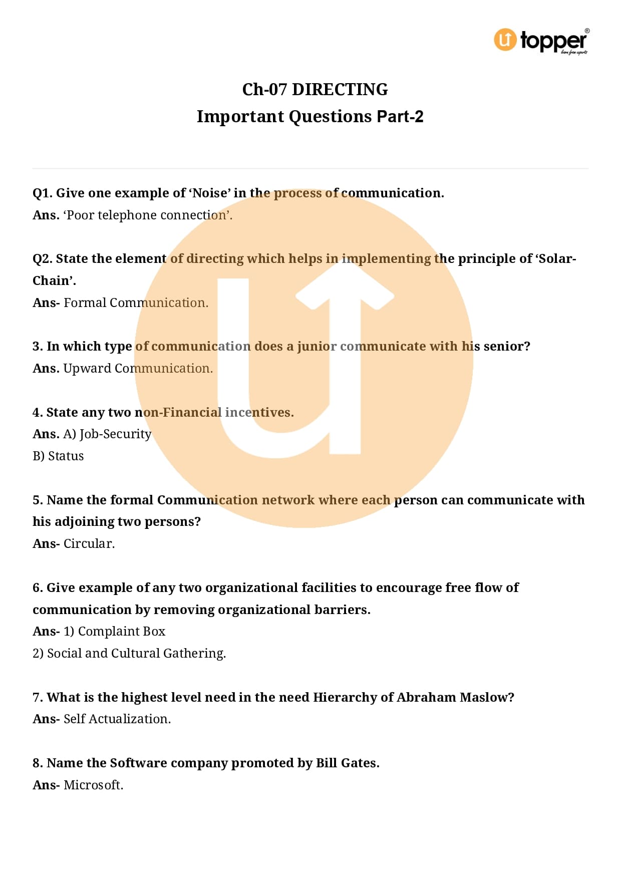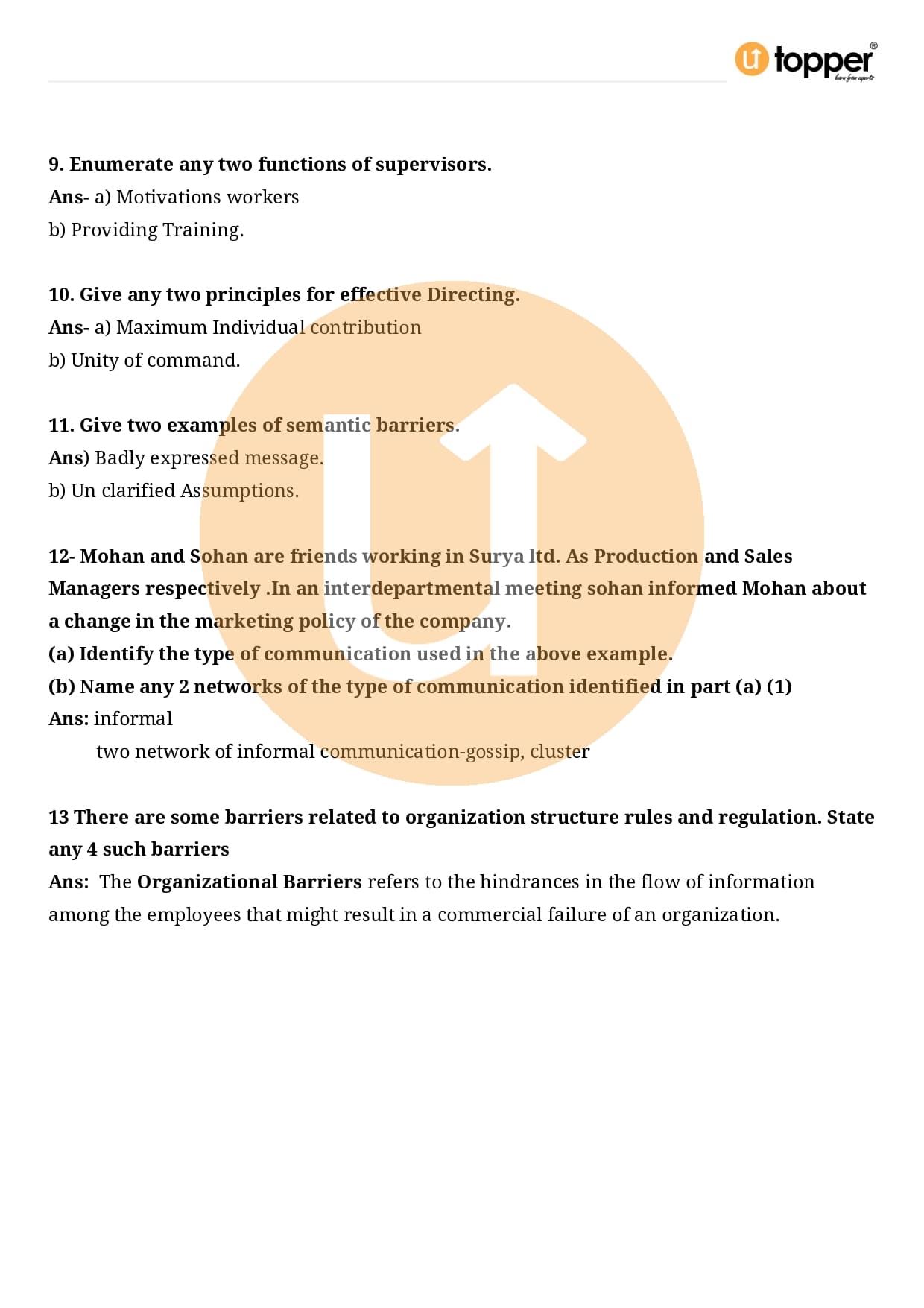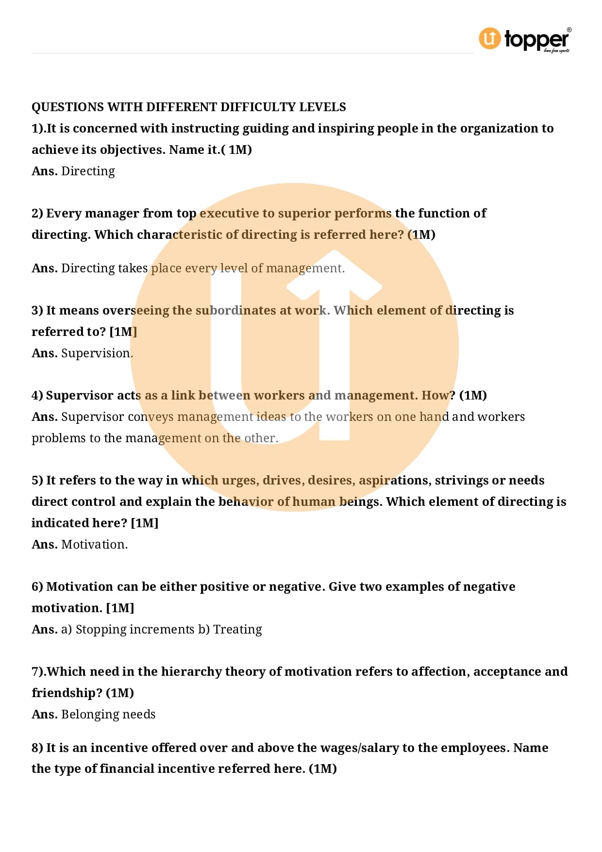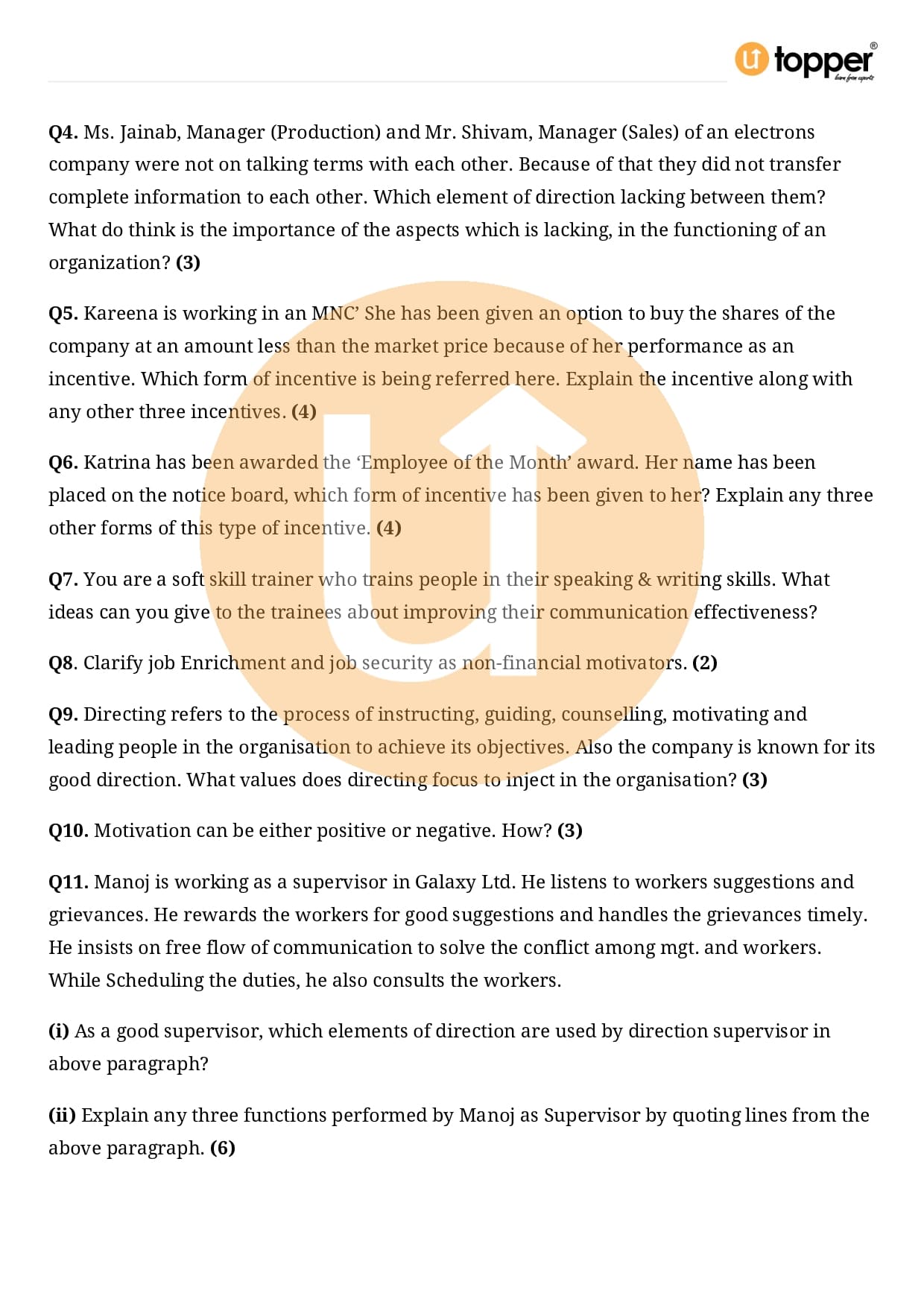 Class 12 Business Studies Important Question CBSE Chapter 7 – Directing