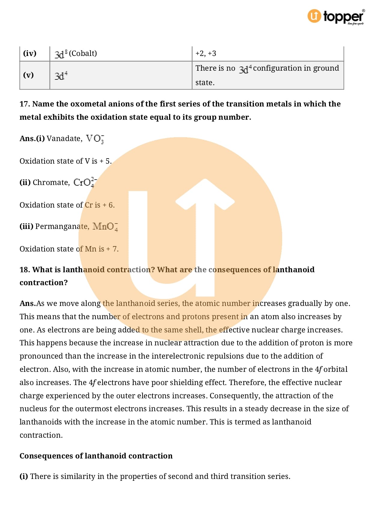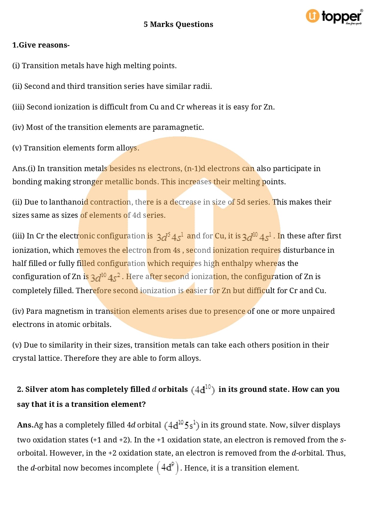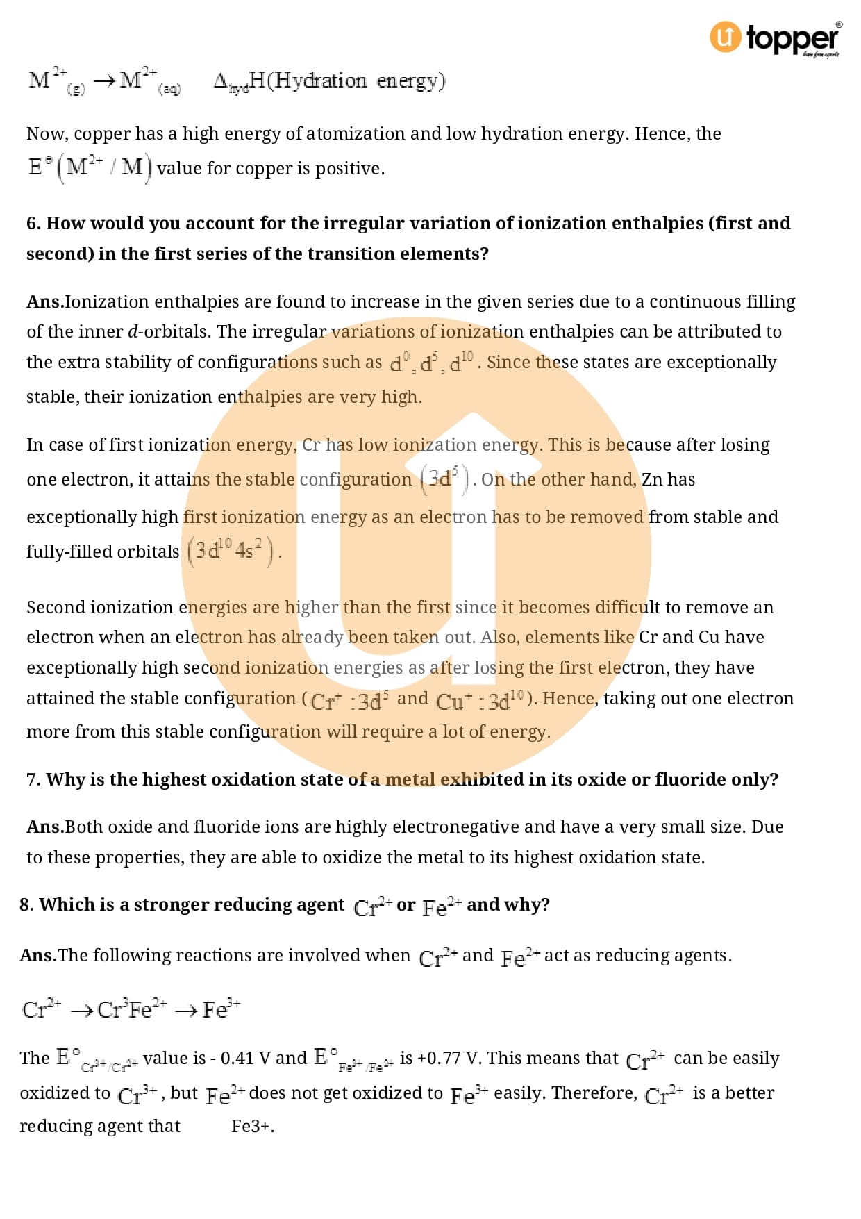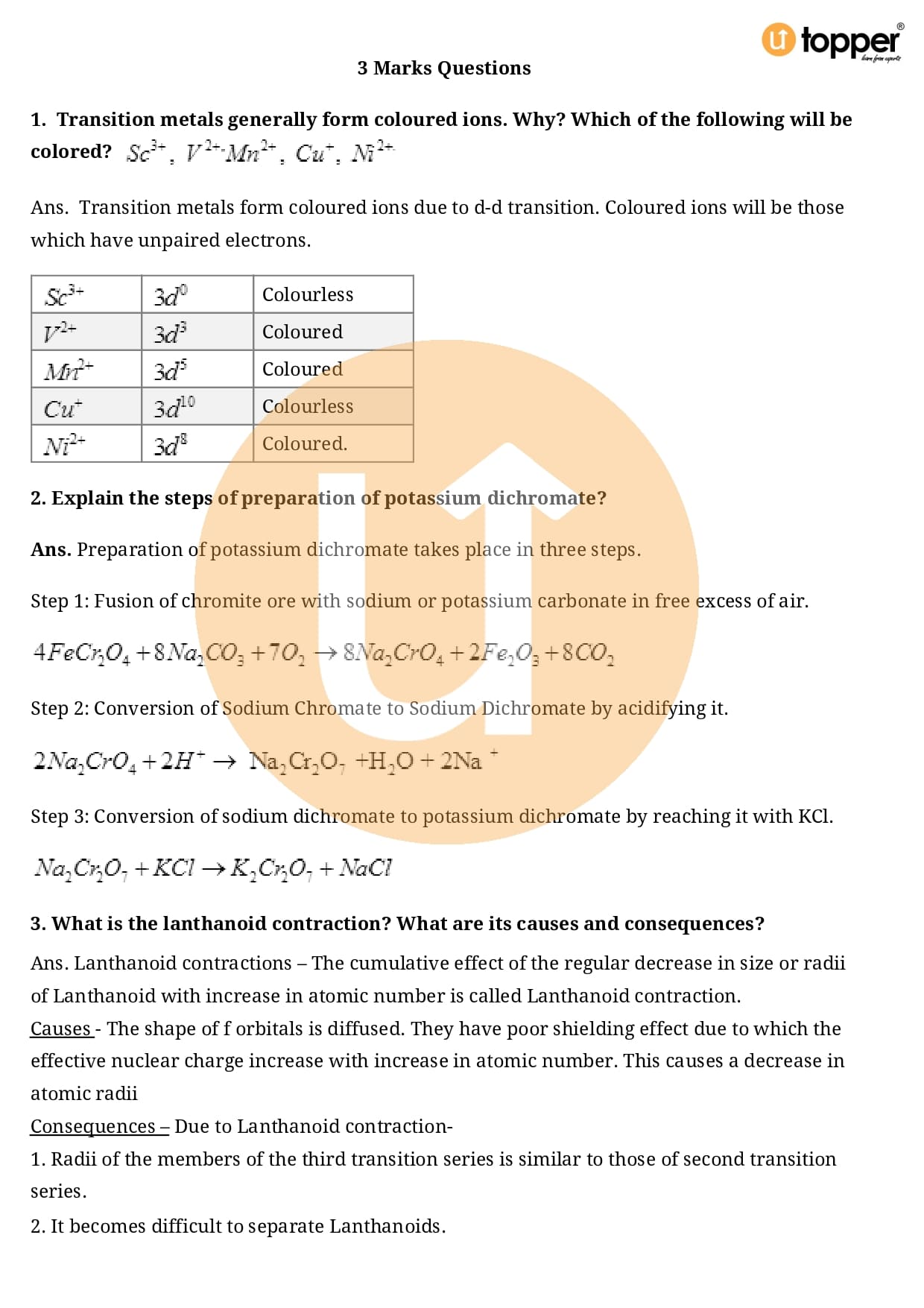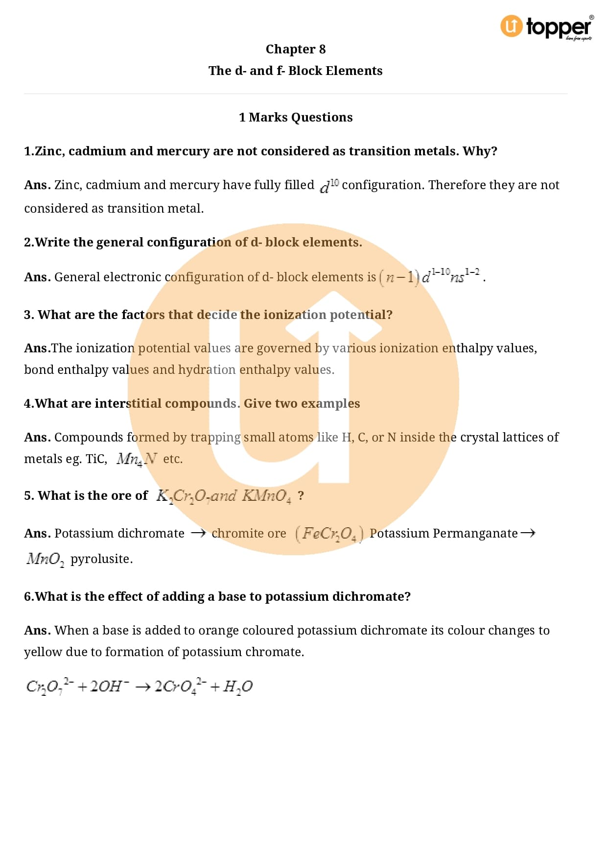 Class 12 Chemistry Important Question CBSE Chapter 8 – The d and f Block Elements