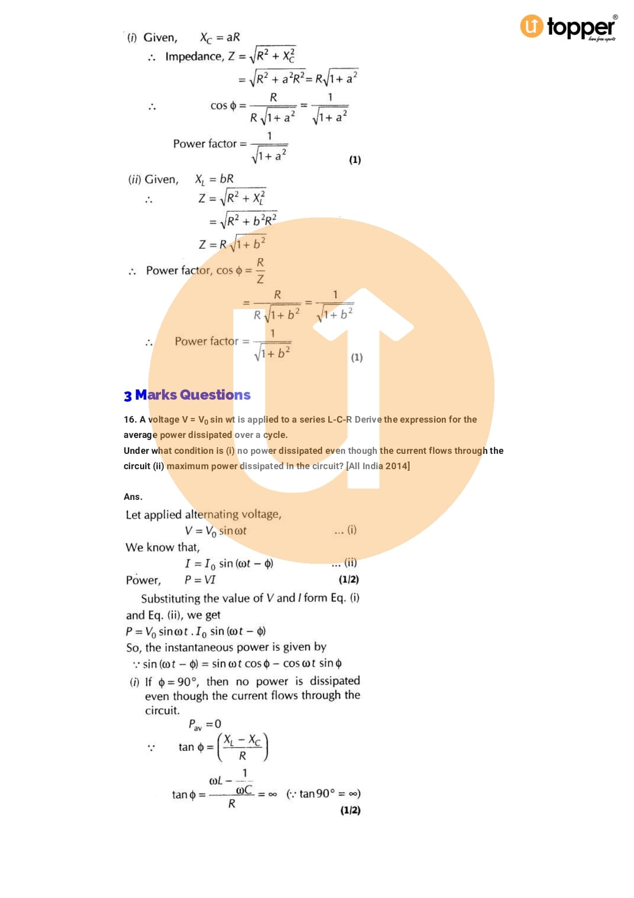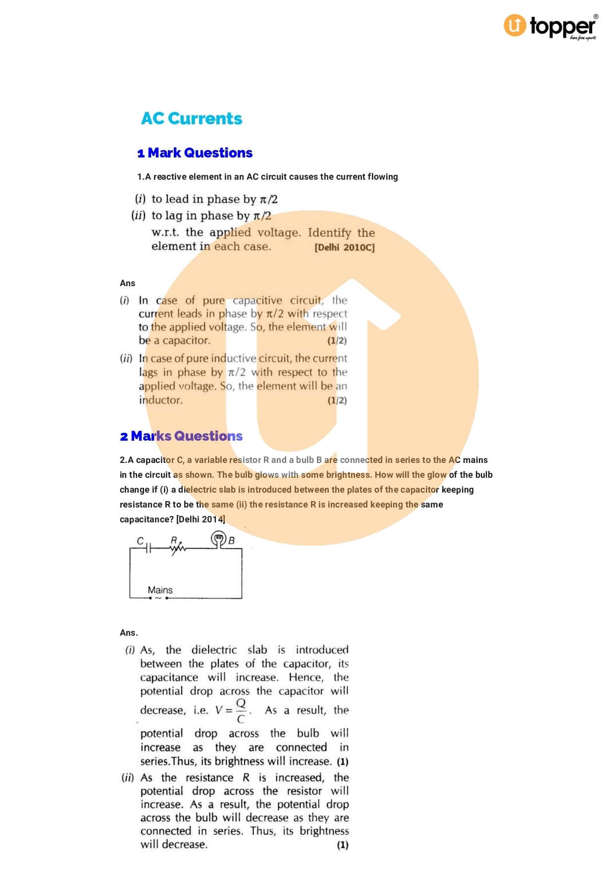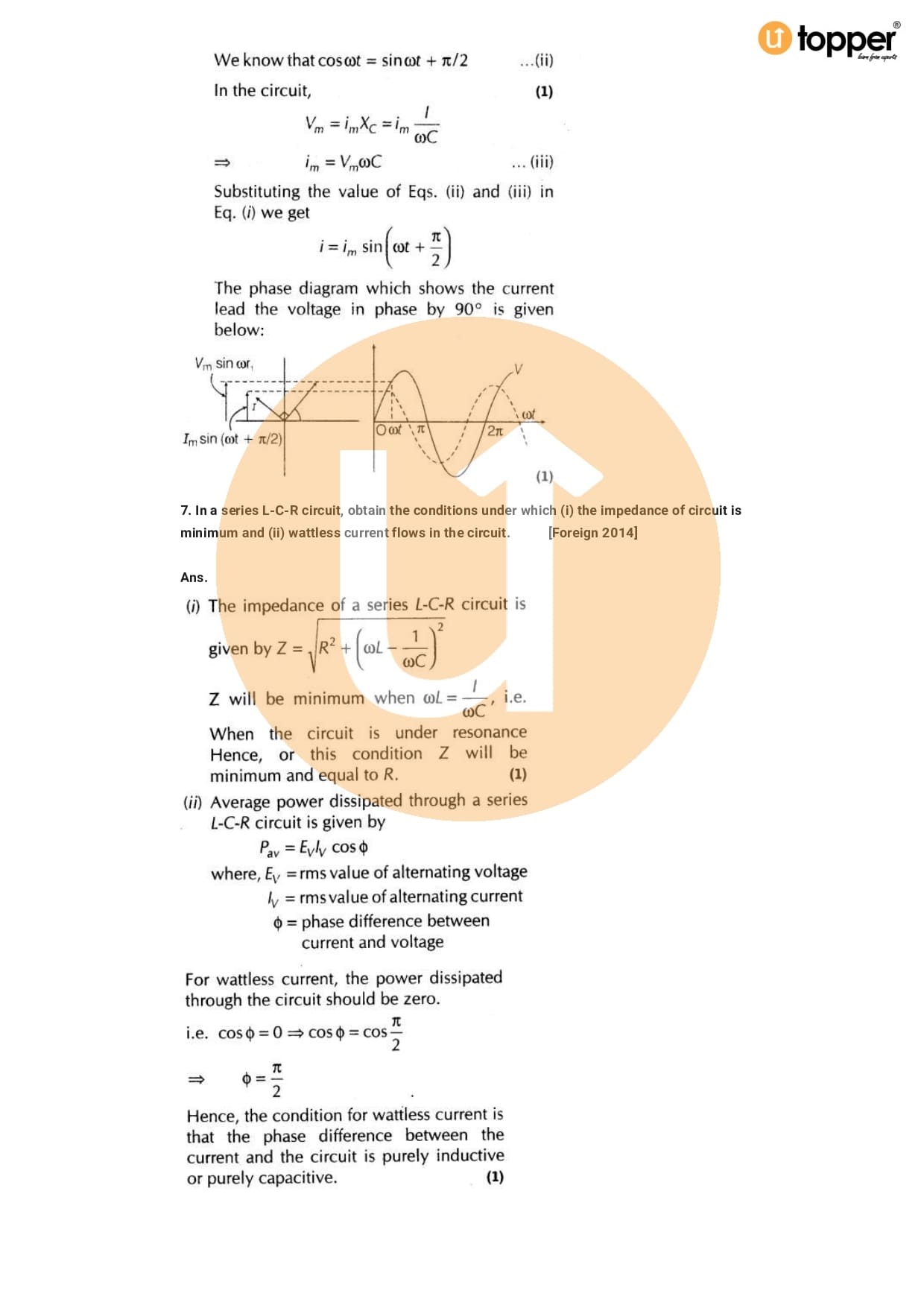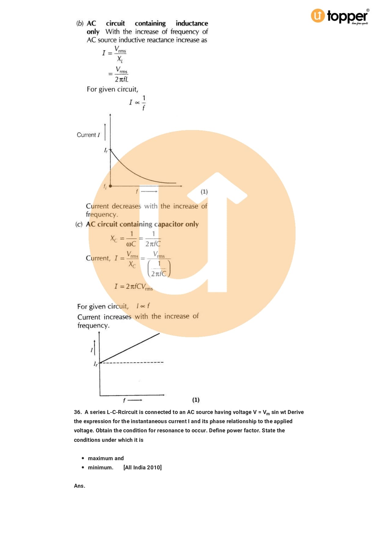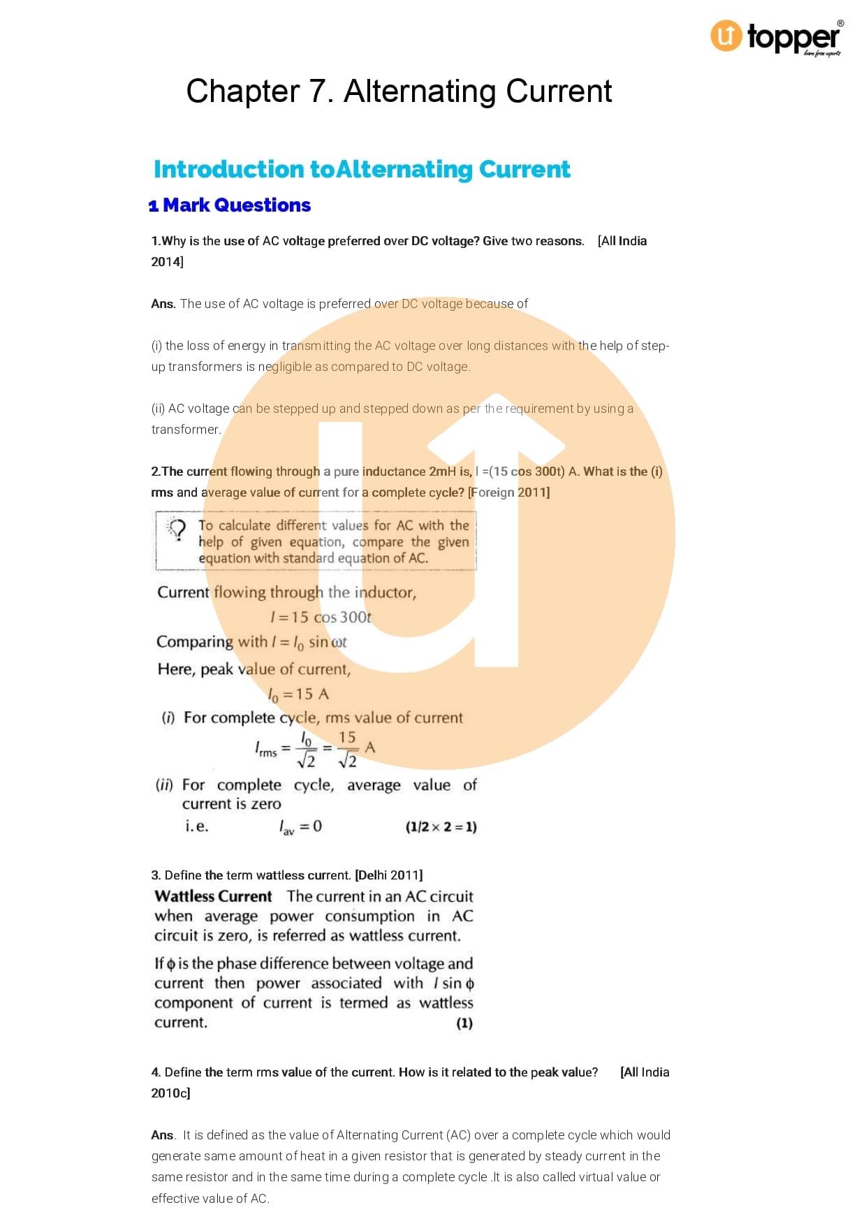 Class 12 Physics Important Question CBSE Chapter 7 – Alternating Current