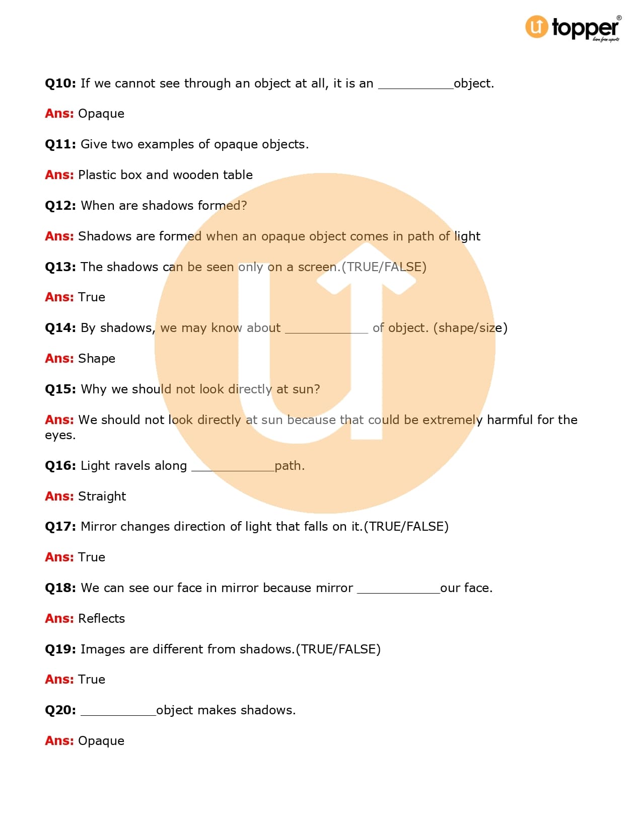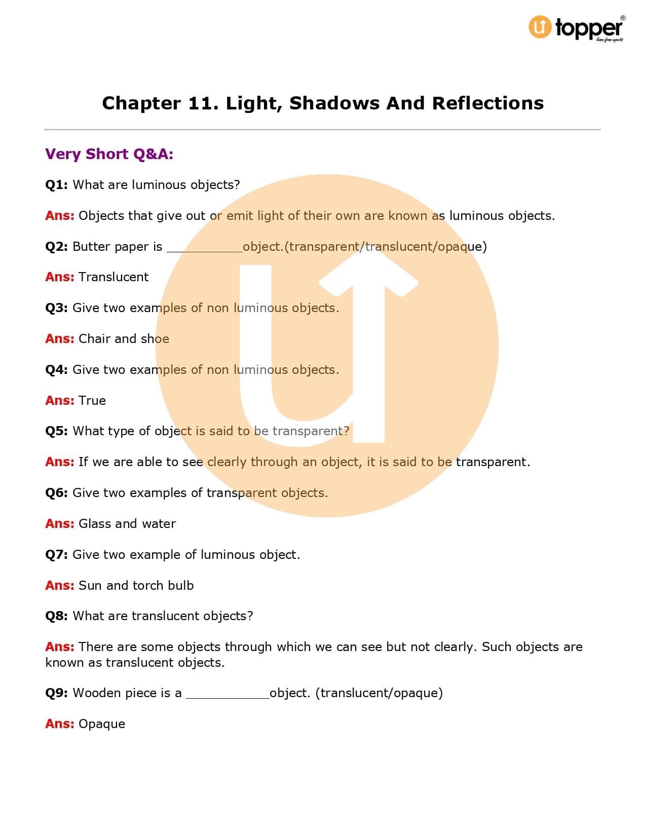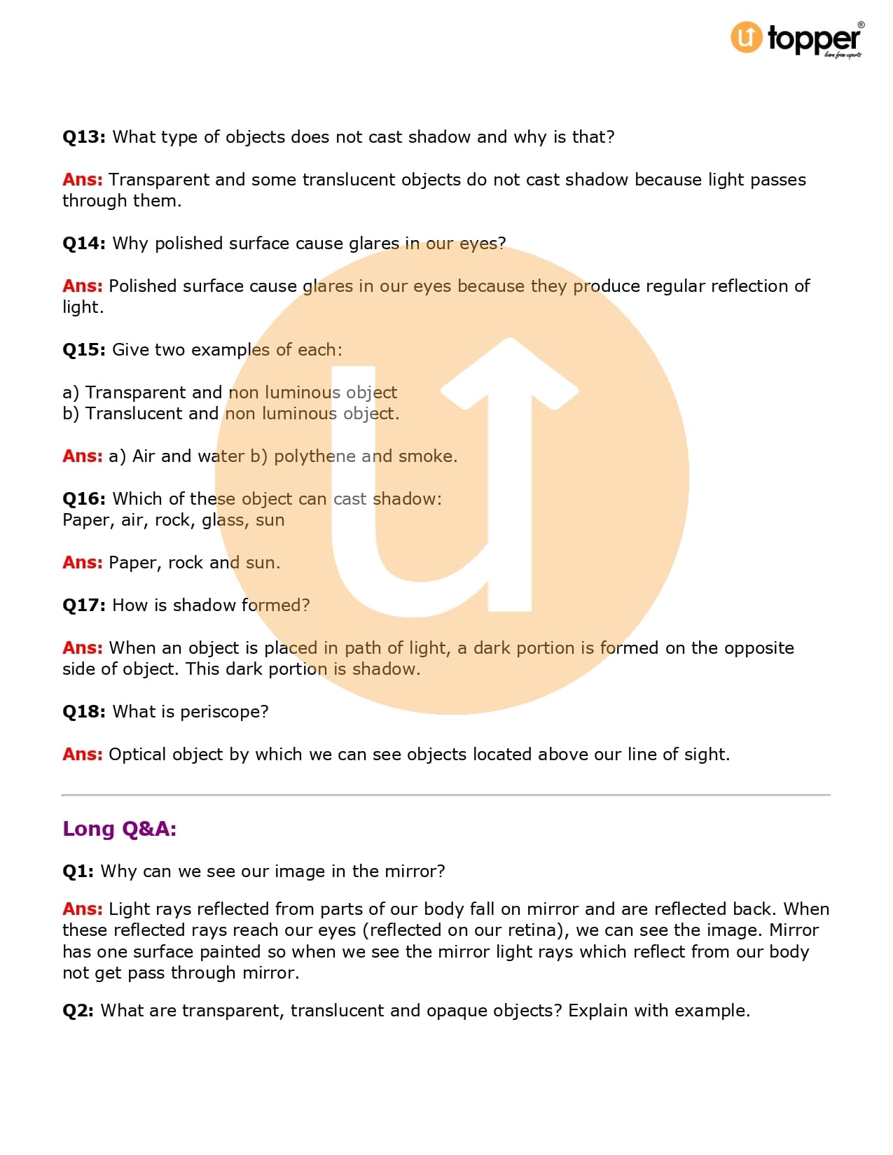 Class 6 Science Important Question CBSE Chapter 11 – Light, Shadows and Reflections