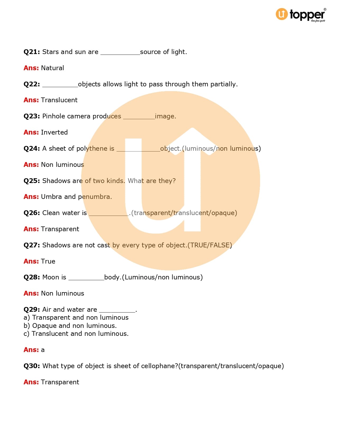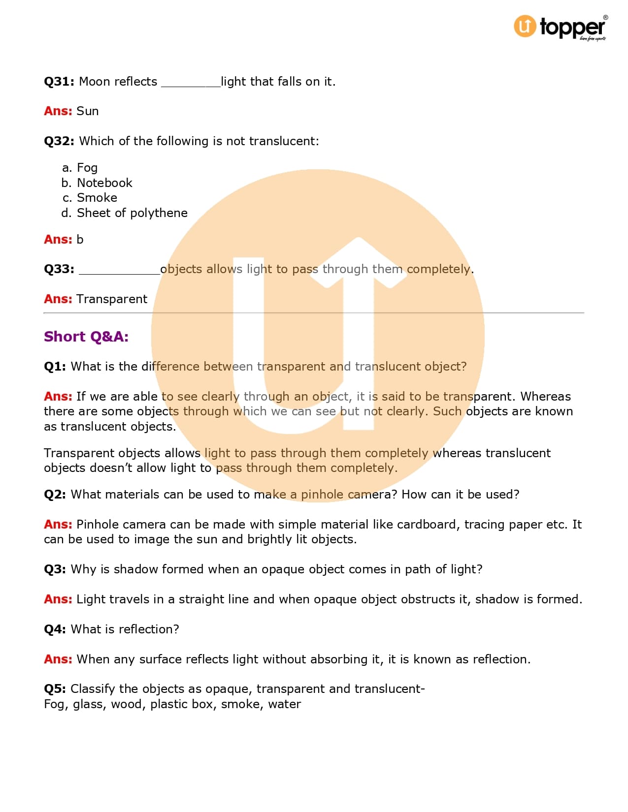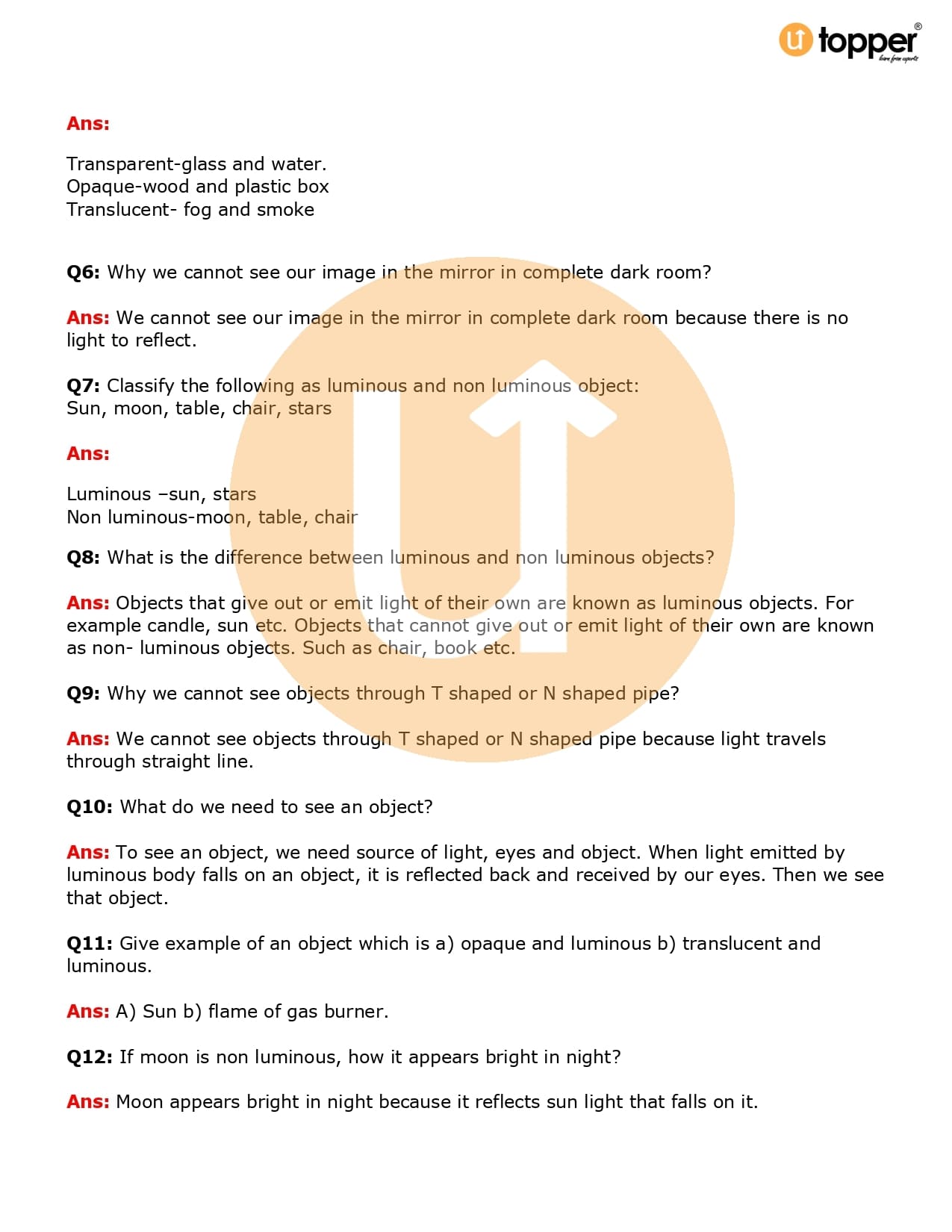 Class 6 Science Important Question CBSE Chapter 11 – Light, Shadows and Reflections
