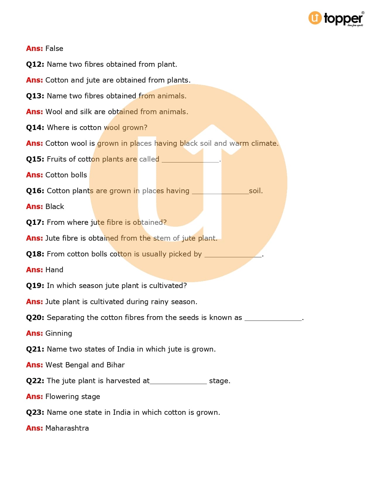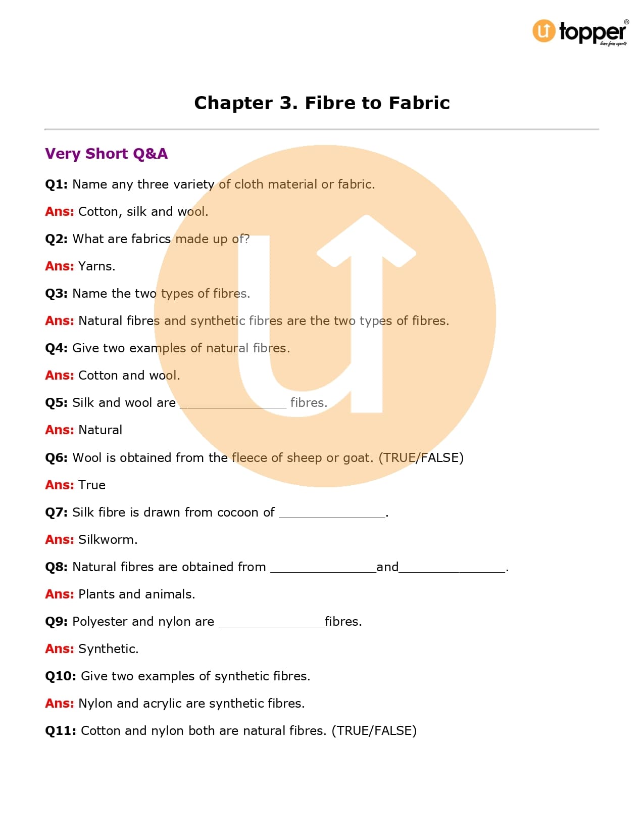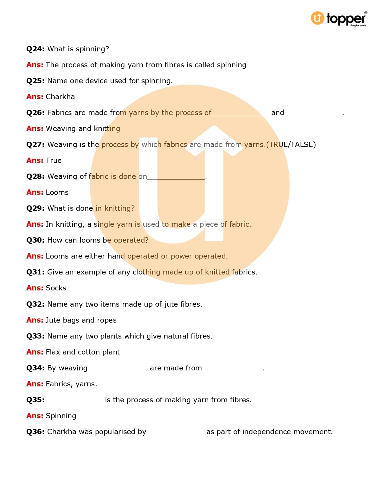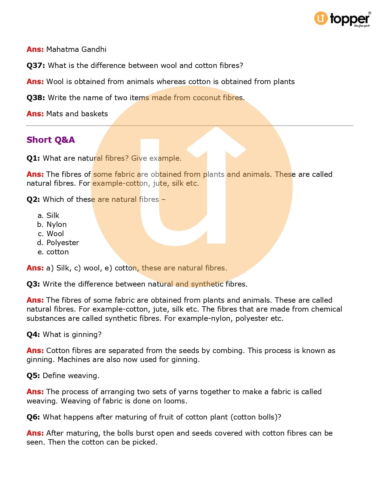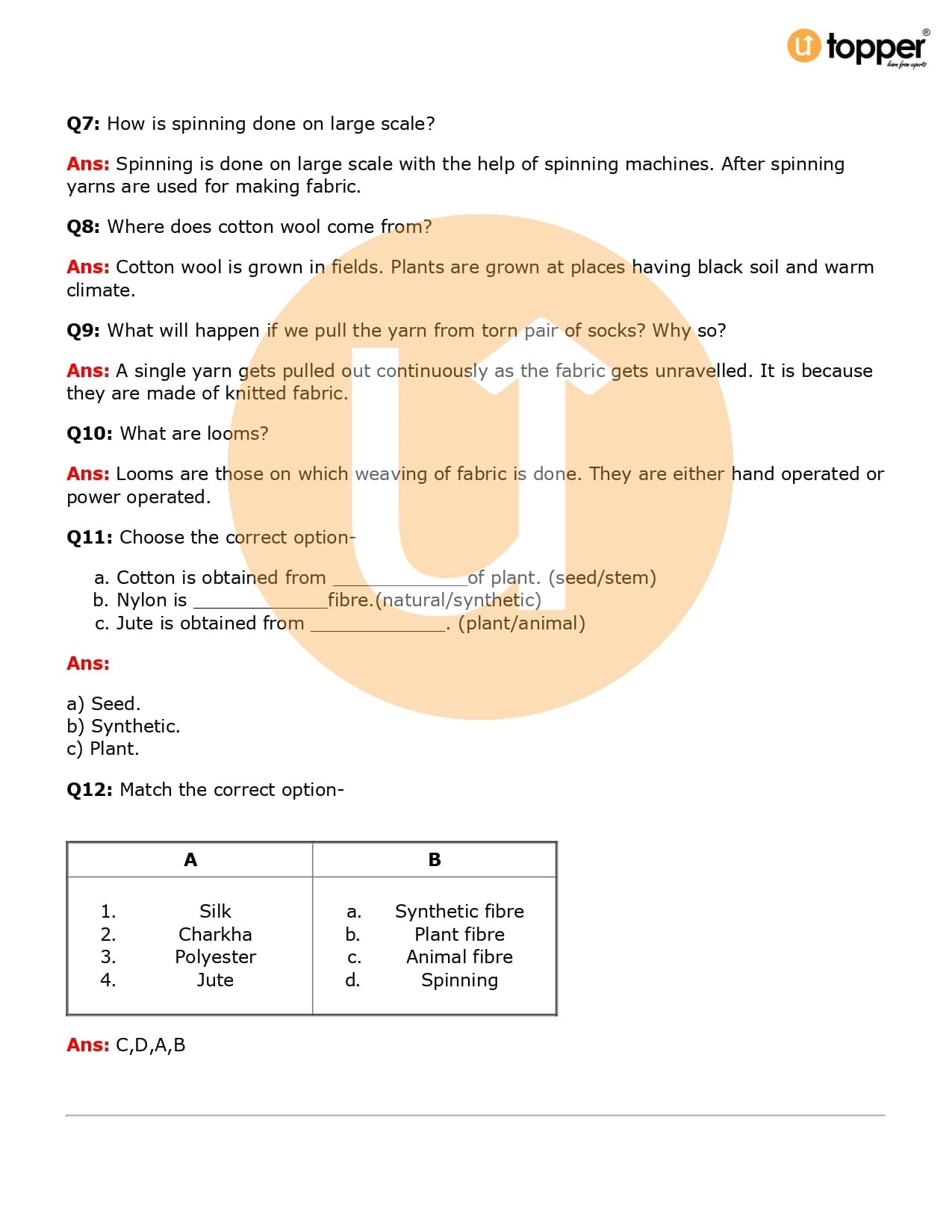 Class 6 Science Important Question CBSE Chapter 3 – Fibre to Fabric