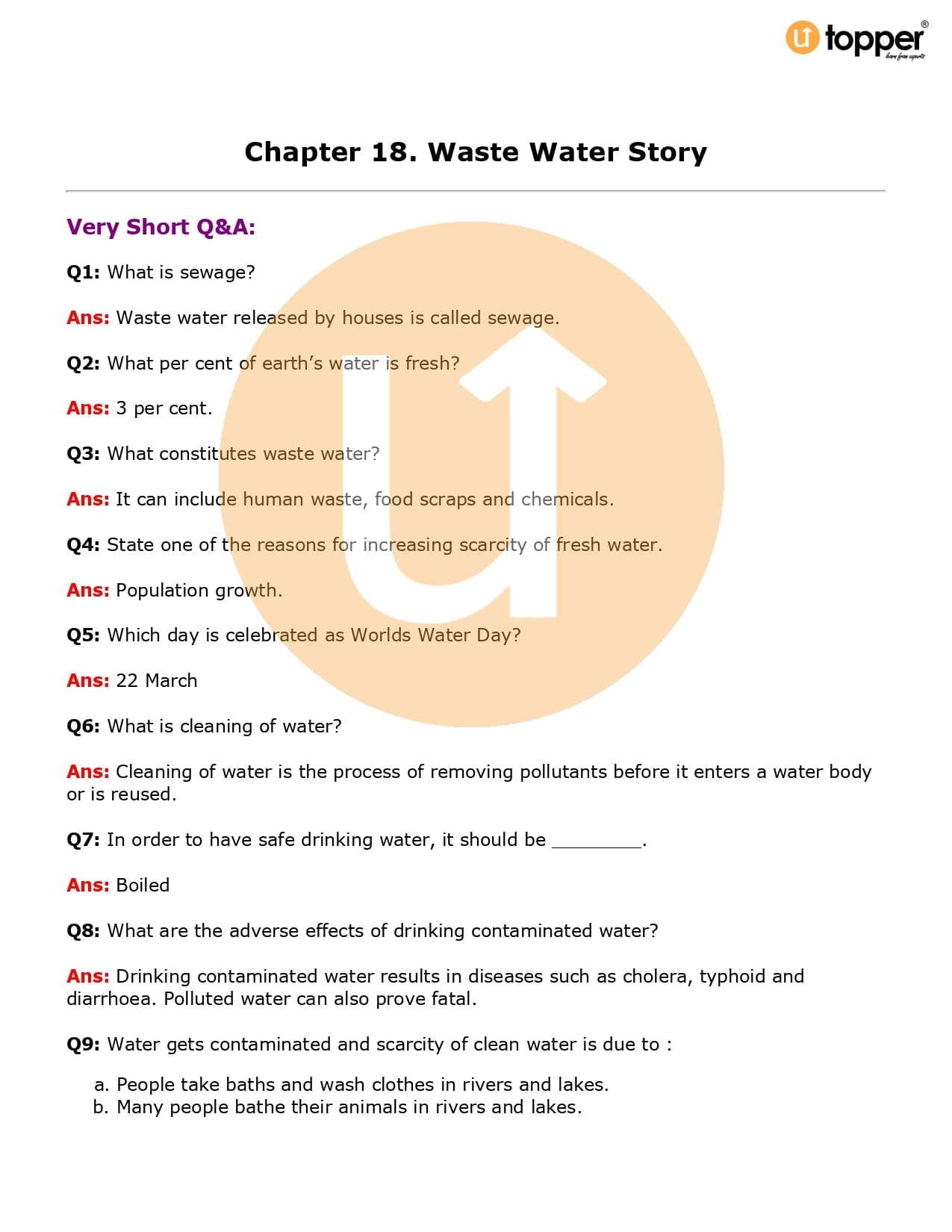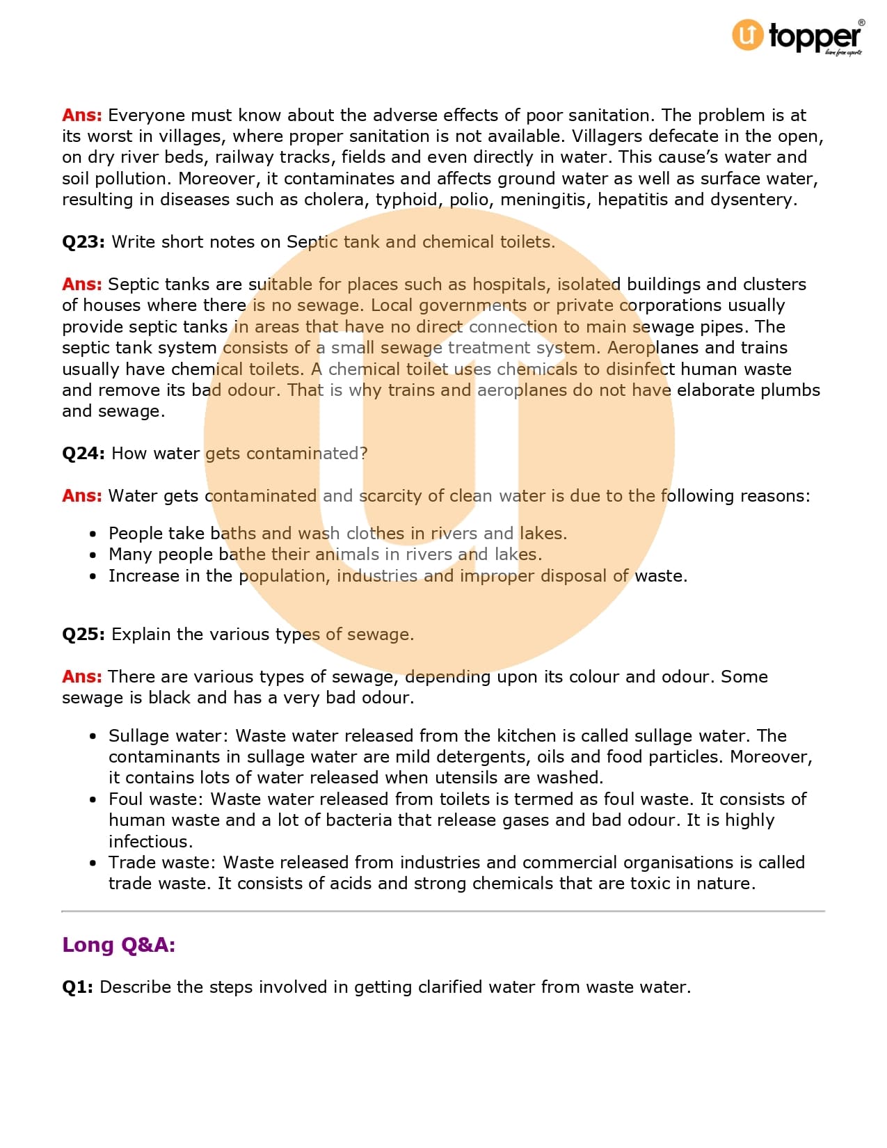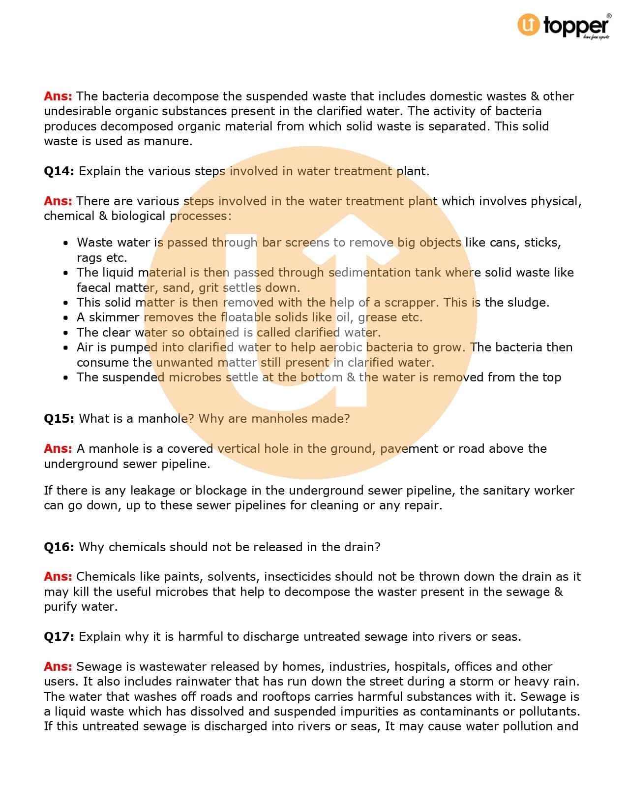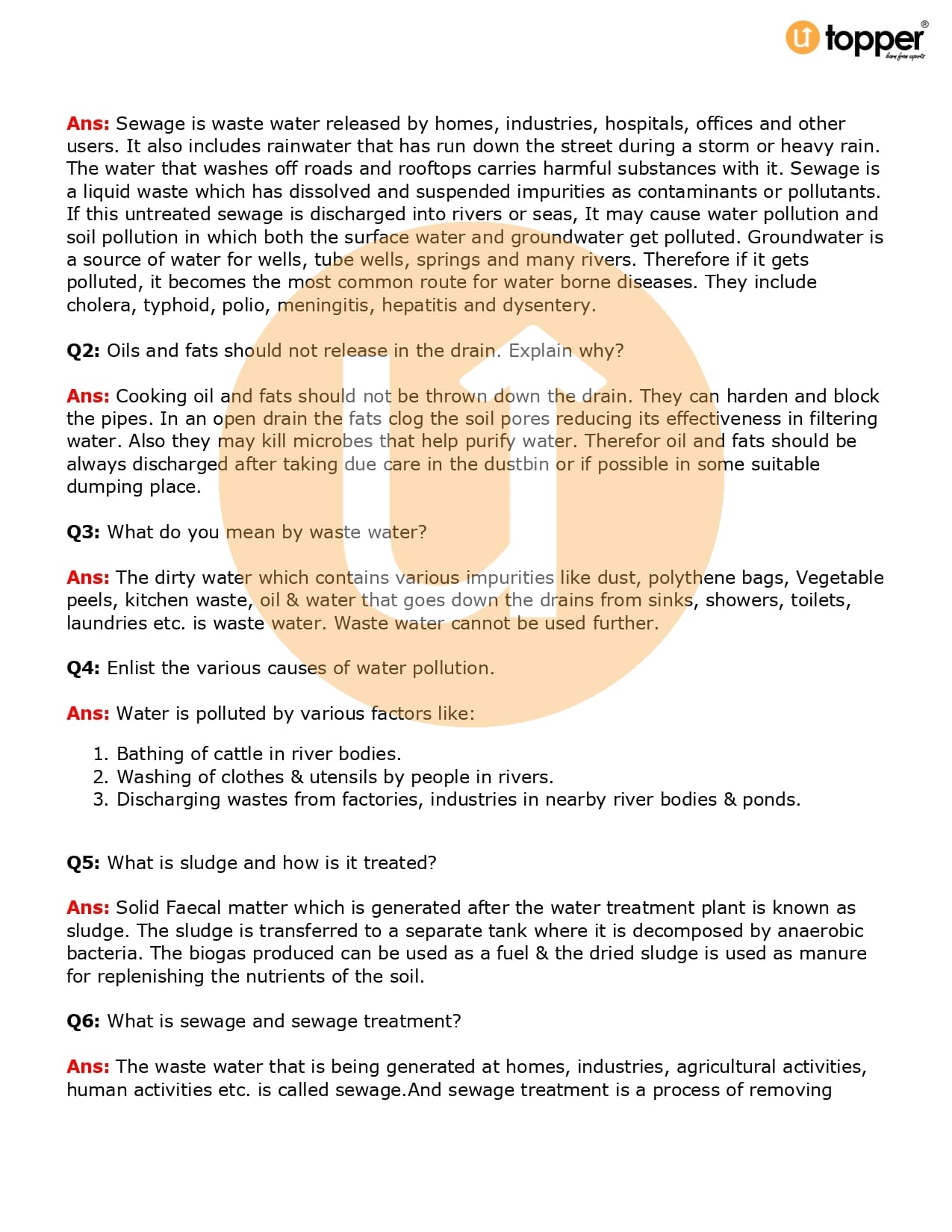 Class 7 Science Important Question CBSE Chapter 18 – Wastewater Story