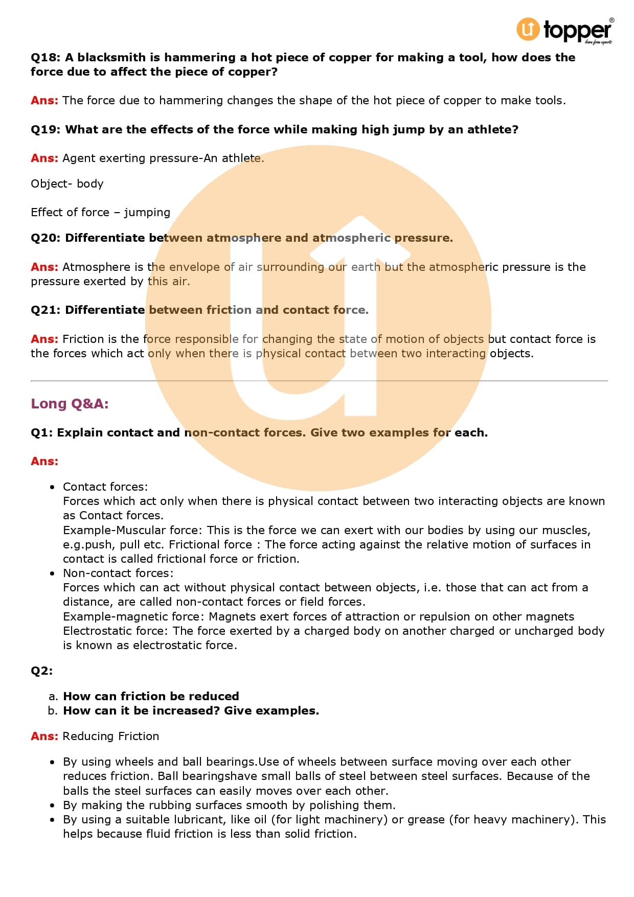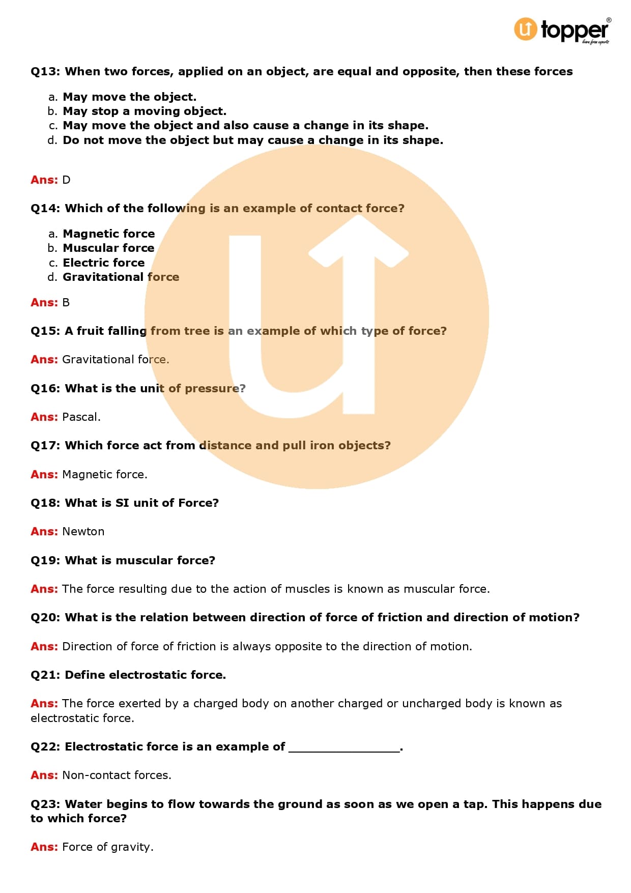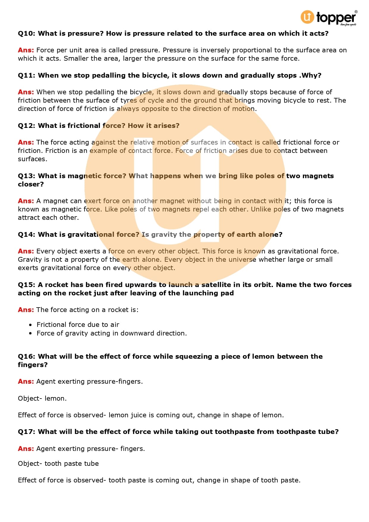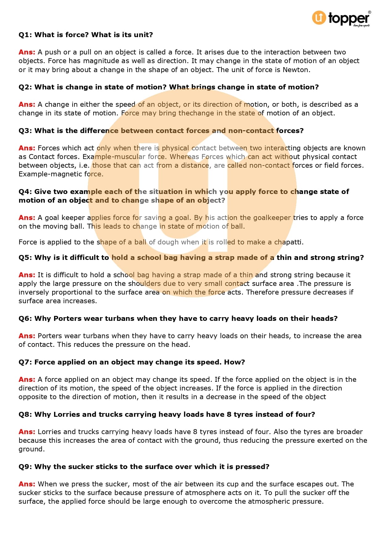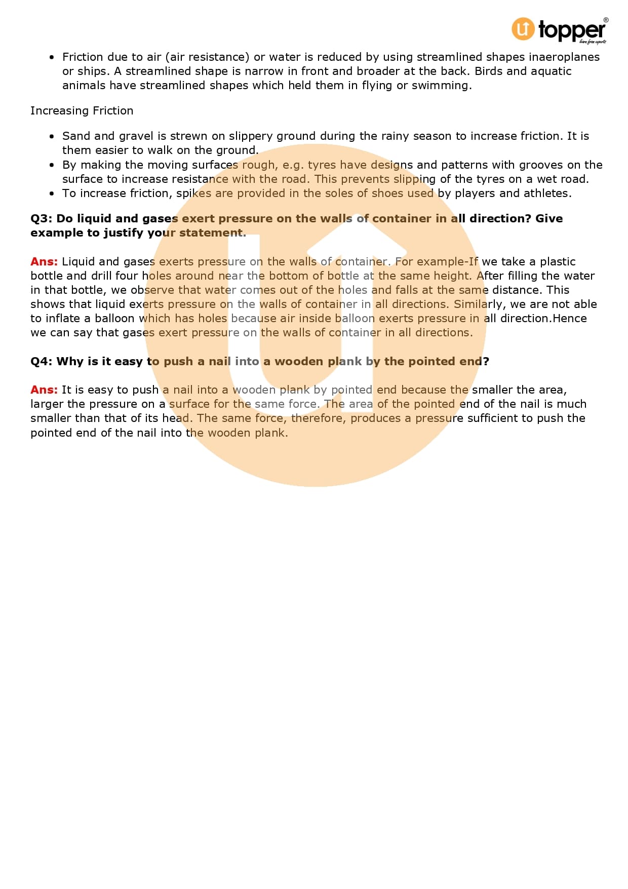 Class 8 Science Important Question CBSE Chapter 11 – Force and Pressure