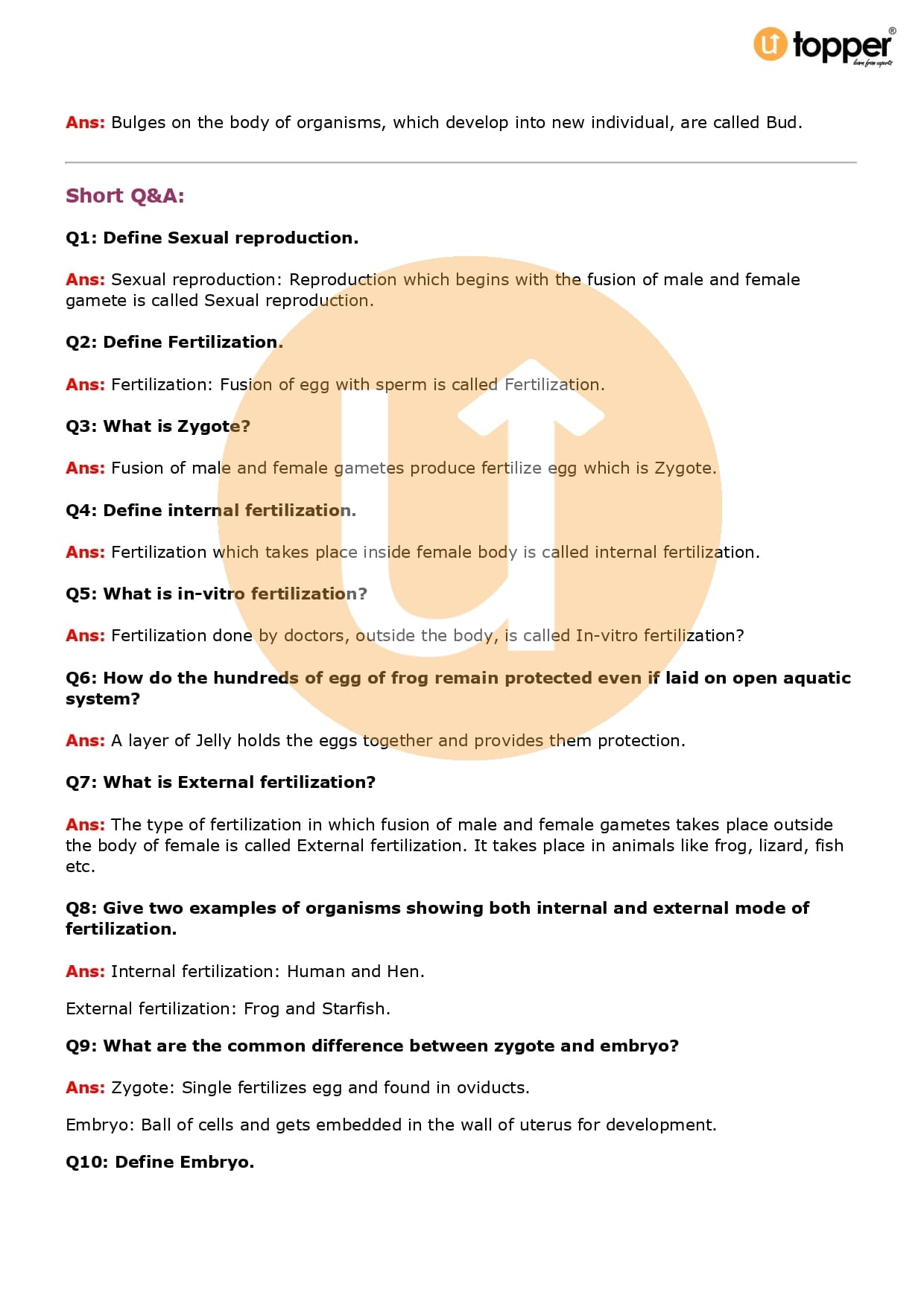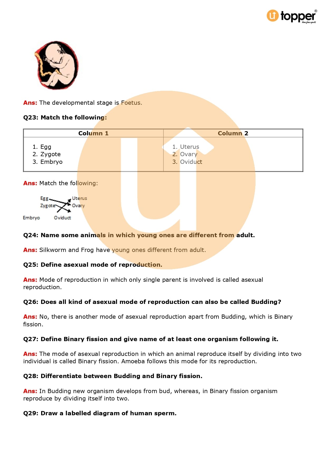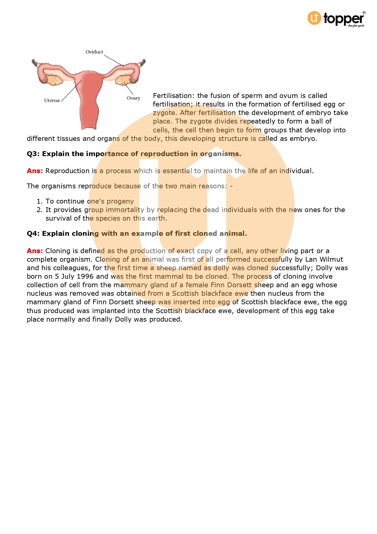 Class 8 Science Important Question CBSE Chapter 9 – Reproduction in Animals