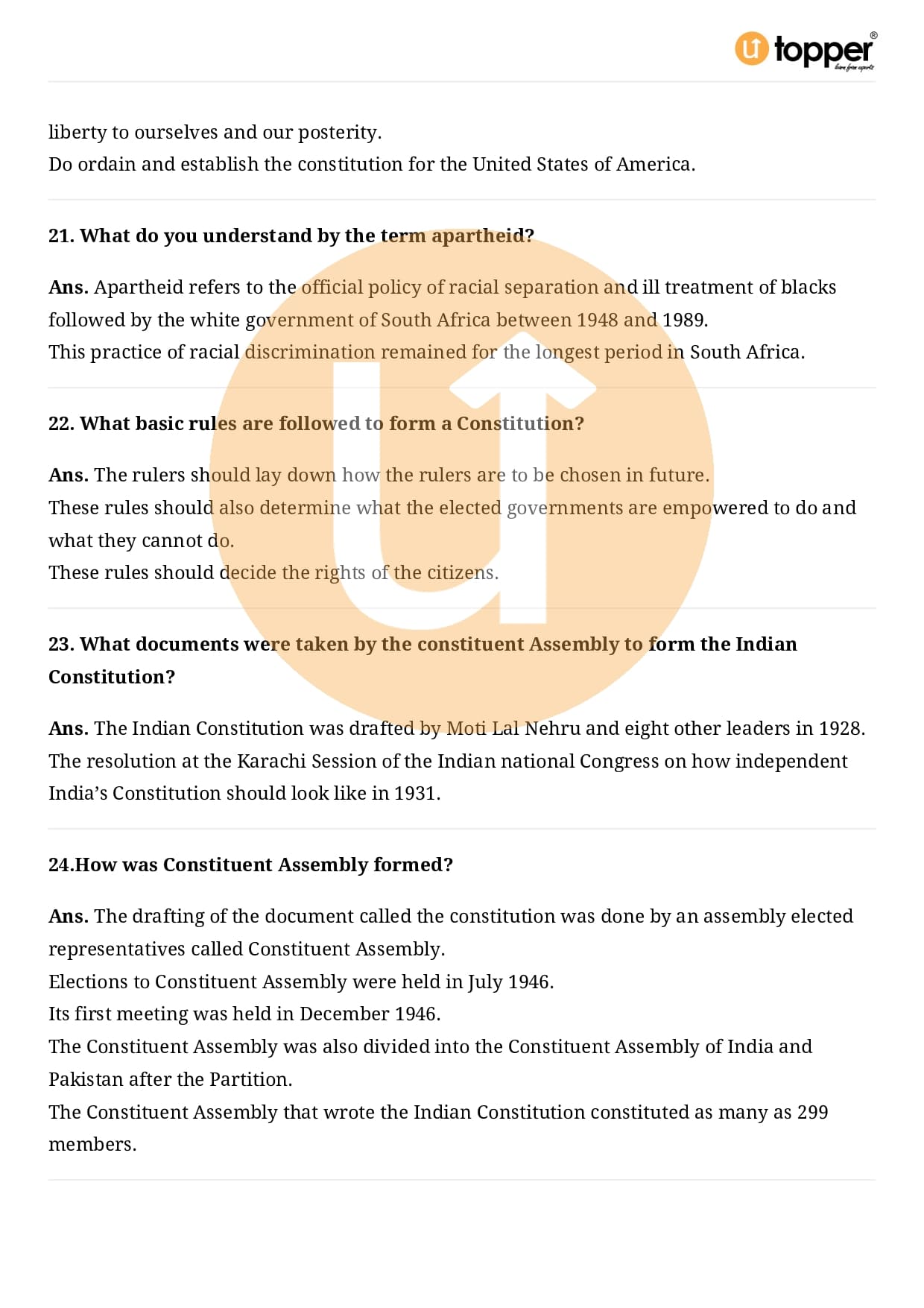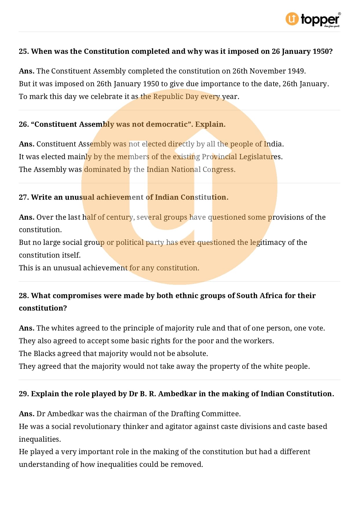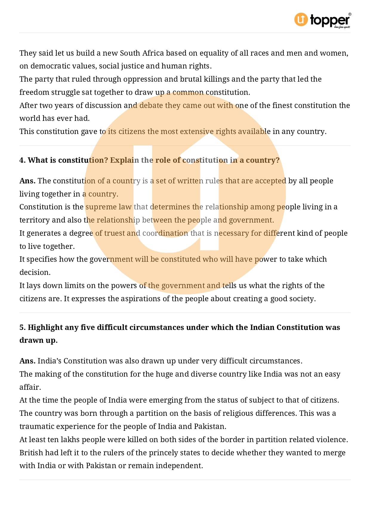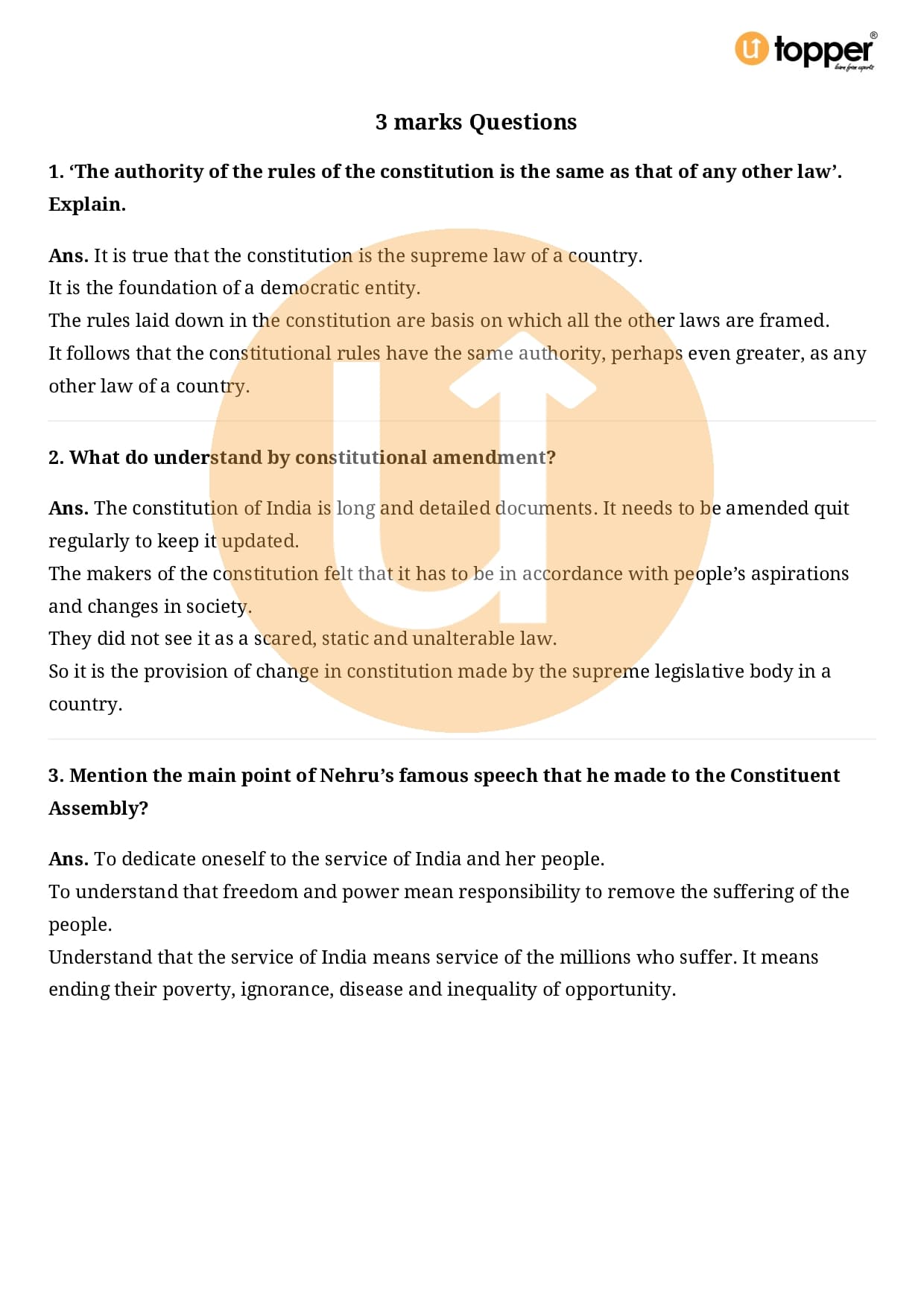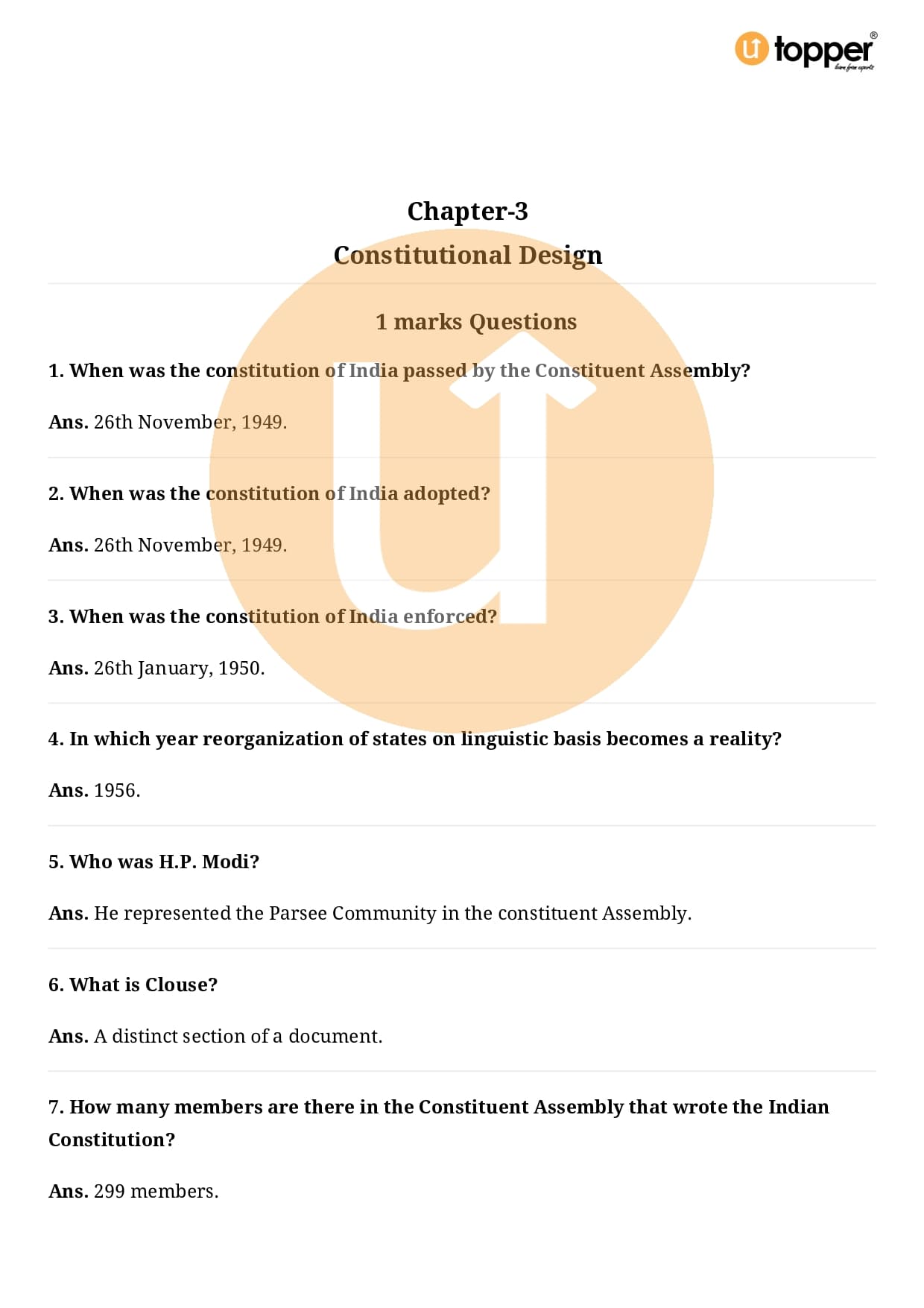 Class 9 Civics Important Question CBSE Chapter 3 – Constitutional Design