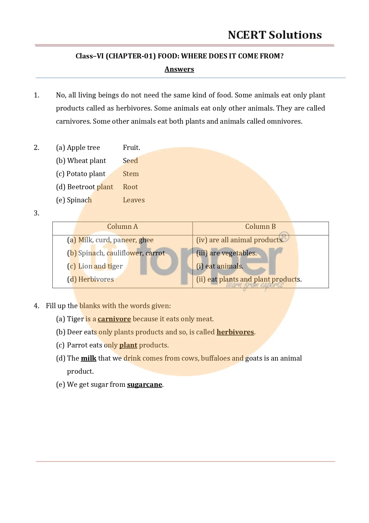 Ncert Solutions Class 6 Science Chapter 1 Food: Where does it come from? were made by Utopper’s Science teachers with a lot of experience for Class 6 students: This chapter discusses Food Variety, Food Materials and Sources, Plant Parts and Animal Products as Food, and What Animals Eat. There are exercises covering each of these areas.