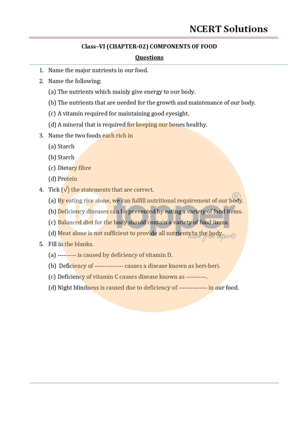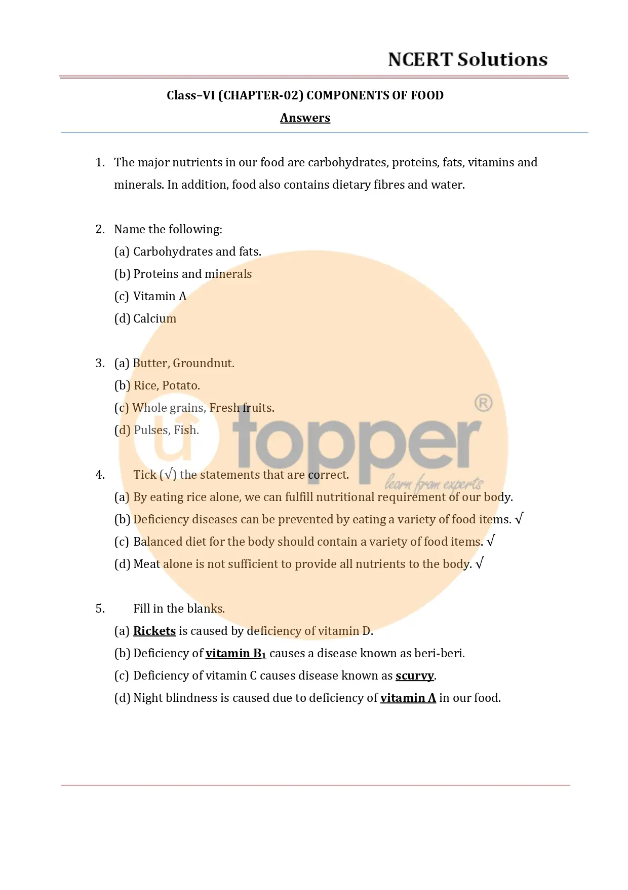 NCERT Solutions for Class 6 Science Chapter 2 Components of Food presents information about major nutrients in our food which include carbohydrates, proteins, fats, vitamins and minerals, and many more. These Utopper’s Ncert Solutions help students who want to get good grades on exams. Class 6 Ncert Solutions have been provided by the most knowledgeable teachers. When solving the questions and creating the NCERT solutions for class 6 Science, a very straightforward method was used. Students will find it very simple to comprehend the problems and how to solve them.