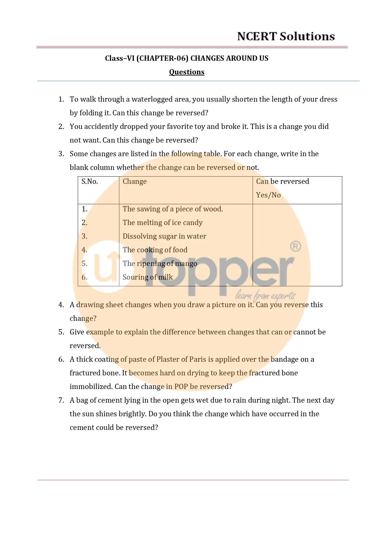 This part of the NCERT Solutions for Class 6 Science chapter 6 is about whether or not a change can be undone.