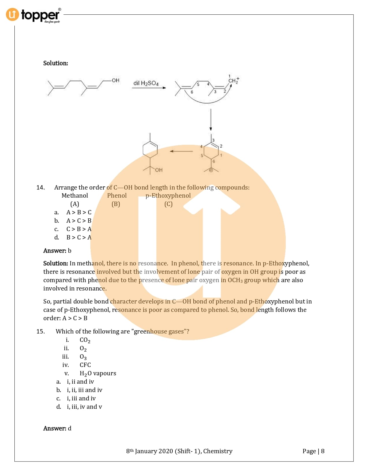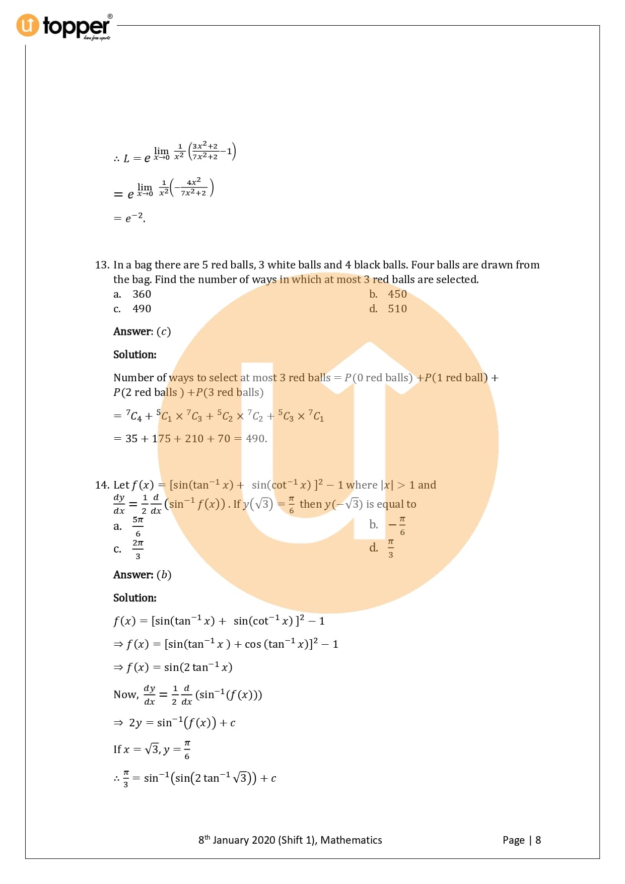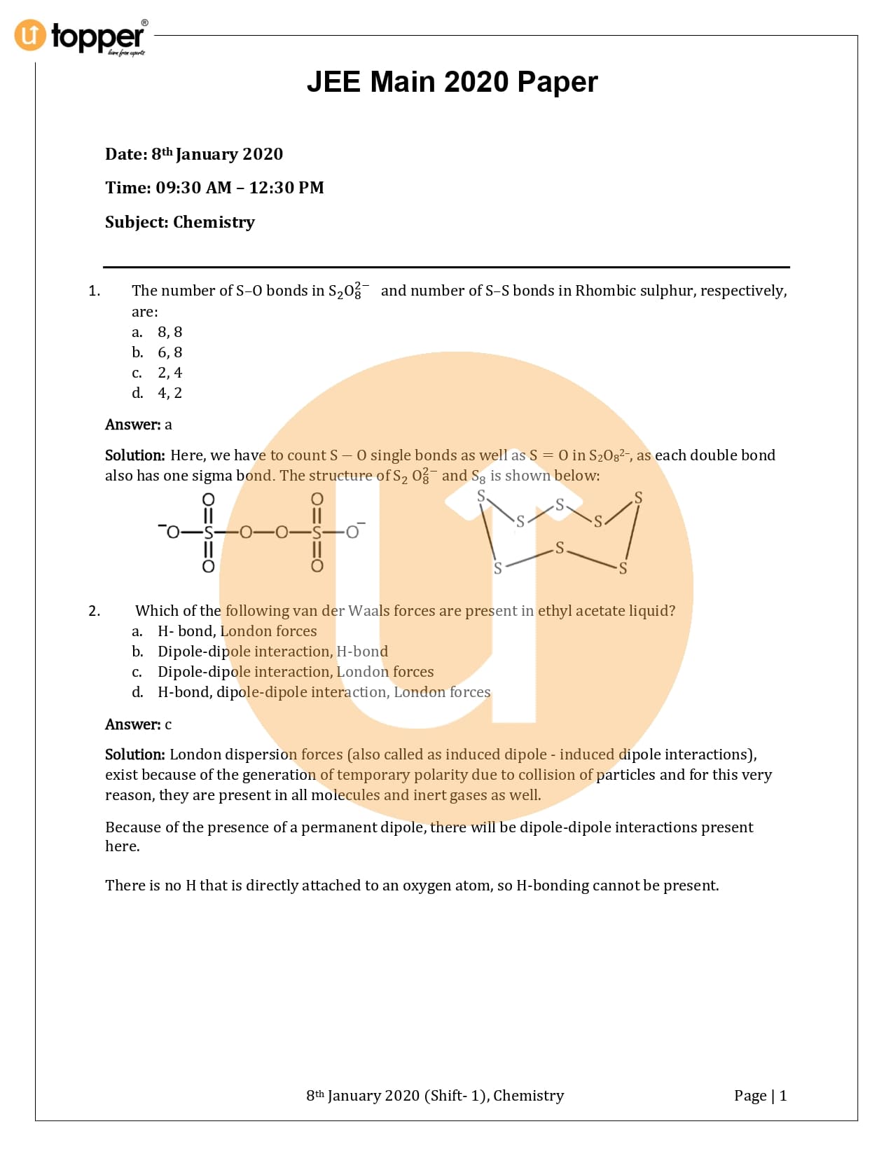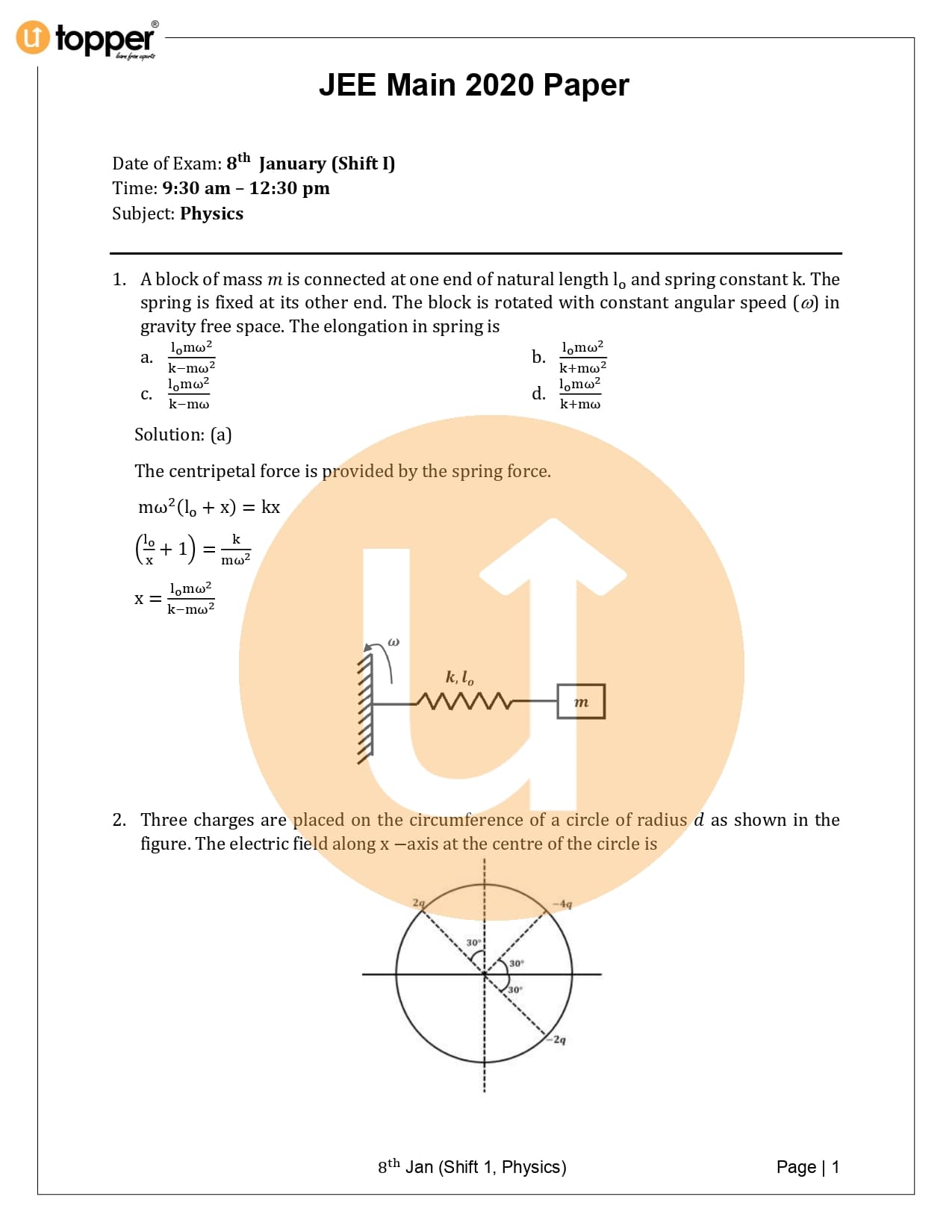 JEE Main 2020 Previous Year Question Paper with Solution 1st Shift (8 January Morning)