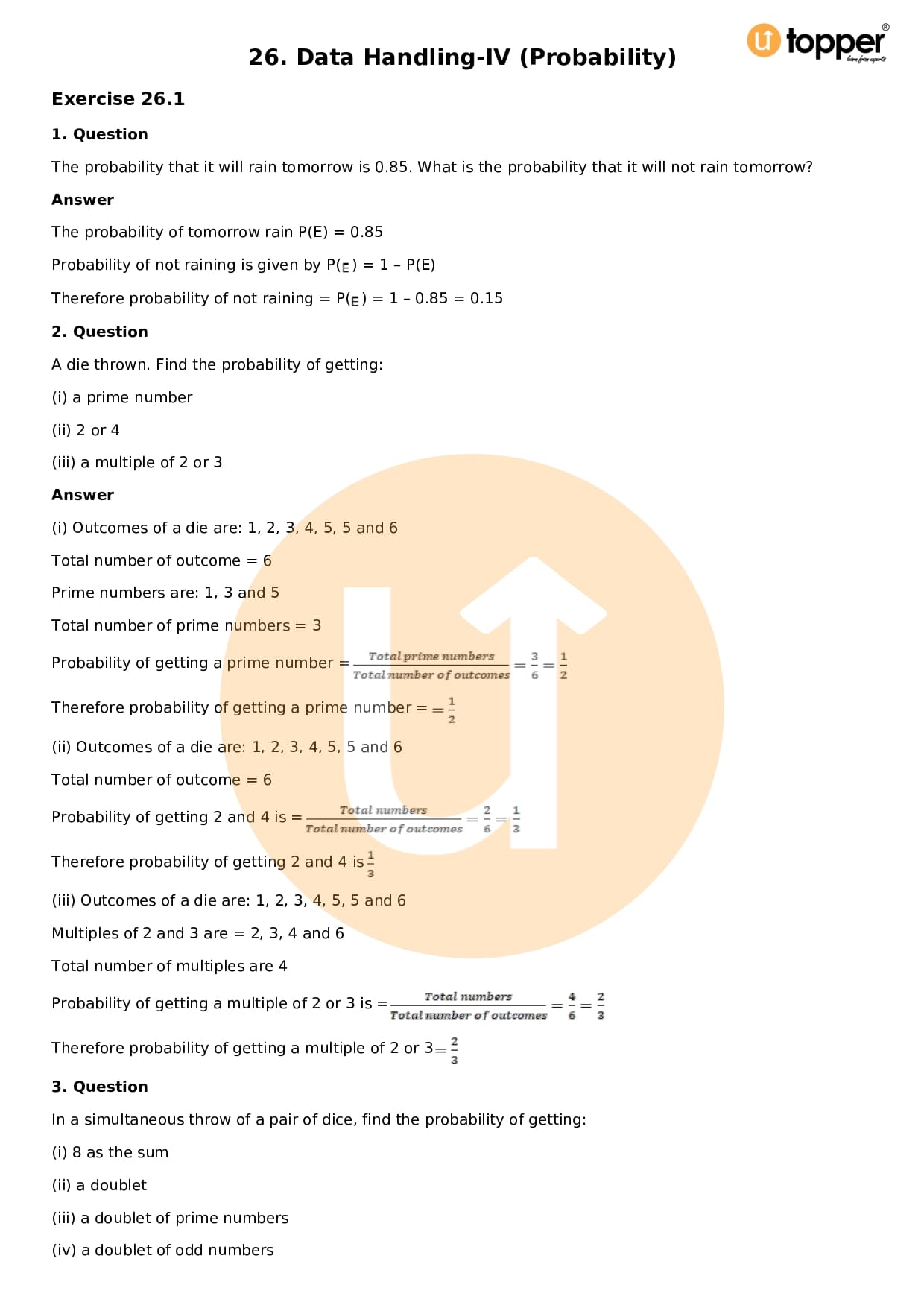 Download the latest version of RD Sharma Solutions for Class 8 Maths Chapter 26 Data Handling IV (probability) PDF at Utopper. It provides step by step Solution PDF. You can download RD Sharma Maths Solutions with a free PDF download option, which includes chapter wise solutions. All the questions in RD Sharma Solutions have been solved and explained by expert mathematics teachers as per the CBSE Board guidelines. By studying these Maths Solutions, you can easily get good marks in the CBSE board exams.