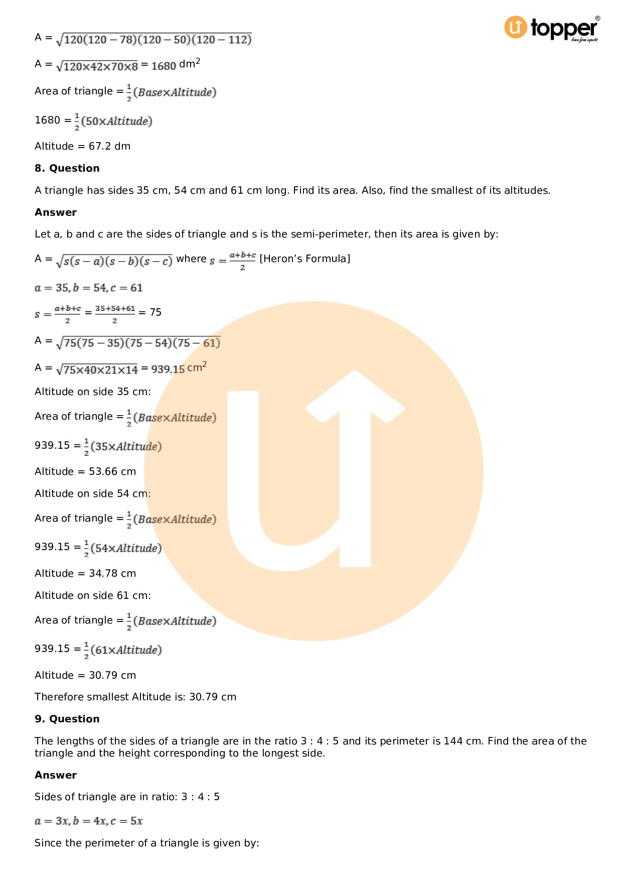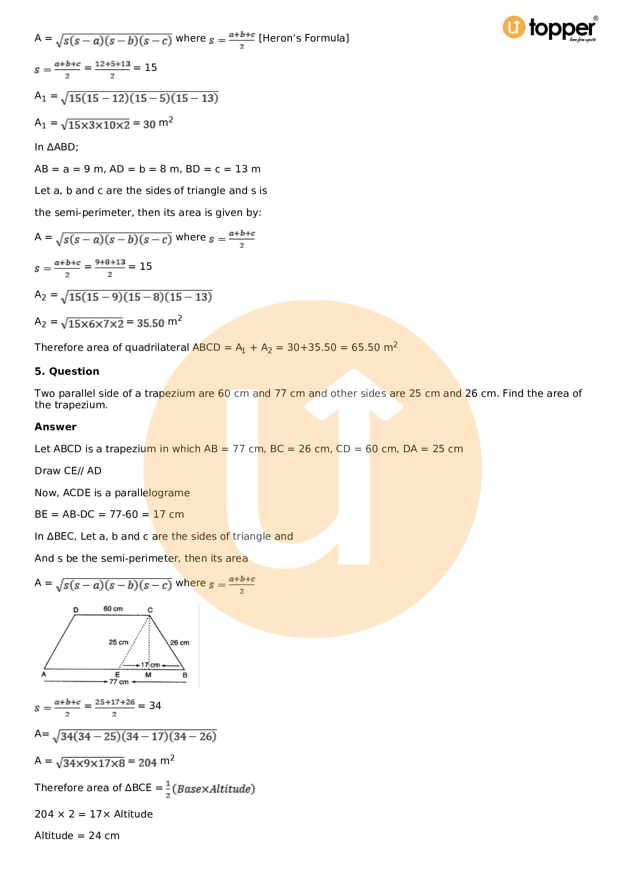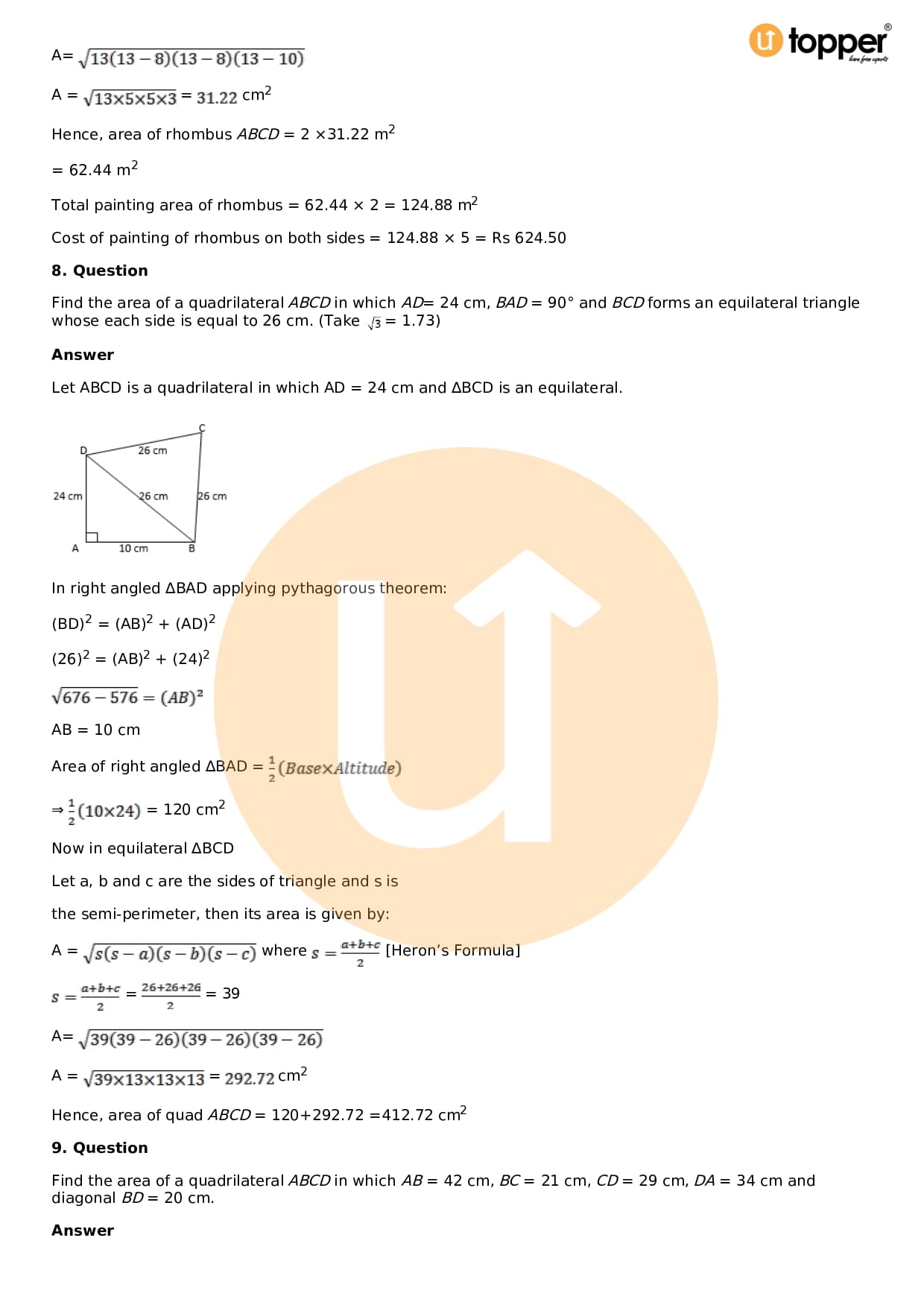 Download the latest version of RD Sharma Solutions for Class 9 Maths Chapter 12 Heron’s Formula PDF at Utopper. It provides step by step Solution PDF. You can download RD Sharma Maths Solutions with a free PDF download option, which includes chapter wise solutions. All the questions in RD Sharma Solutions have been solved and explained by expert mathematics teachers as per the CBSE Board guidelines. By studying these Maths Solutions, you can easily get good marks in the CBSE board exams.