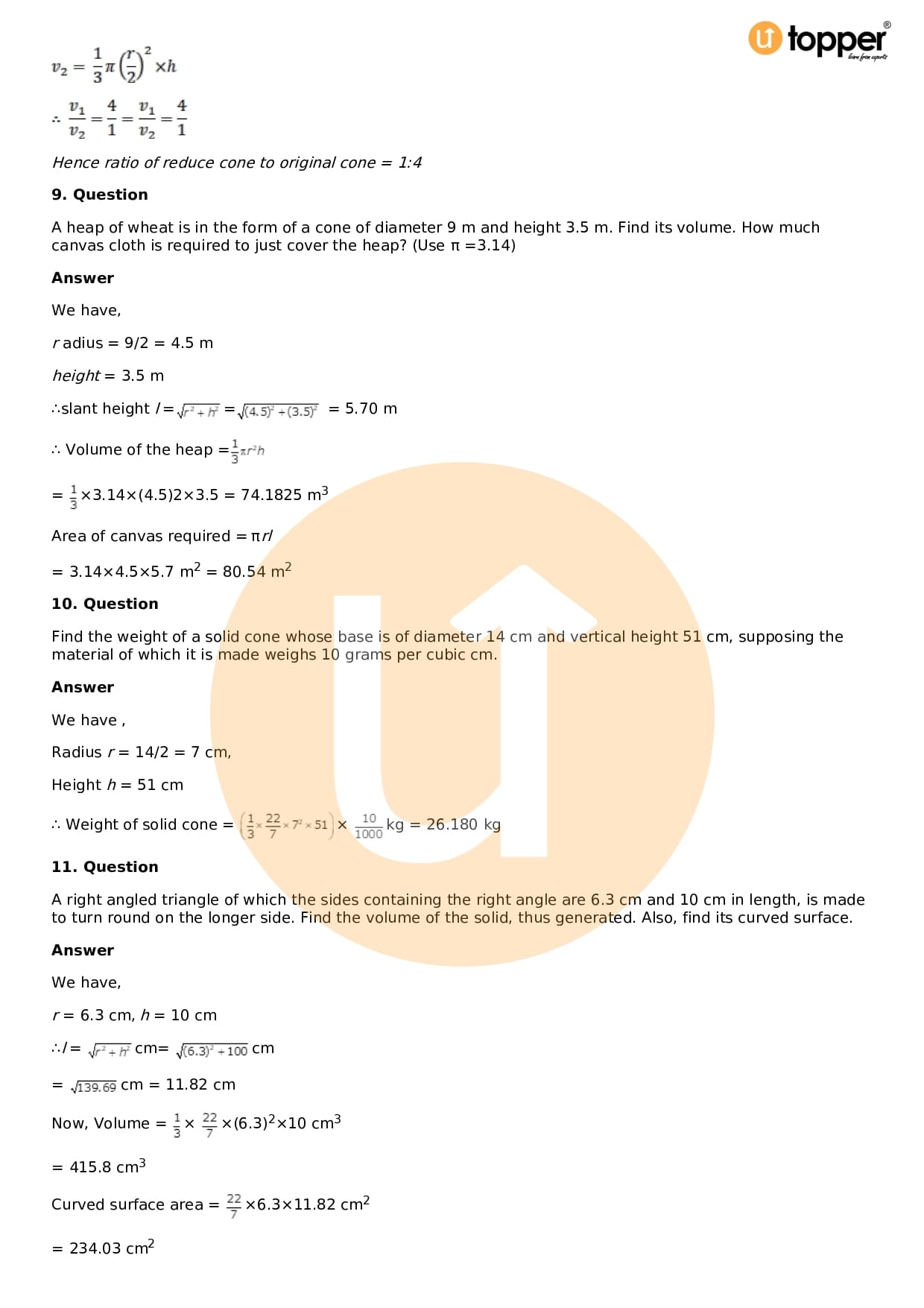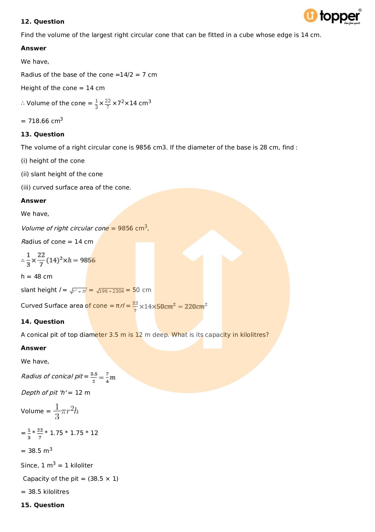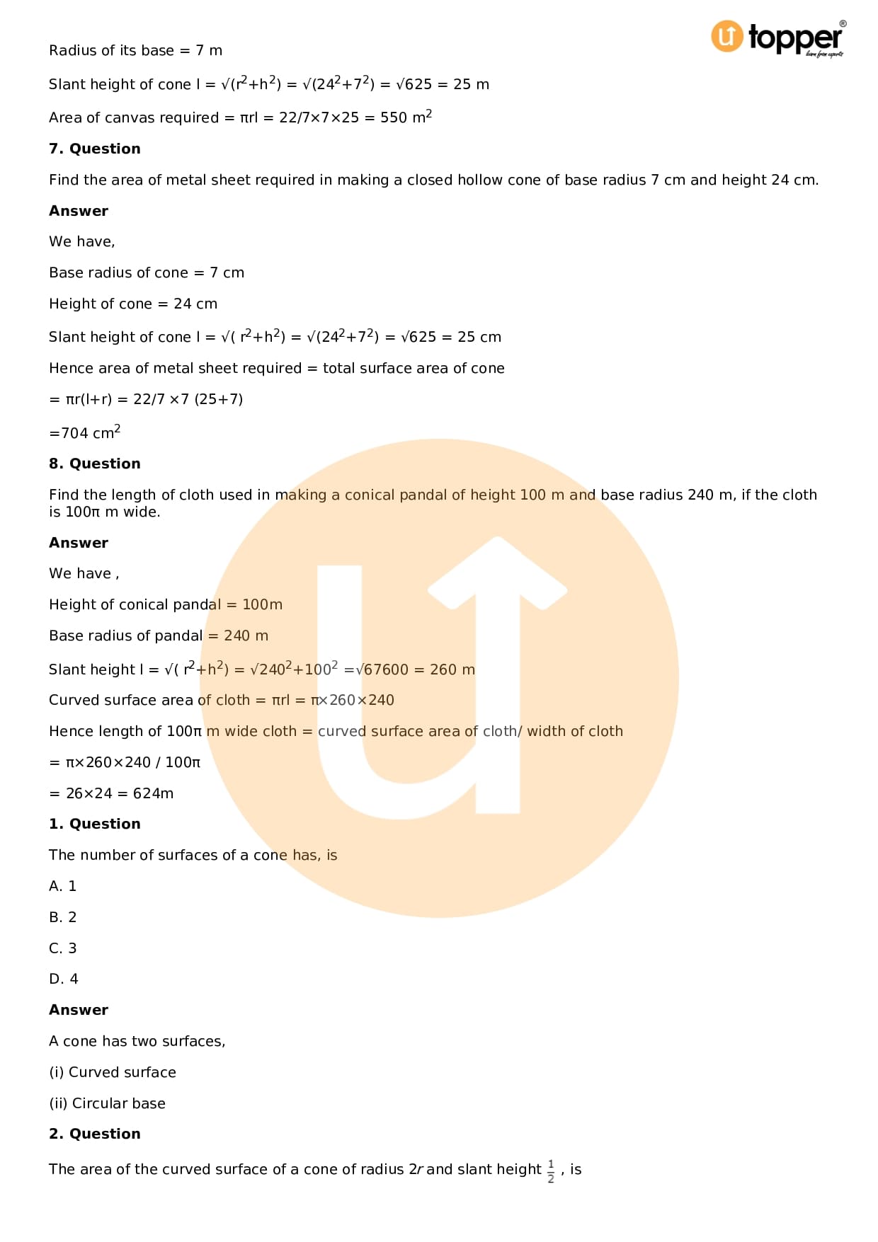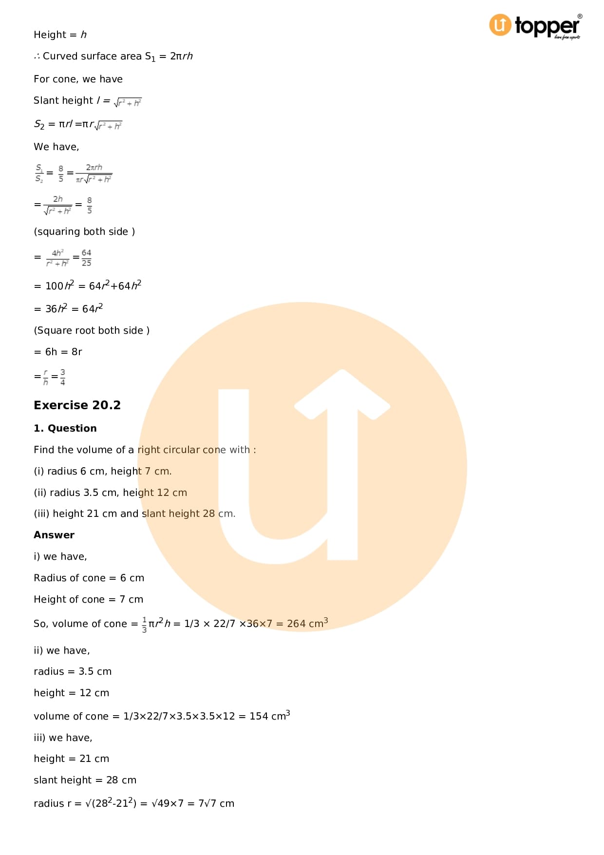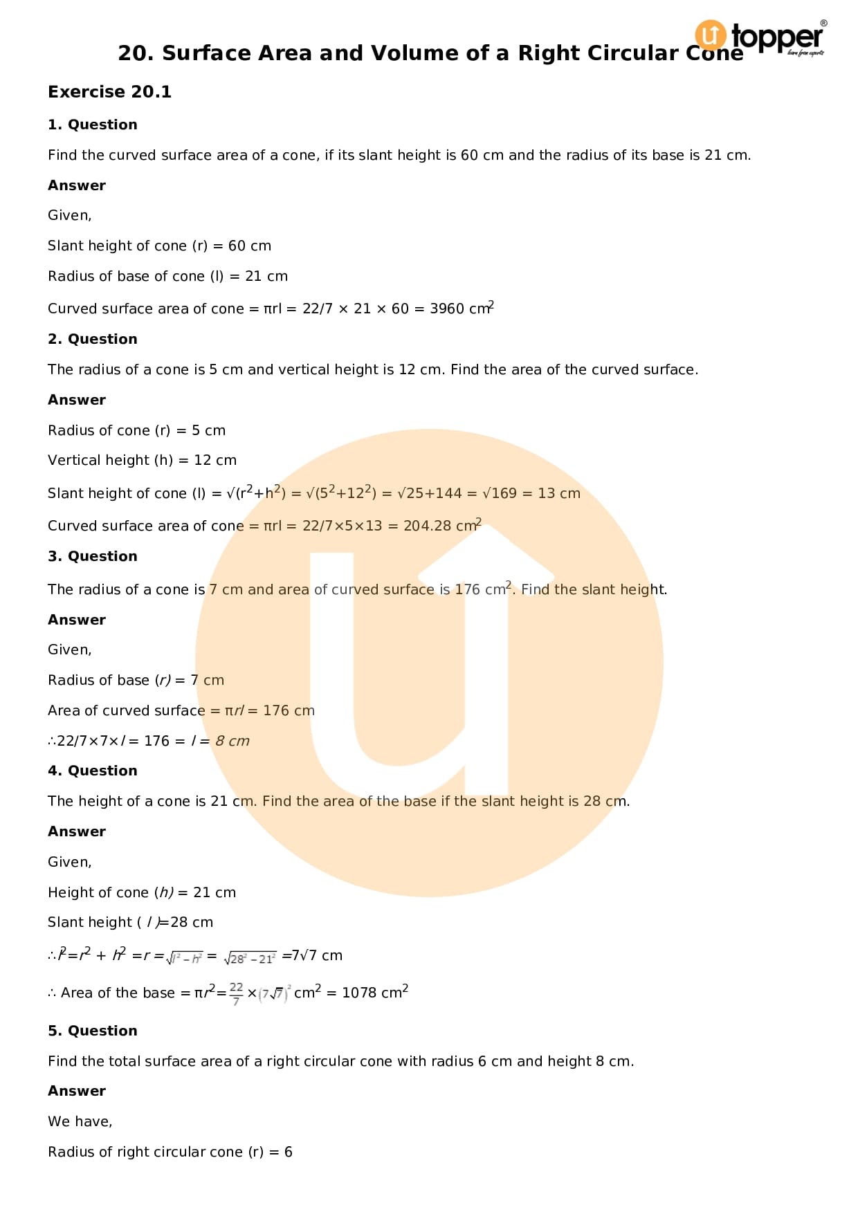 - Chapter 20 – Surface Area and Volume of A Right Circular Cone