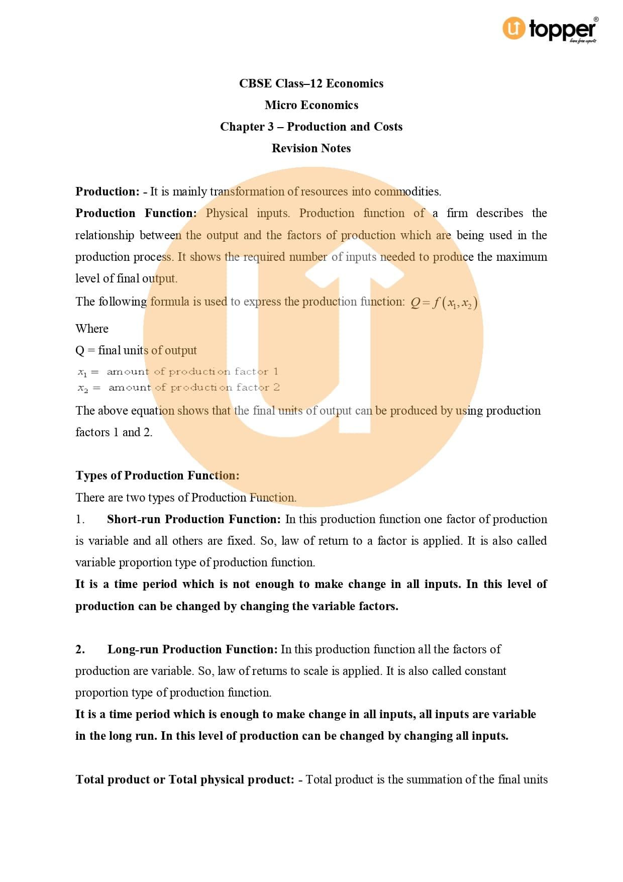 Class 12 Economics CBSE Revision Notes 9 – Production and Costs