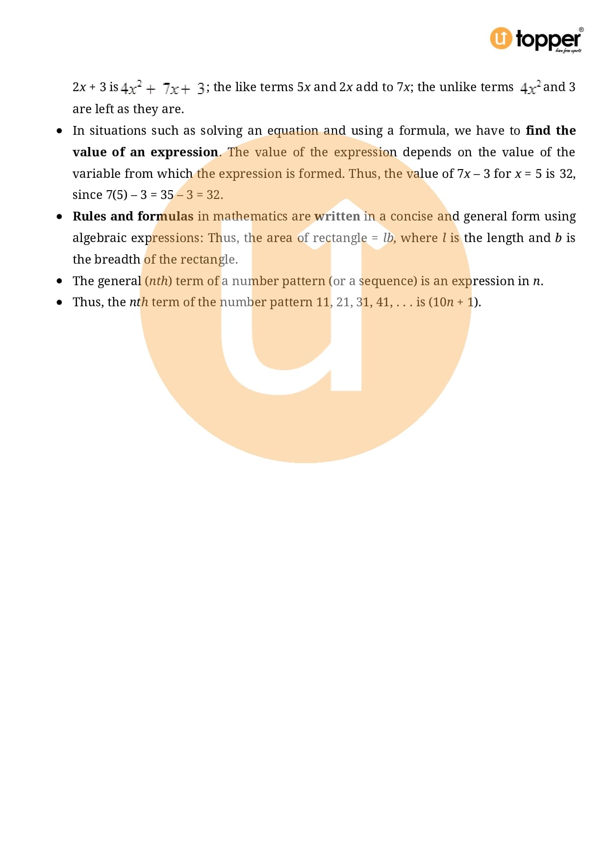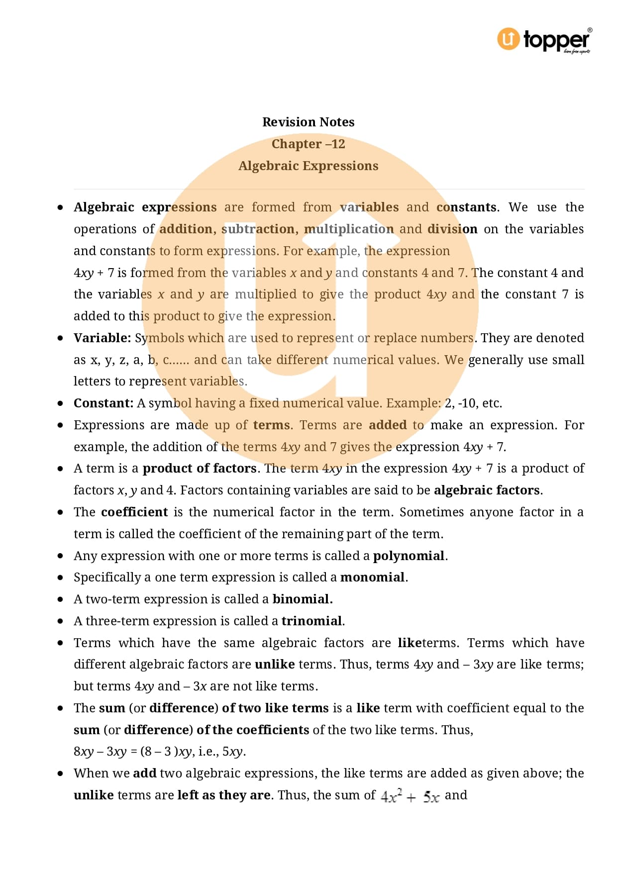 Class 7 Maths CBSE Revision Notes 12 – Algebraic Expressions