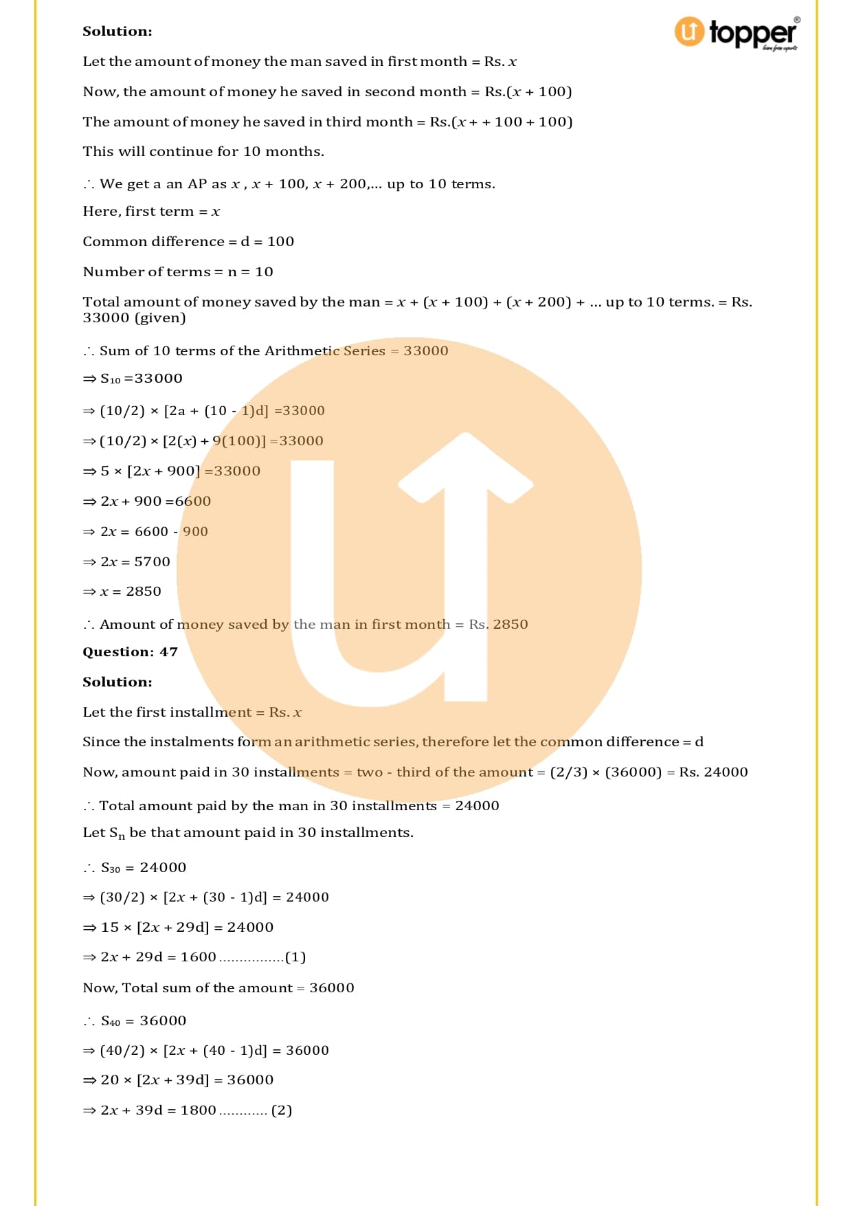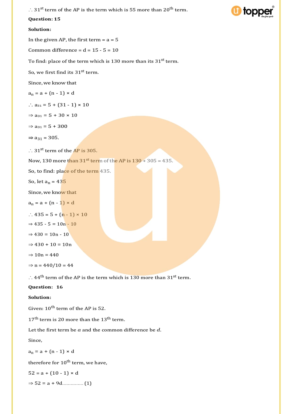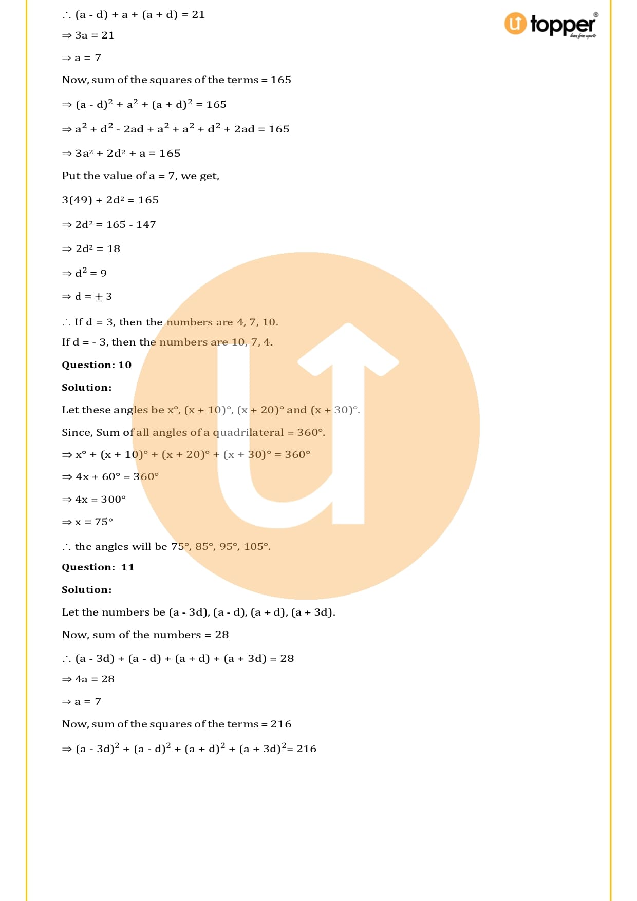 Ans – The main ideas in Chapter 11 of the CBSE Class 10 textbook are all covered in Utopper’s Arithmetic Progression Solutions for RS Aggarwal Class 10. A lot of these topics have come up over and over again in the past exams. Students can download the Arithmetic Progression Solutions for RS Aggarwal Class 10 Chapter 11 to learn more about these topics. You can also download the question paper with answers from the link on this page, and CBSE Class 10 students can use the Utopper app to find more study materials.