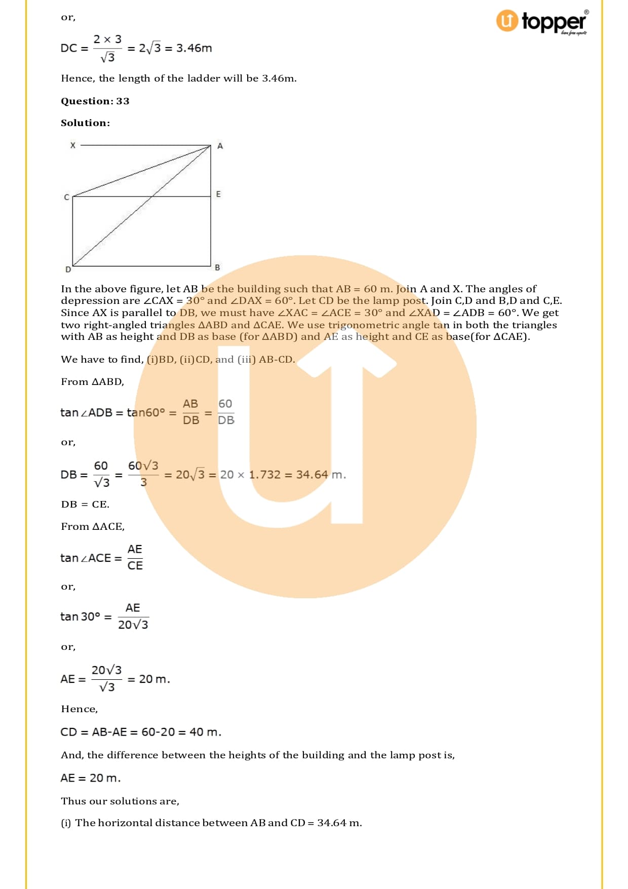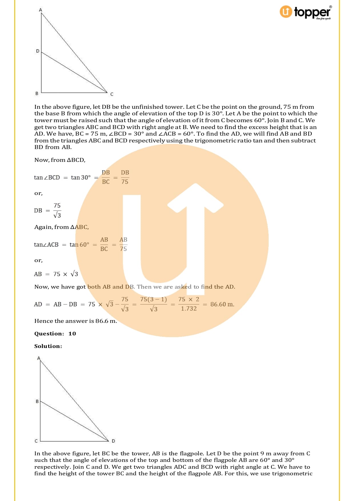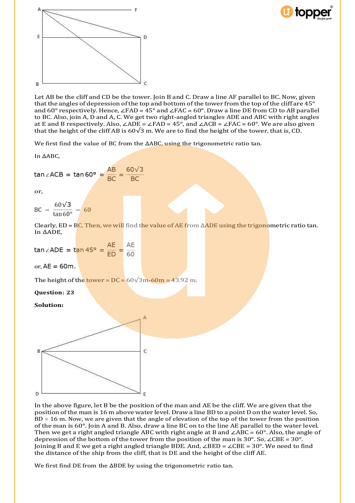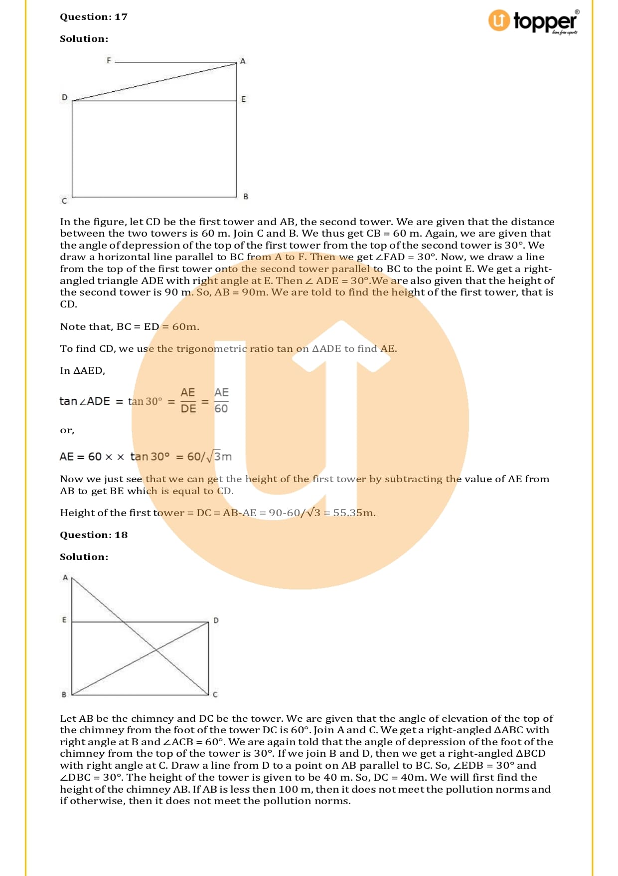 There are a total of 58 questions in the two sets of exercises in this chapter. Some of the questions have short answers, some have long answers, and some are objective. You have to learn the basics of heights and distances to solve the problems. You also have to figure out the angle of elevation and depression and solve some heights and distances word problems. In most problems, there are no more than two triangles with right angles, and the angles of elevation or depression are 30, 45, or 60 degrees.