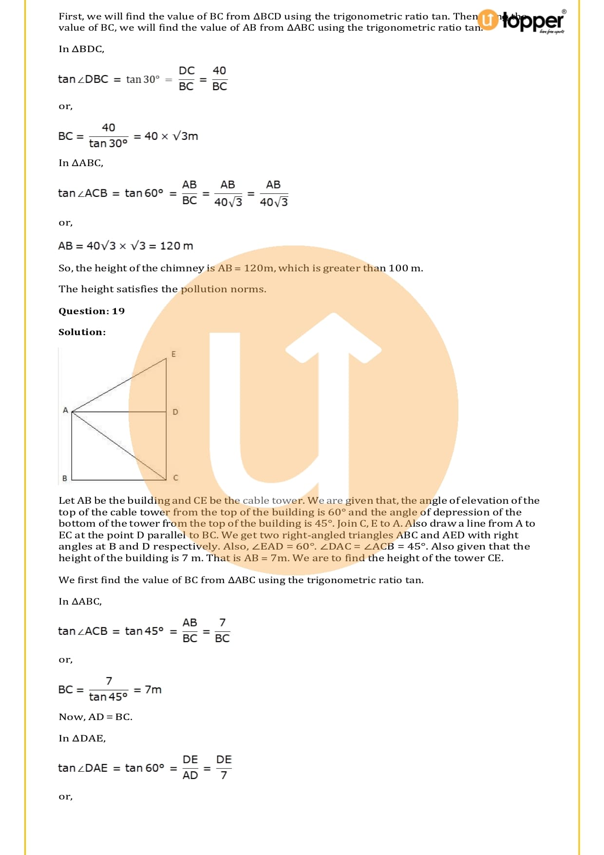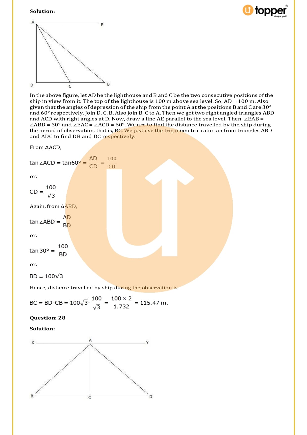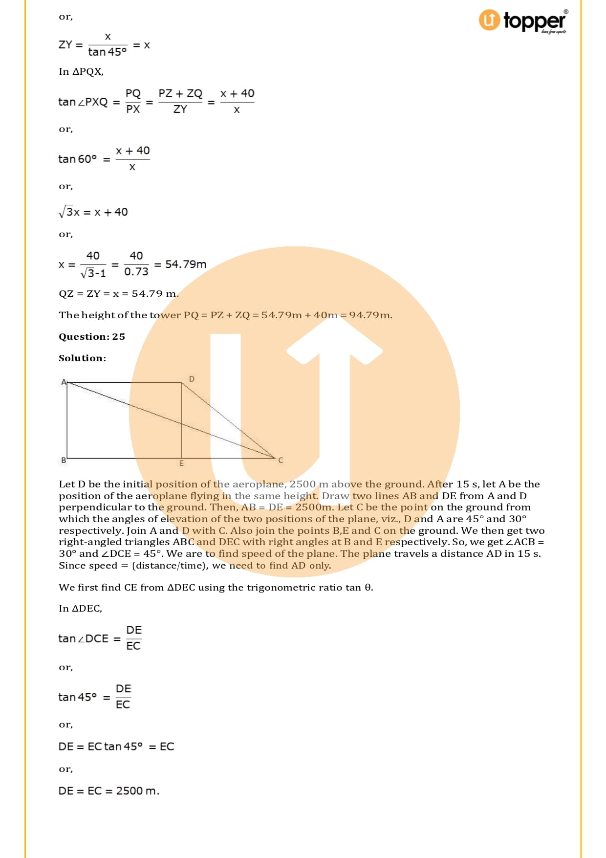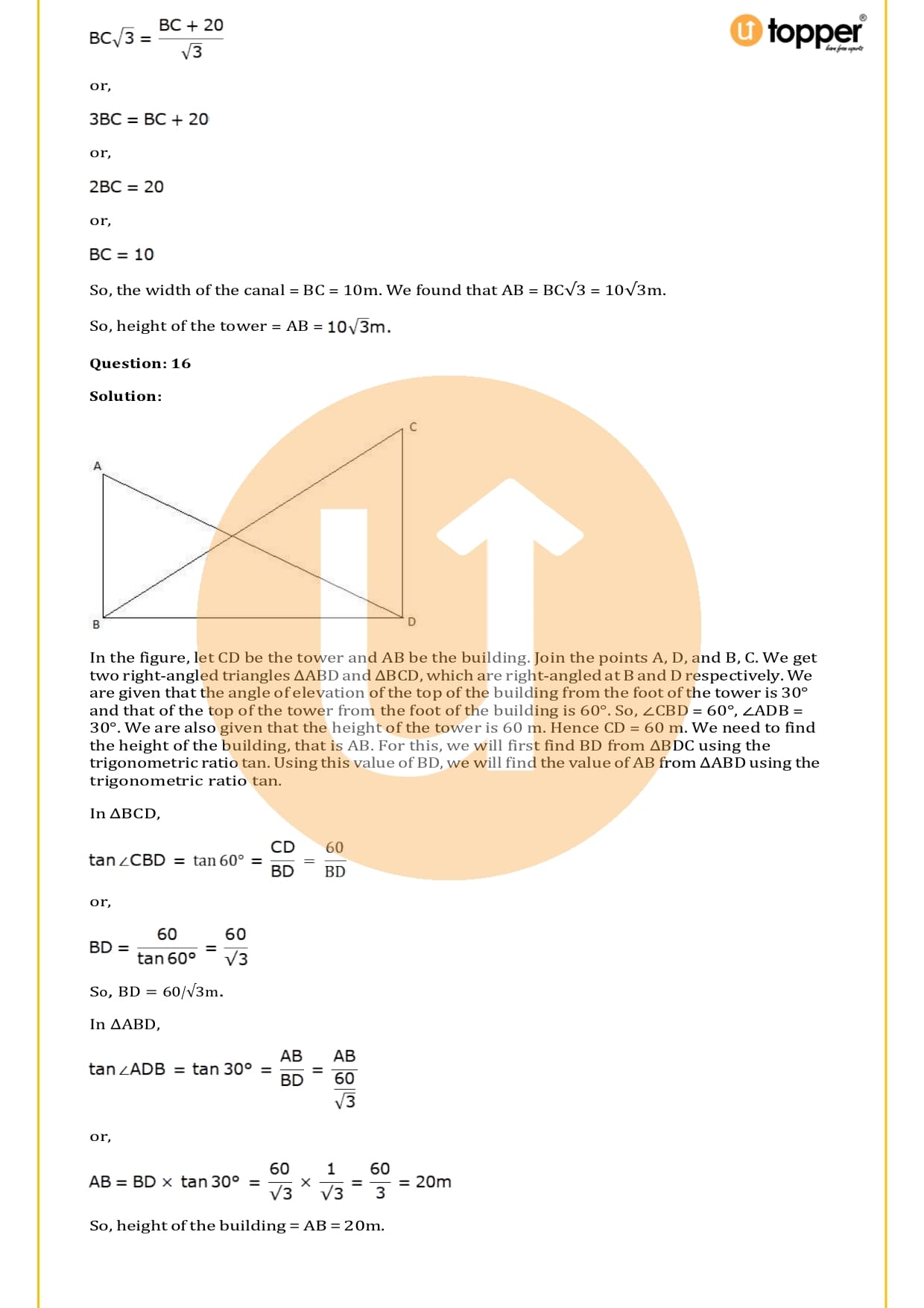 There are a total of 58 questions in the two sets of exercises in this chapter. Some of the questions have short answers, some have long answers, and some are objective. You have to learn the basics of heights and distances to solve the problems. You also have to figure out the angle of elevation and depression and solve some heights and distances word problems. In most problems, there are no more than two triangles with right angles, and the angles of elevation or depression are 30, 45, or 60 degrees.