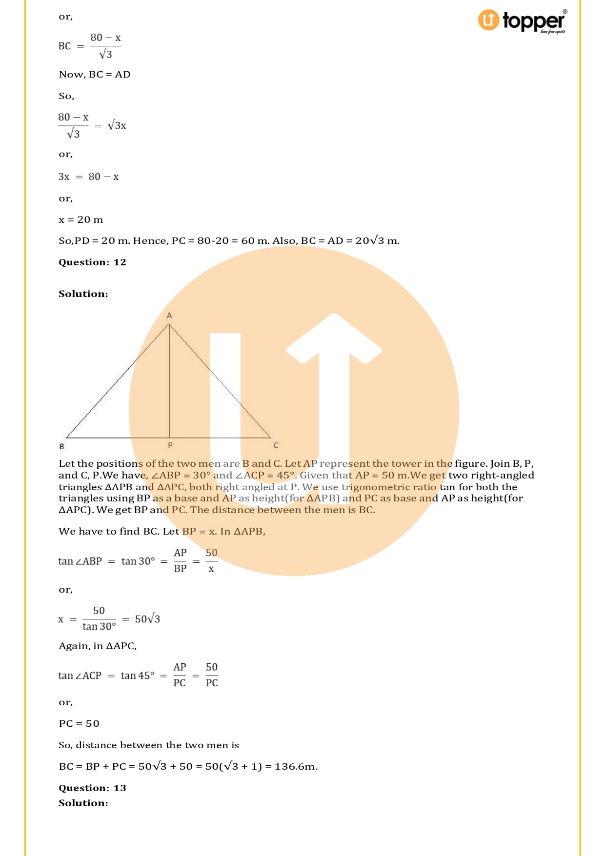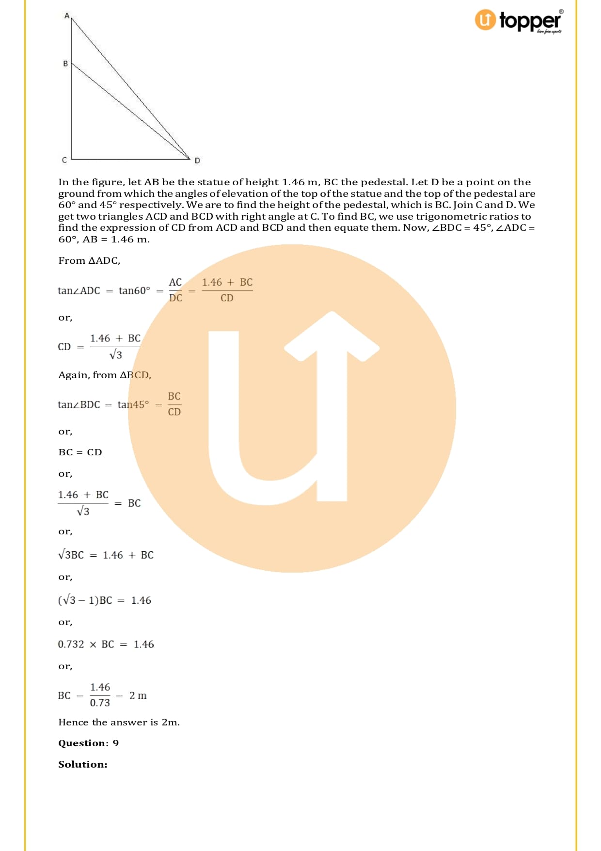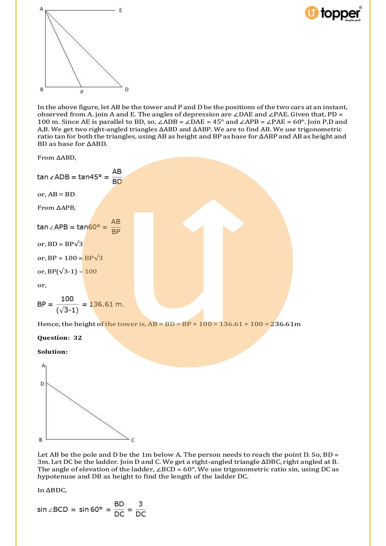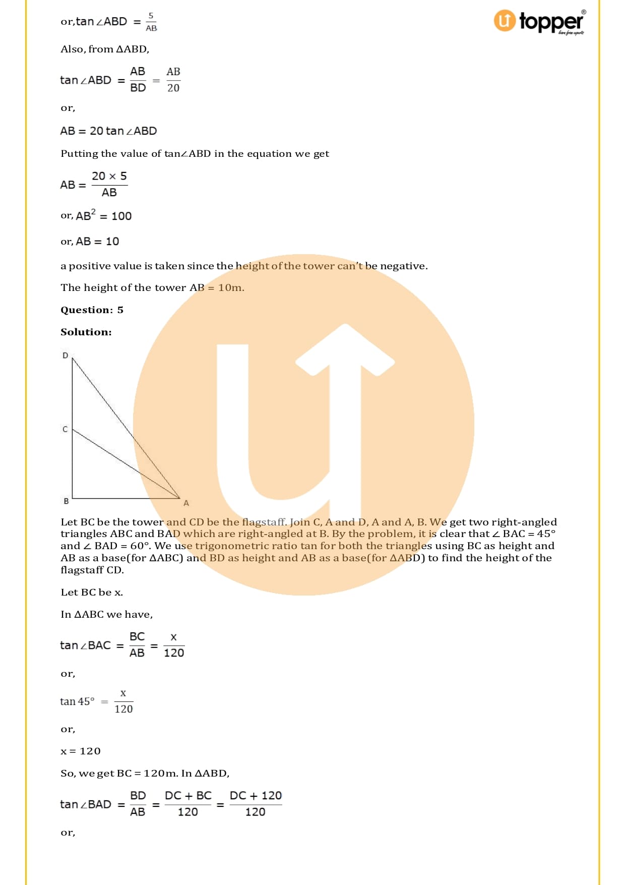 There are a total of 58 questions in the two sets of exercises in this chapter. Some of the questions have short answers, some have long answers, and some are objective. You have to learn the basics of heights and distances to solve the problems. You also have to figure out the angle of elevation and depression and solve some heights and distances word problems. In most problems, there are no more than two triangles with right angles, and the angles of elevation or depression are 30, 45, or 60 degrees.