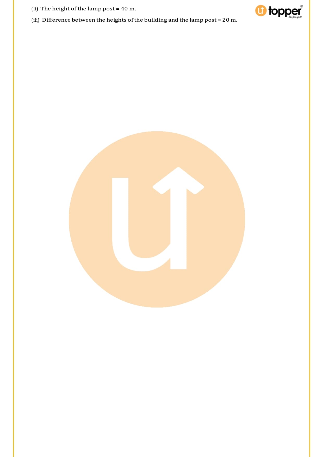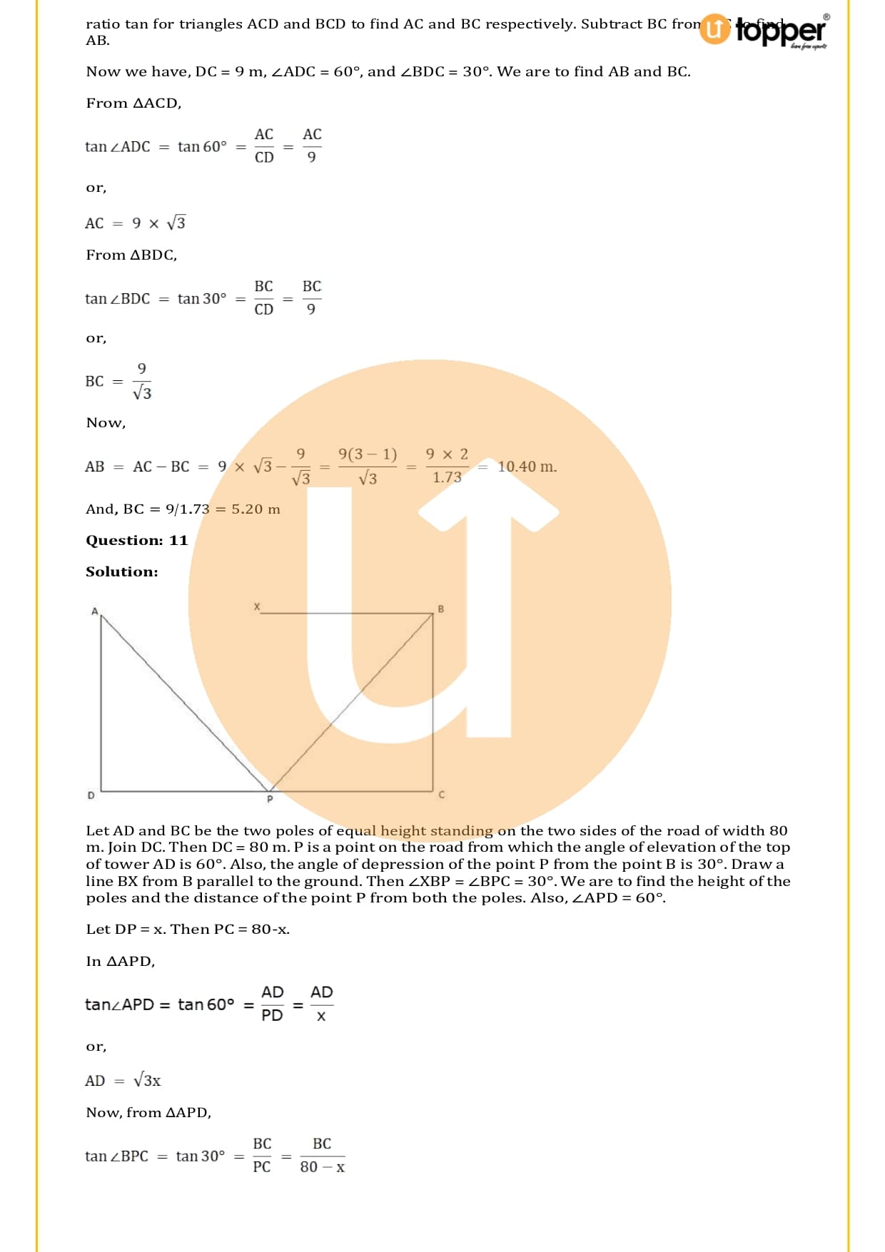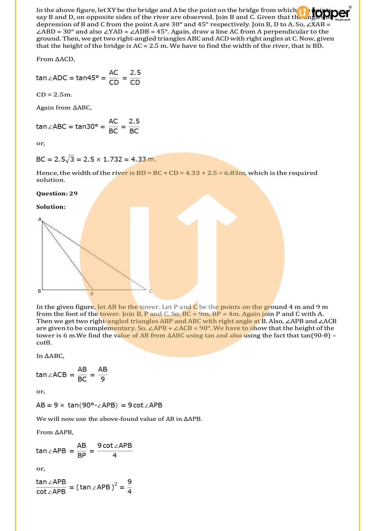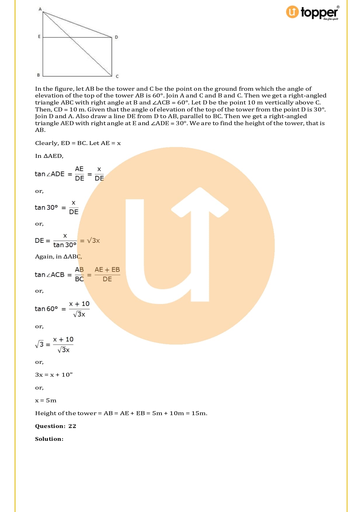 There are a total of 58 questions in the two sets of exercises in this chapter. Some of the questions have short answers, some have long answers, and some are objective. You have to learn the basics of heights and distances to solve the problems. You also have to figure out the angle of elevation and depression and solve some heights and distances word problems. In most problems, there are no more than two triangles with right angles, and the angles of elevation or depression are 30, 45, or 60 degrees.