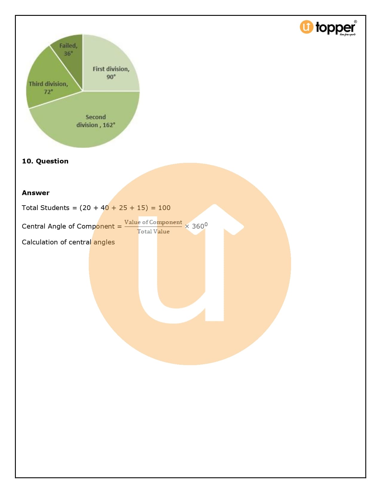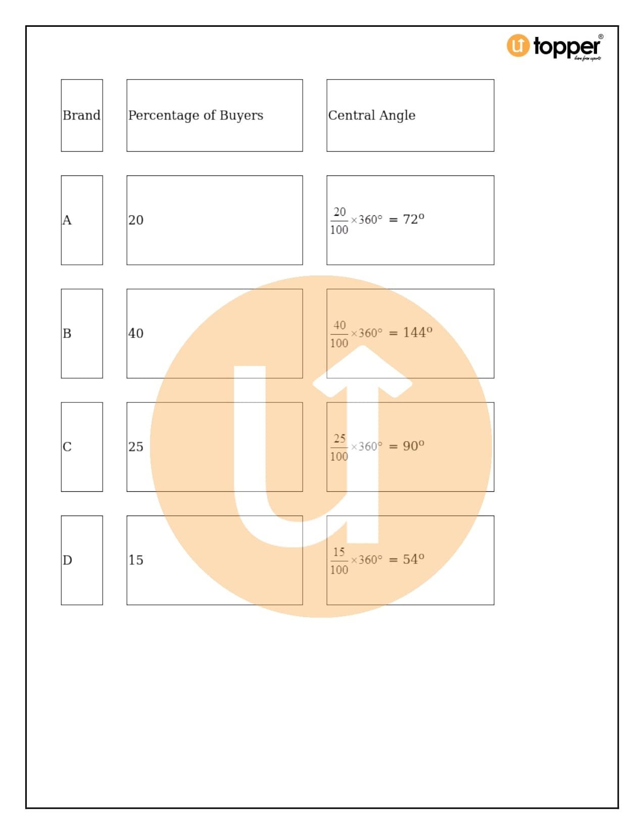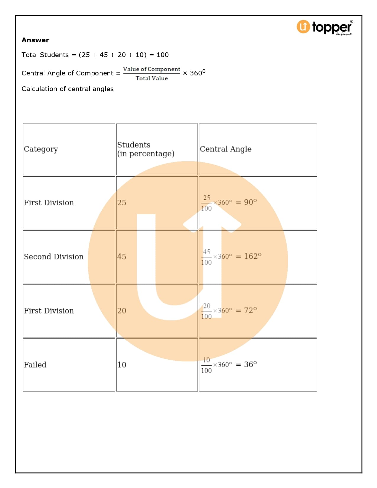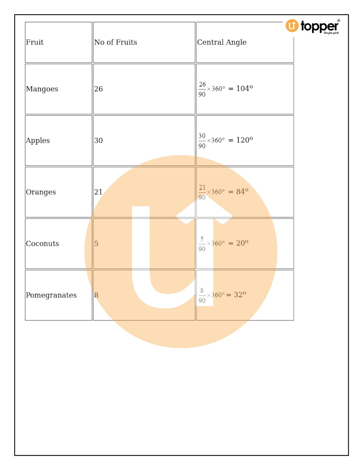 - Now, you need to figure out how many degrees each slice of the pie chart represents. To do this, divide the given data by the total data and then multiply that number by 360°.