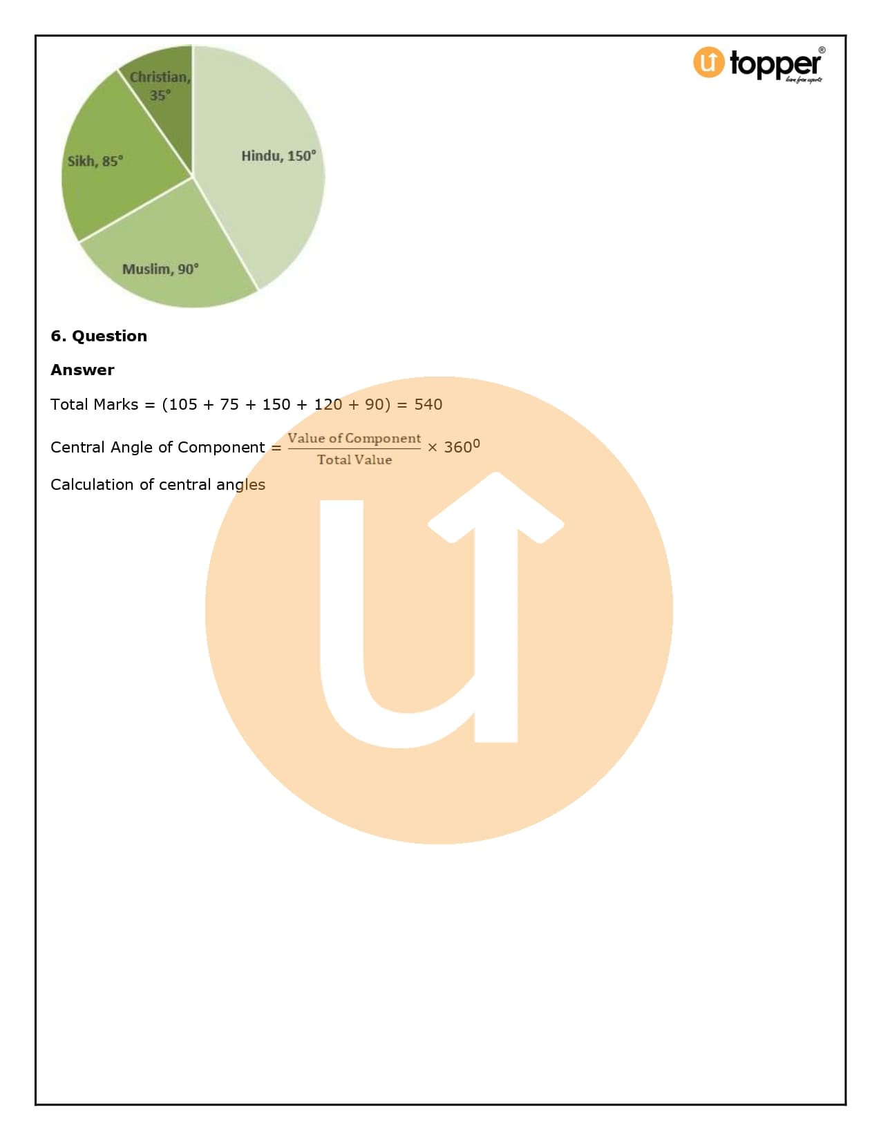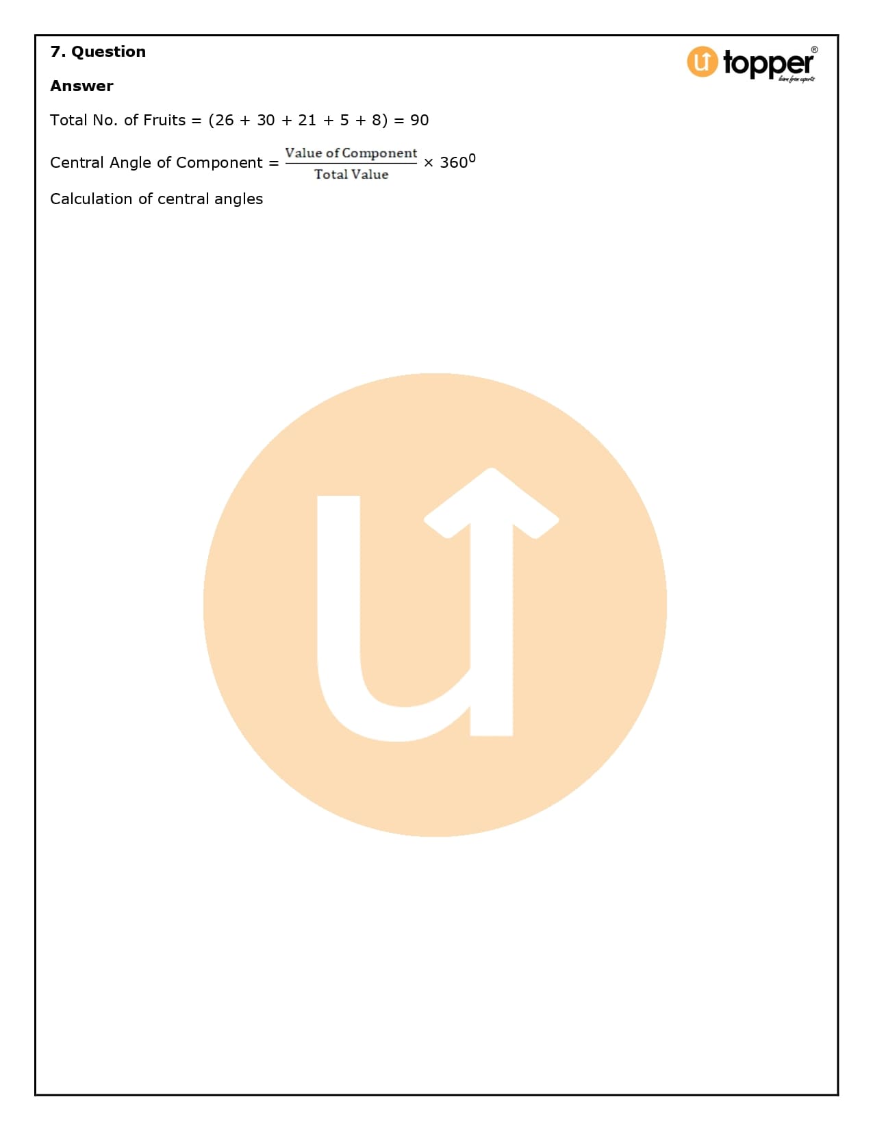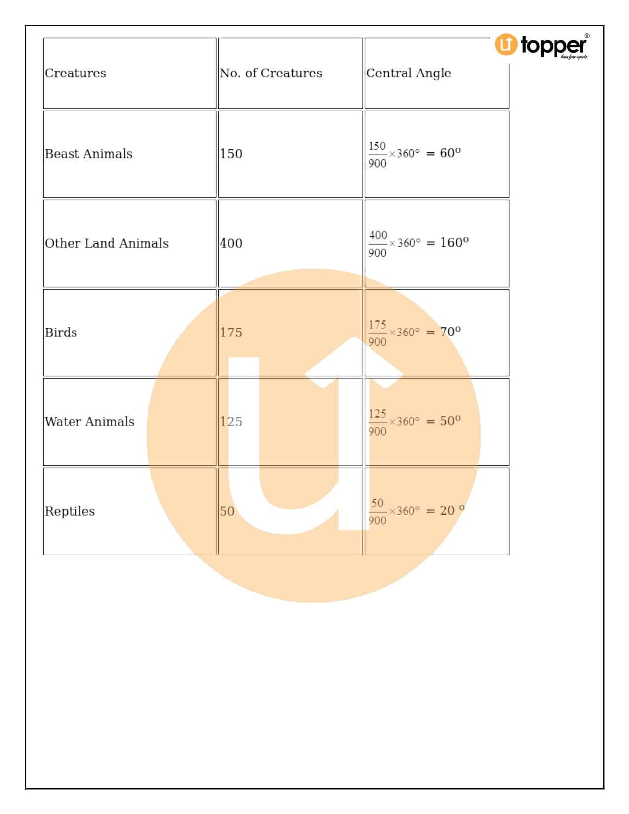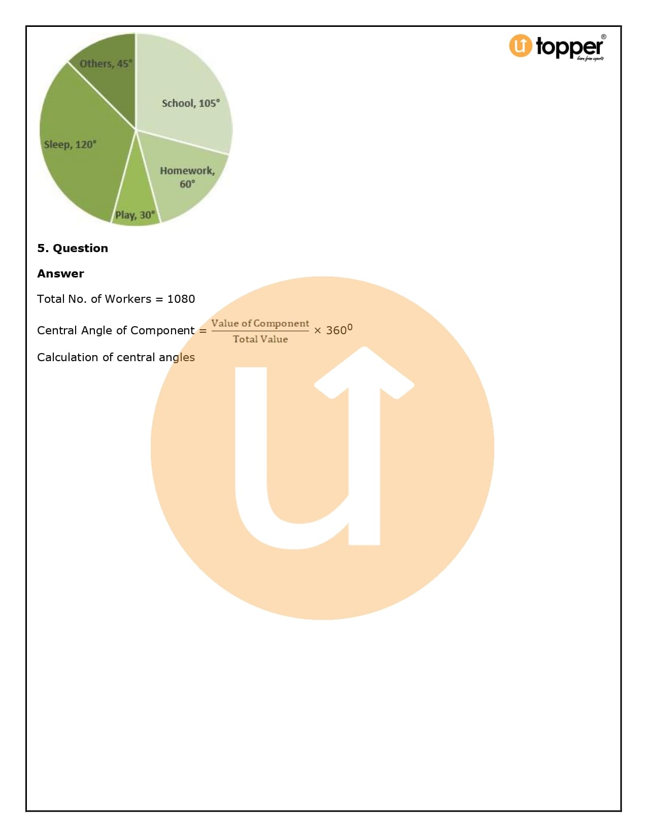 - Now, you need to figure out how many degrees each slice of the pie chart represents. To do this, divide the given data by the total data and then multiply that number by 360°.