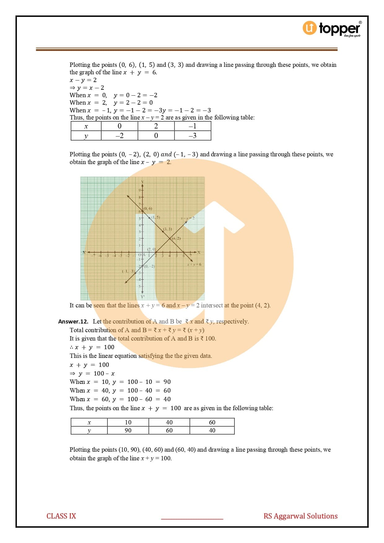 Ans – Algebra is an important subject to learn, and it takes a lot of practise to get good at it. Linear equations with two variables is a class 9 topic that must be mastered in order to understand later topics in higher grades. You can avoid worry and stress by looking at Utopper’s portal for Class 9 RS Aggarwal Chapter-4 Linear Equations in Two Variables Solutions. It is a book written by the great mathematician RS Aggarwal himself, and it is a great resource for all math students. In the book, the questions are answered and the steps are explained in a way that is easy to understand.