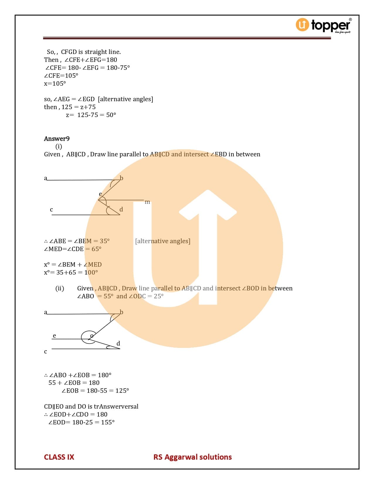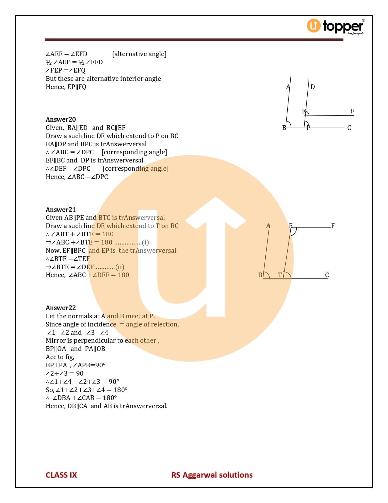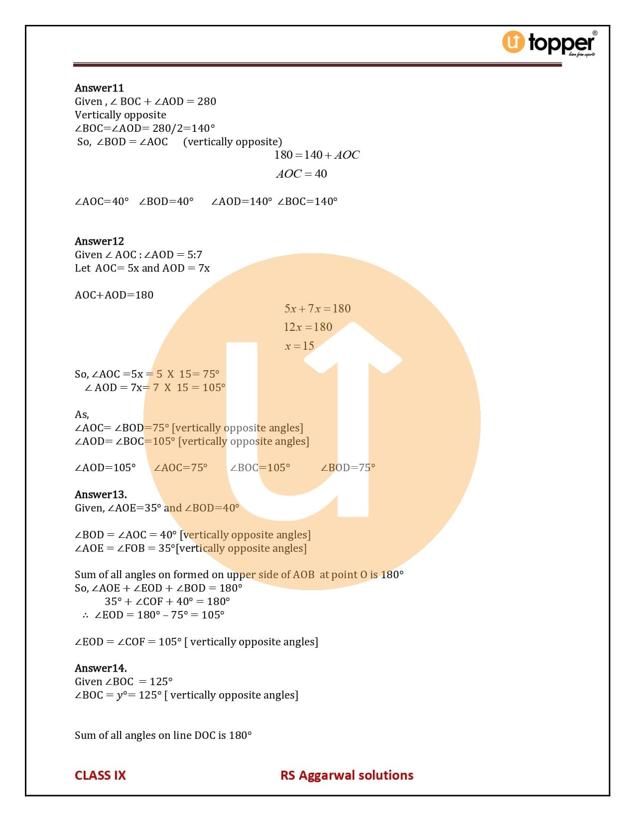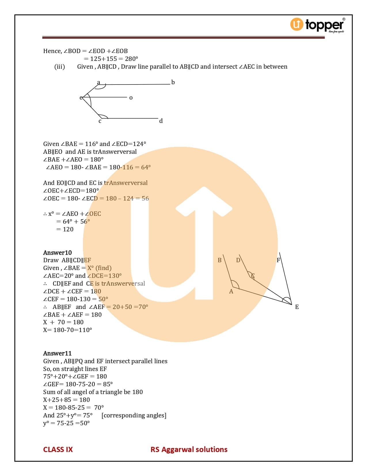 The RS Aggarwal Class 9 Solutions Chapter 7 talks about everything you need to know to do well on your upcoming math tests. Angles are everywhere. You can find them in nature and also in man-made things like buildings and bridges. With RS Aggarwal Class 9 Lines and Angles Solutions, you can find all the answers to the written questions at the back of the book. Utopper is a site where you can get free CBSE (NCERT) solutions. You can also download NCERT Class 9 Science NCERT Solutions and Class 9 Maths NCERT Solutions to help you review the whole curriculum and get better grades on your tests.
