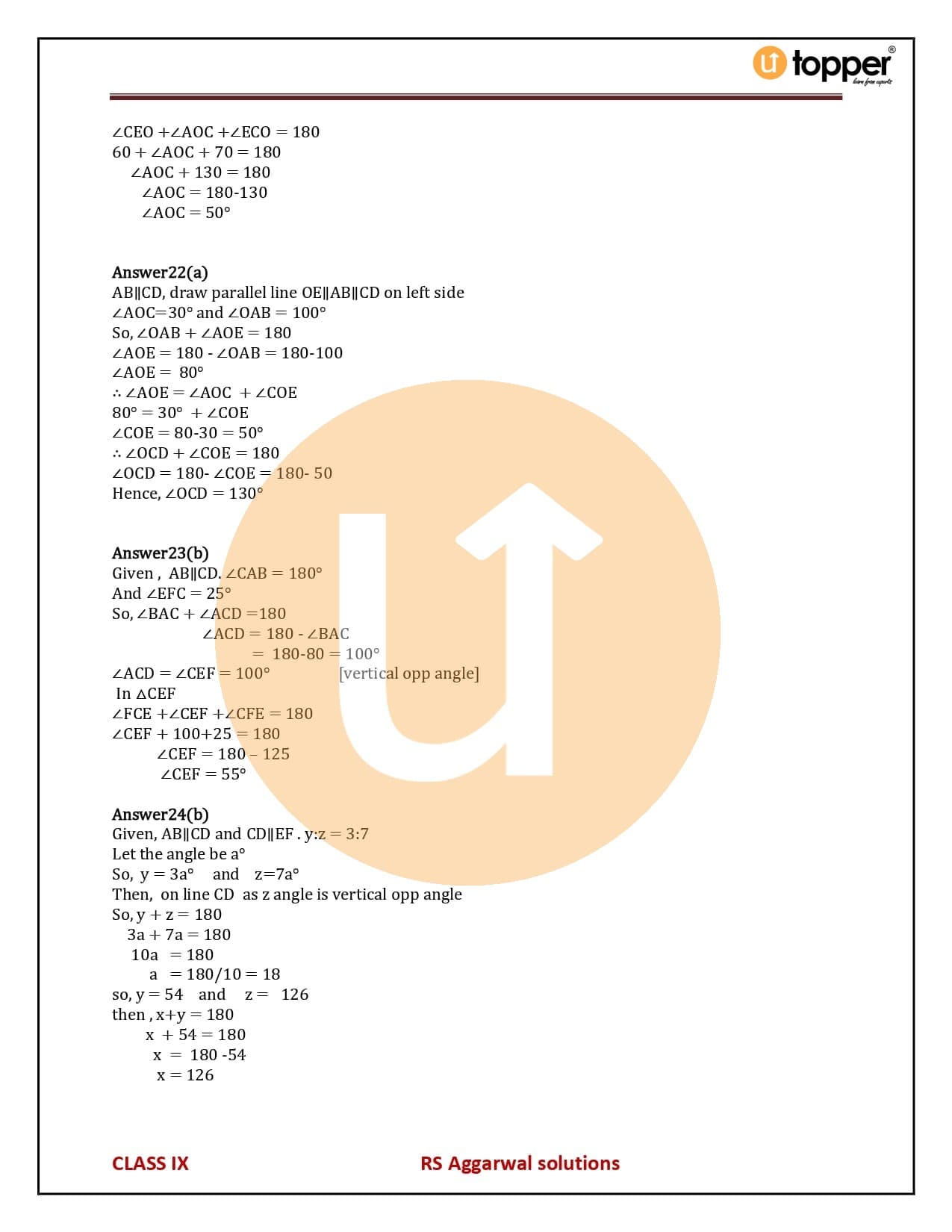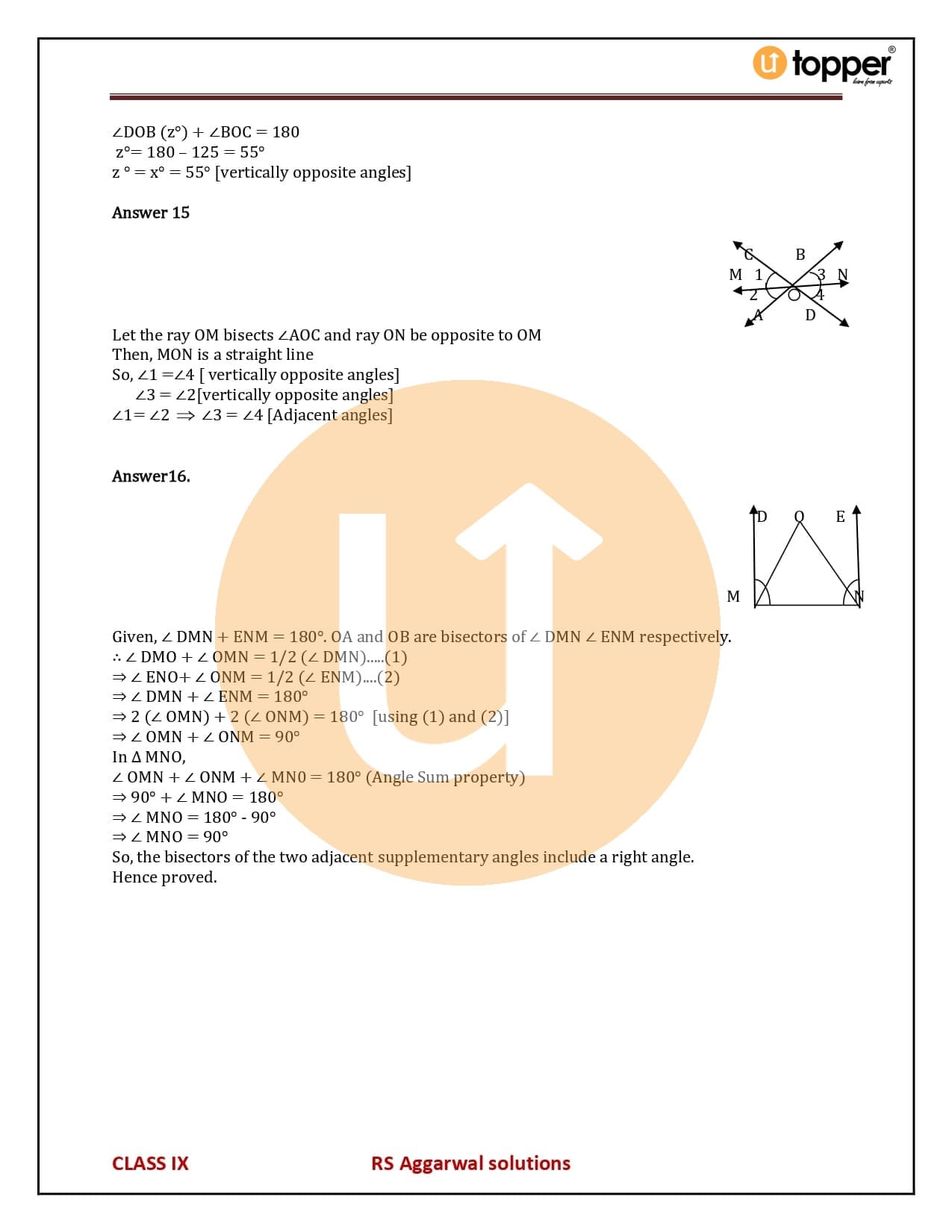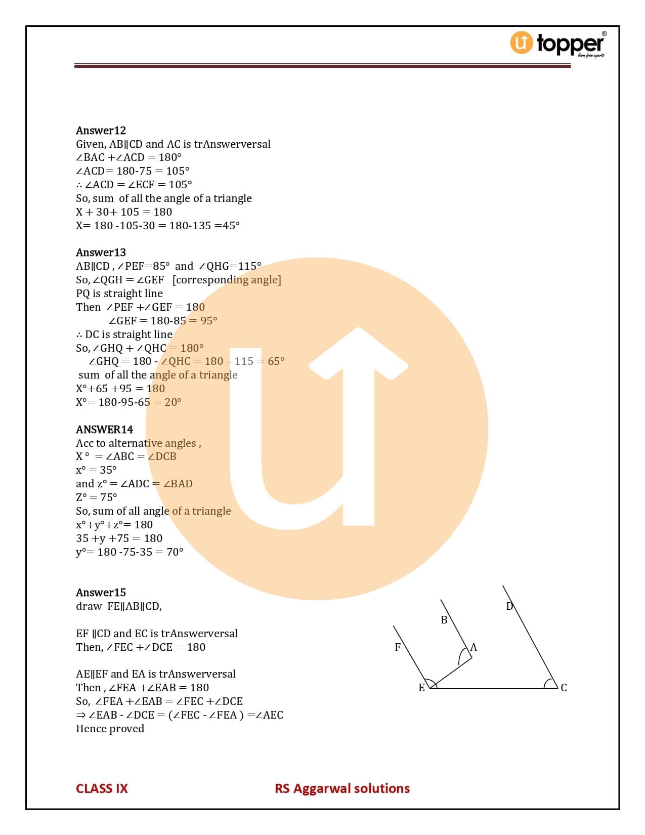 The RS Aggarwal Class 9 Solutions Chapter 7 talks about everything you need to know to do well on your upcoming math tests. Angles are everywhere. You can find them in nature and also in man-made things like buildings and bridges. With RS Aggarwal Class 9 Lines and Angles Solutions, you can find all the answers to the written questions at the back of the book. Utopper is a site where you can get free CBSE (NCERT) solutions. You can also download NCERT Class 9 Science NCERT Solutions and Class 9 Maths NCERT Solutions to help you review the whole curriculum and get better grades on your tests.
