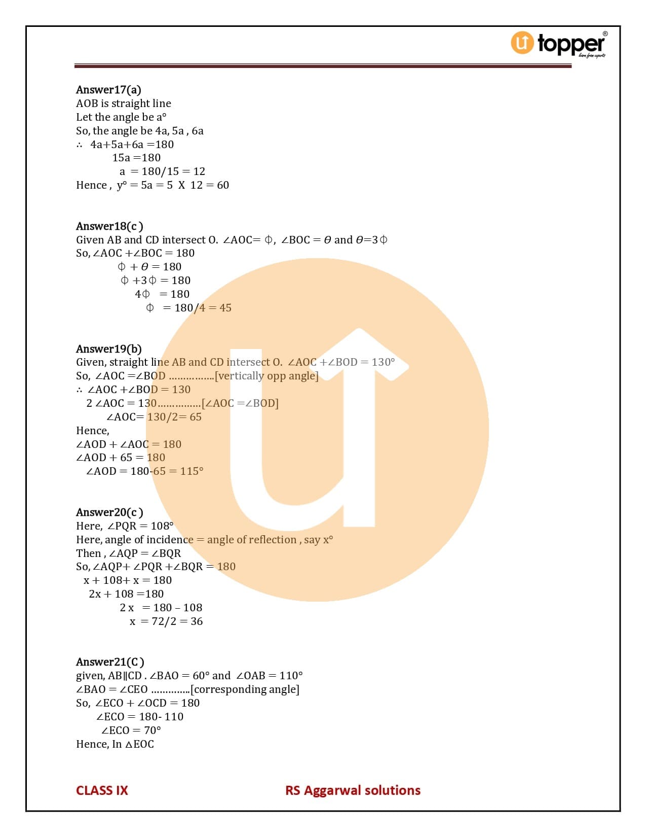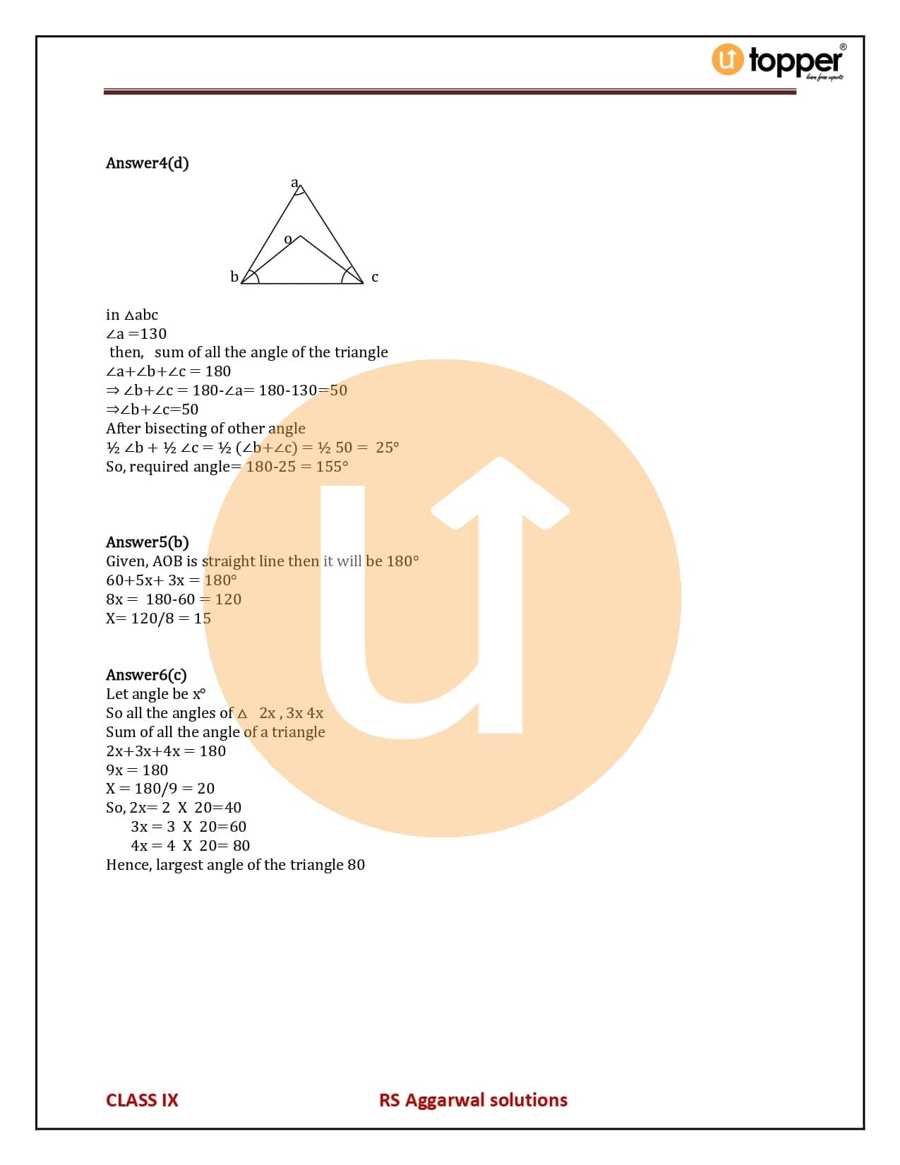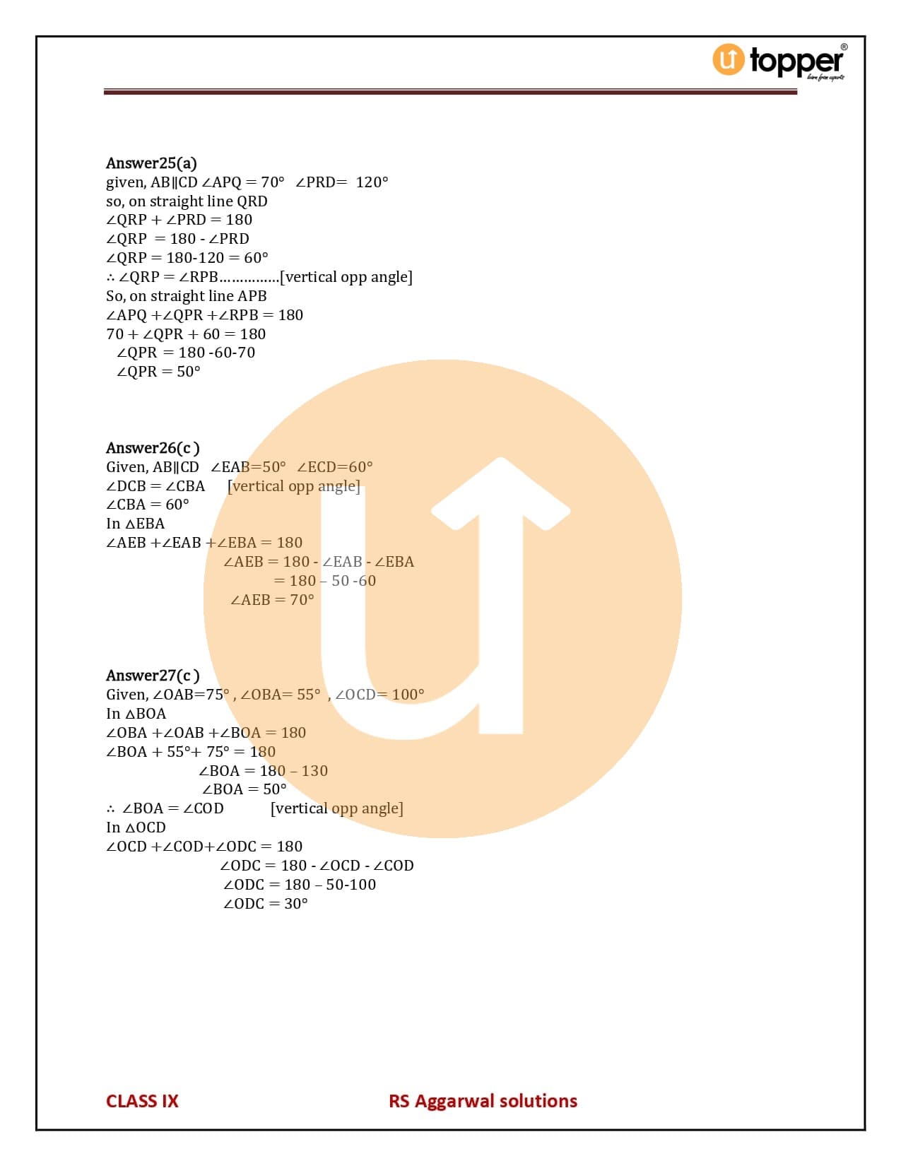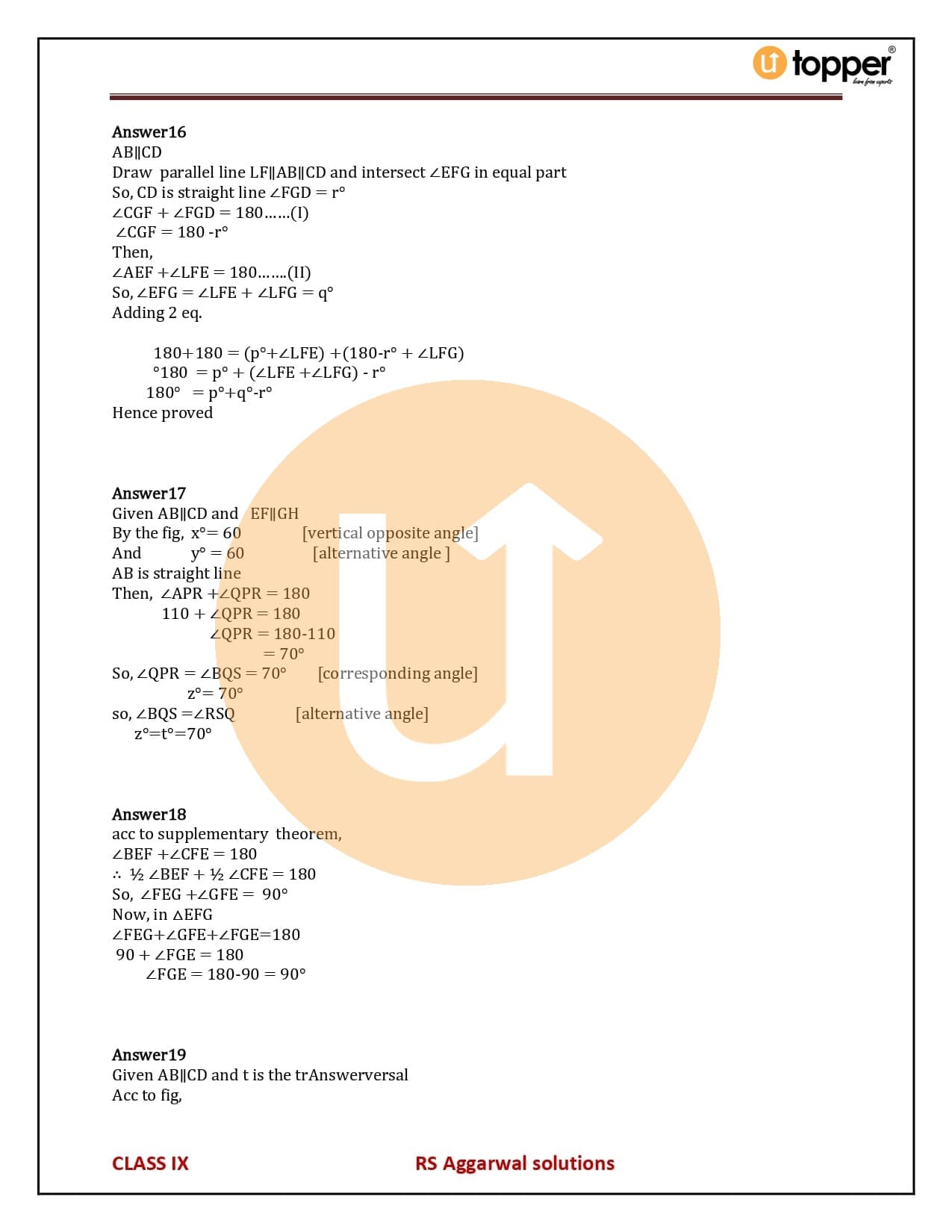 The RS Aggarwal Class 9 Solutions Chapter 7 talks about everything you need to know to do well on your upcoming math tests. Angles are everywhere. You can find them in nature and also in man-made things like buildings and bridges. With RS Aggarwal Class 9 Lines and Angles Solutions, you can find all the answers to the written questions at the back of the book. Utopper is a site where you can get free CBSE (NCERT) solutions. You can also download NCERT Class 9 Science NCERT Solutions and Class 9 Maths NCERT Solutions to help you review the whole curriculum and get better grades on your tests.