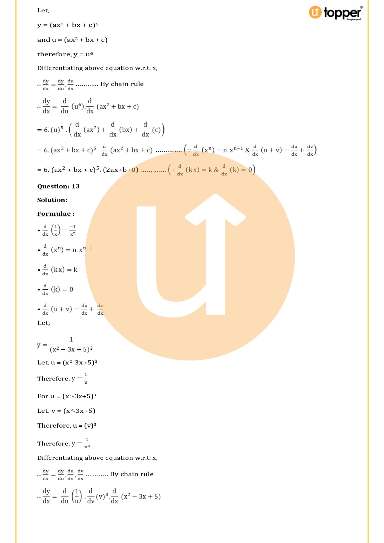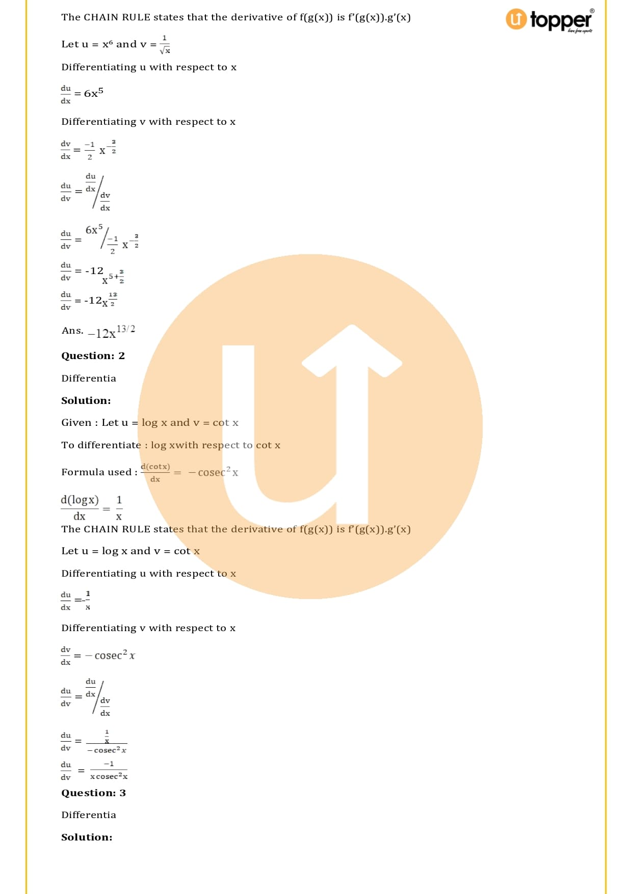 If y = f(x) = g(u) for a function and u = h(x), then the chain rule for differentiation is: Dy/dx=dy/du×du/dx