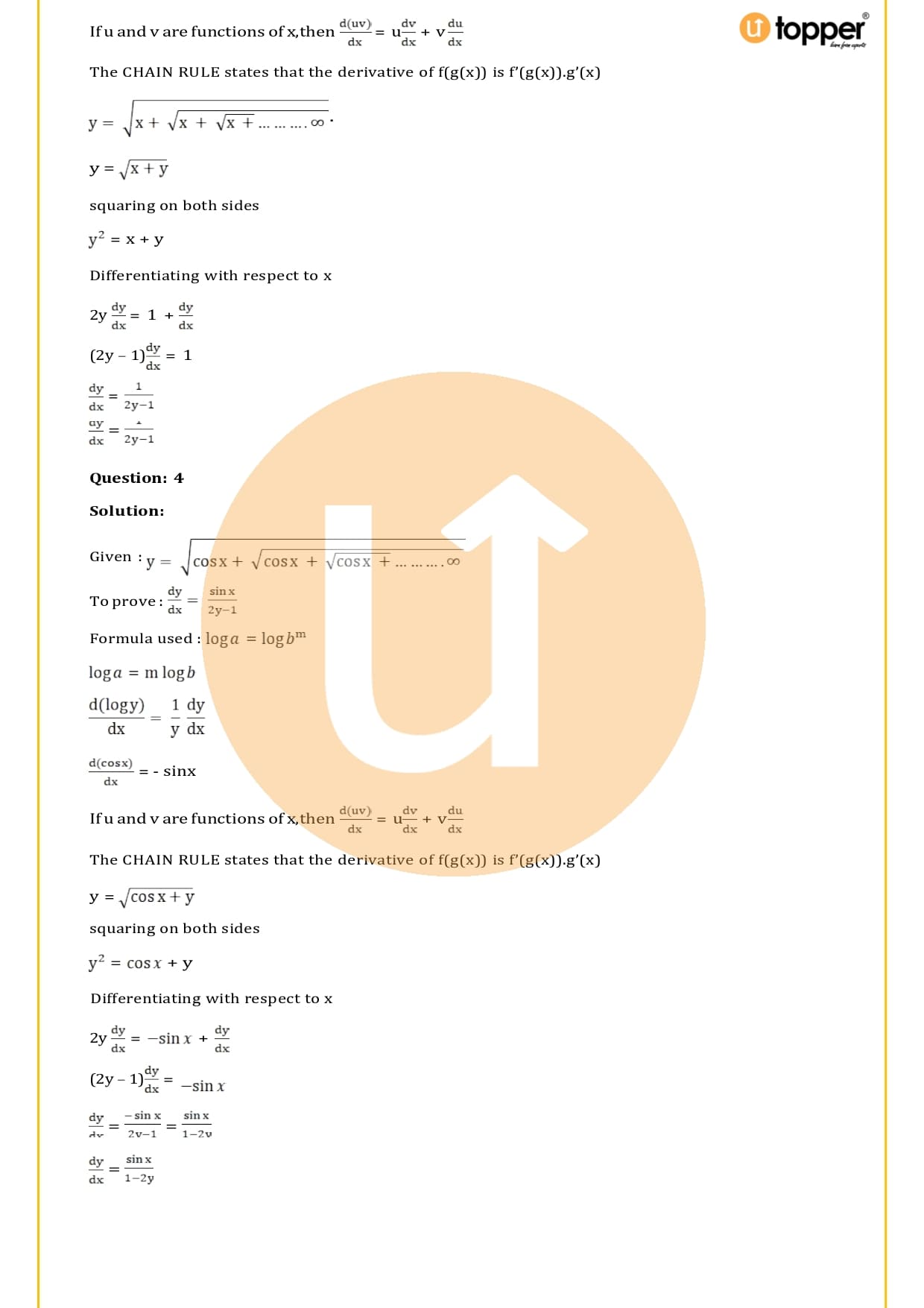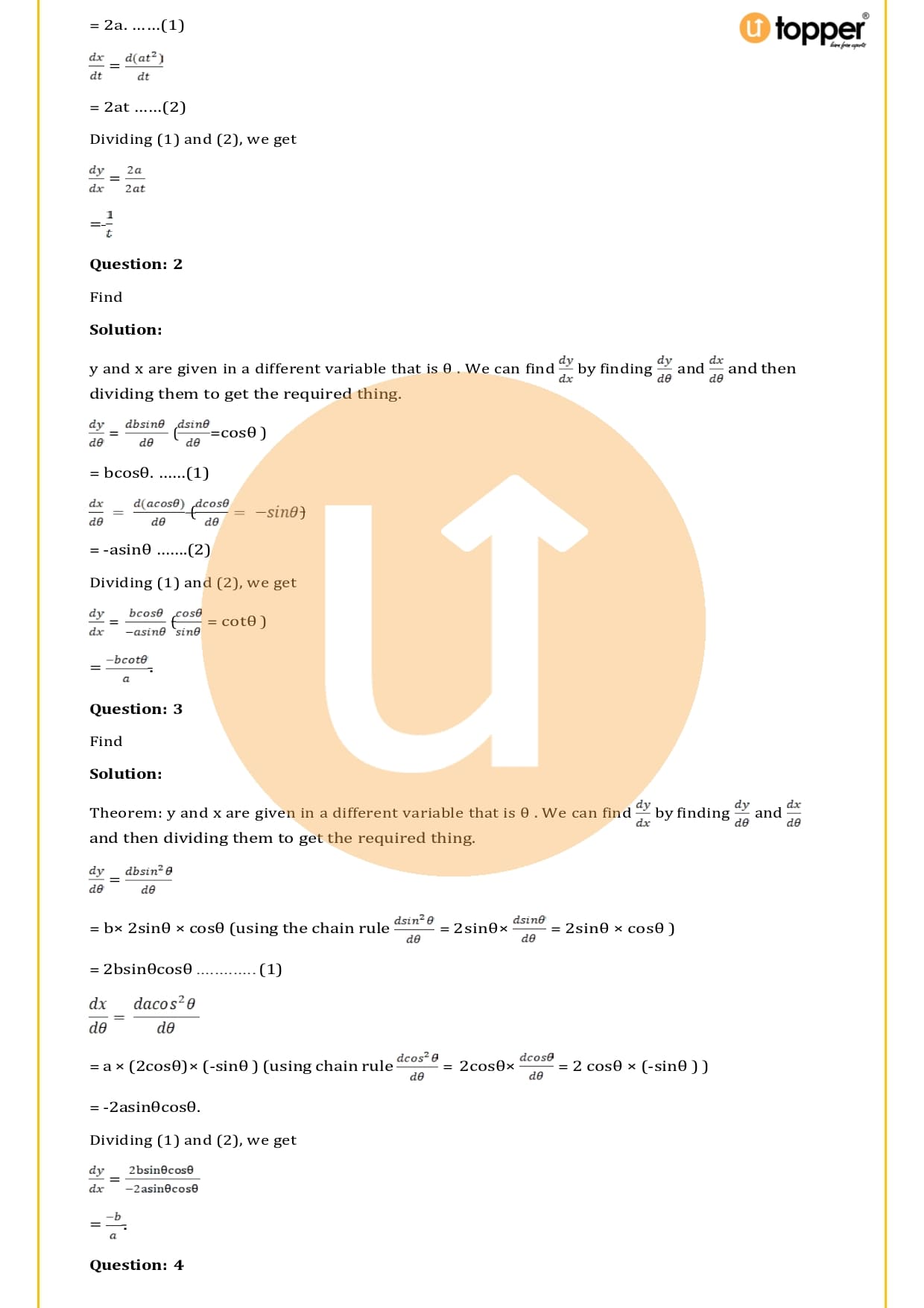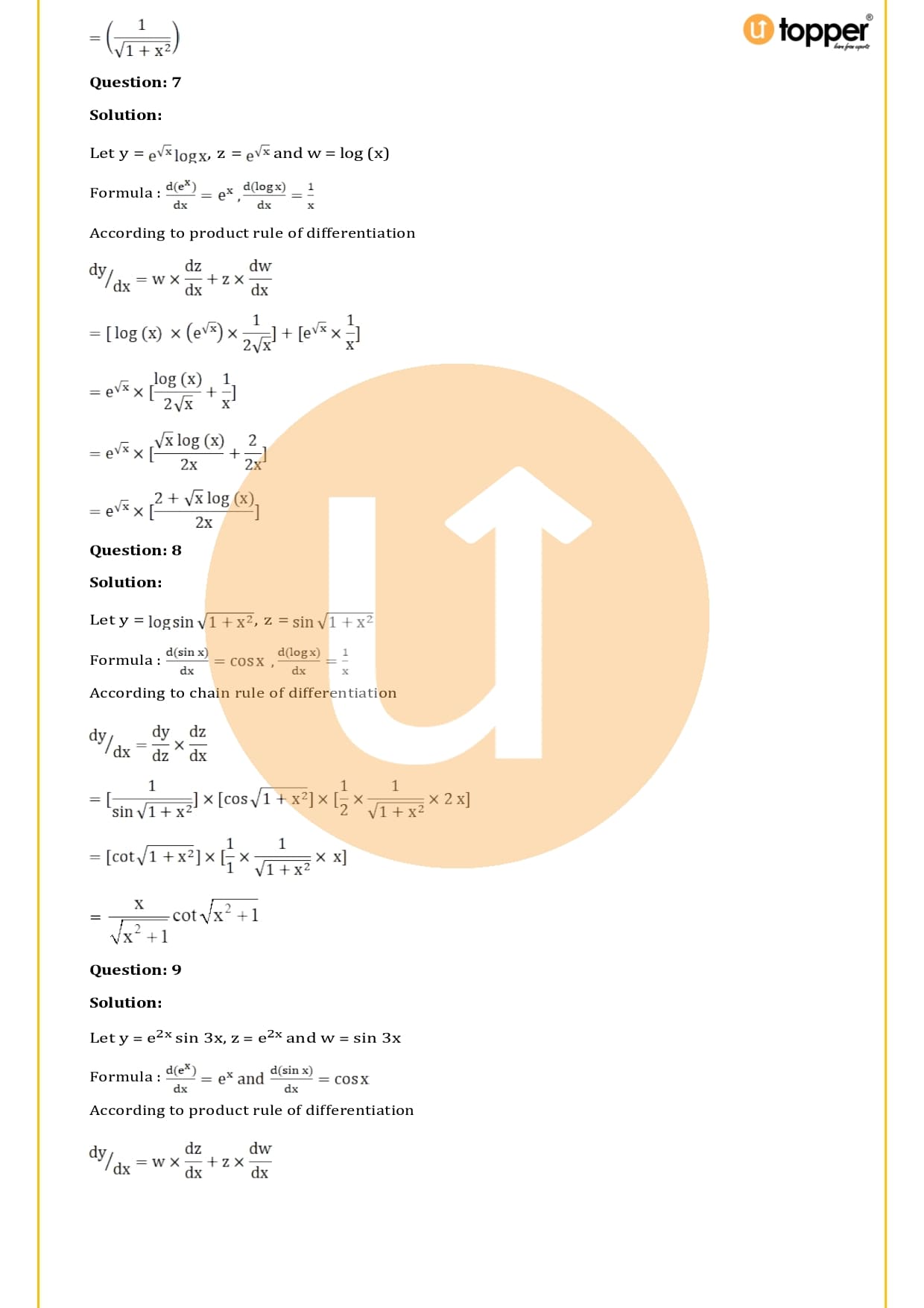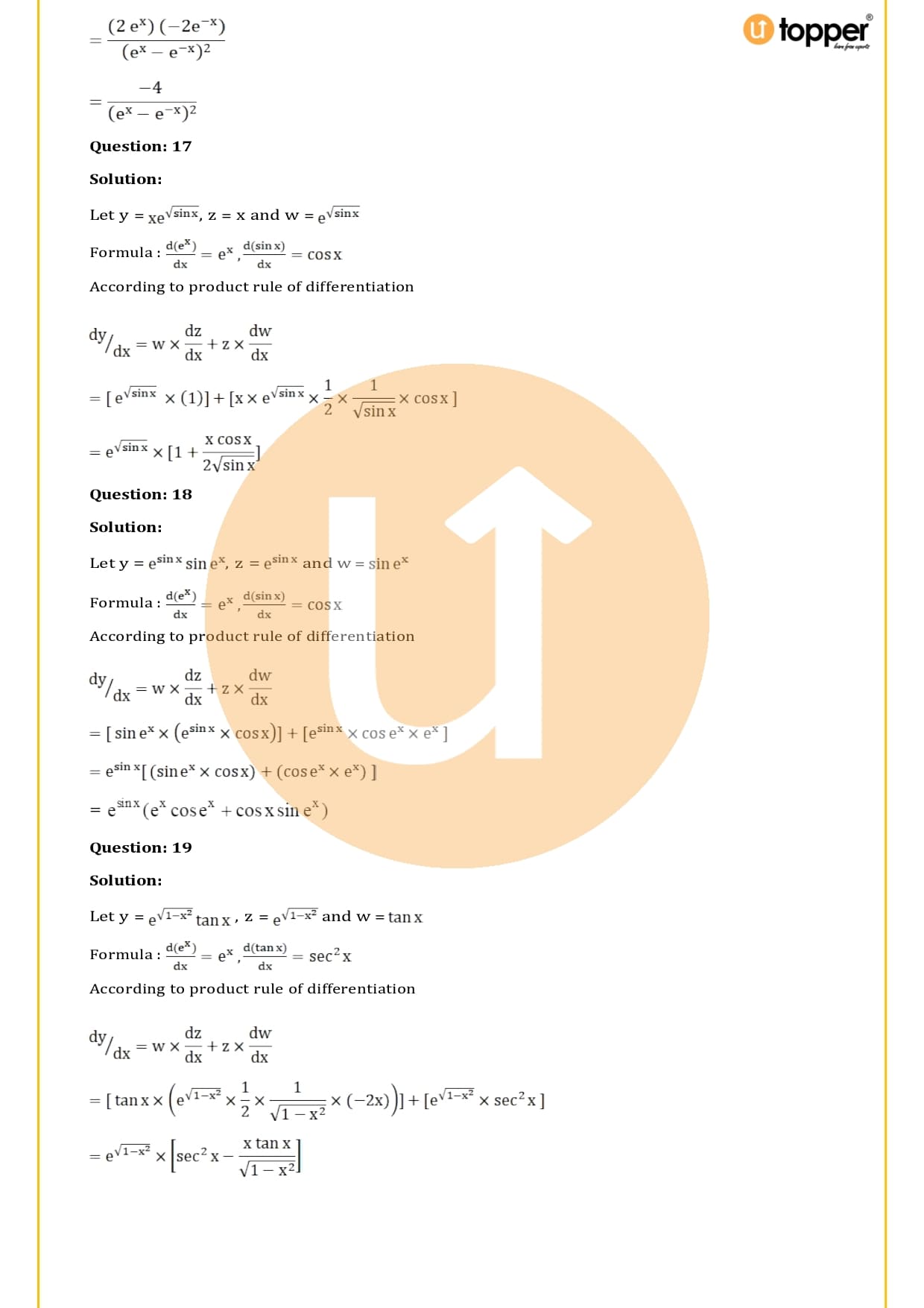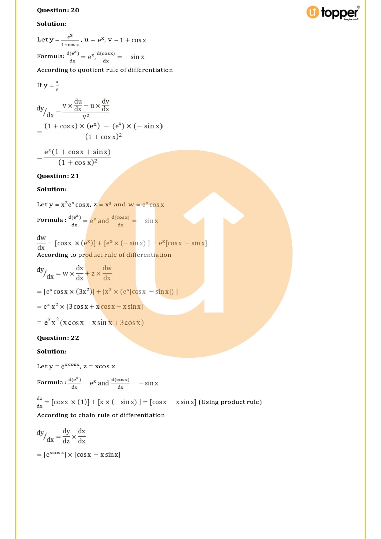 This chapter has a total of 143 questions spread across 10 exercises. This will give you a lot of practise with differentiation, which is also a very important subject on competitive exams. These questions also go into detail about all the important functions in the CBSE curriculum. If you use this reference source as part of your study routine, you’ll be able to review quickly and understand the ideas completely. You can also use the answers to the exercises to do your homework. This will fill in any gaps that might have been left by what you learned in class.