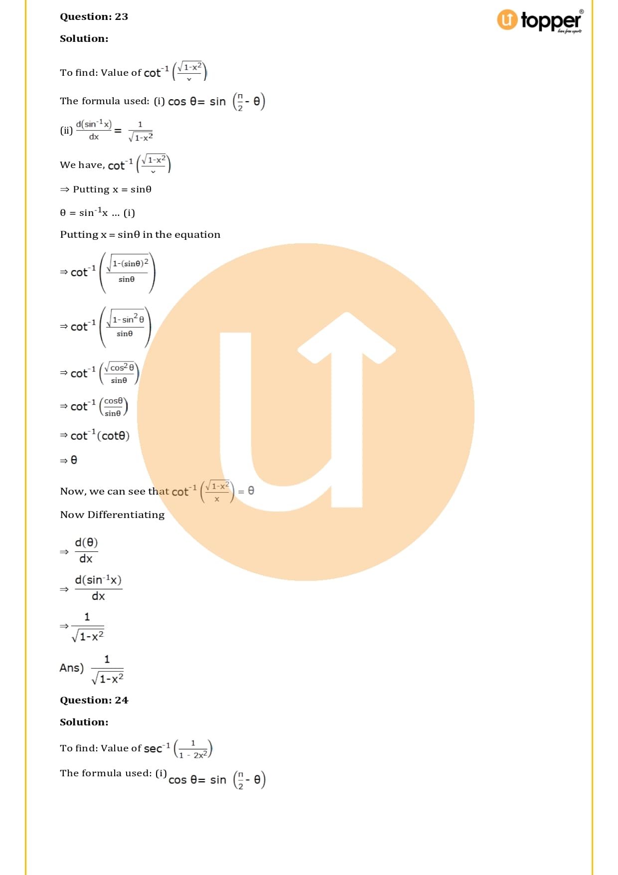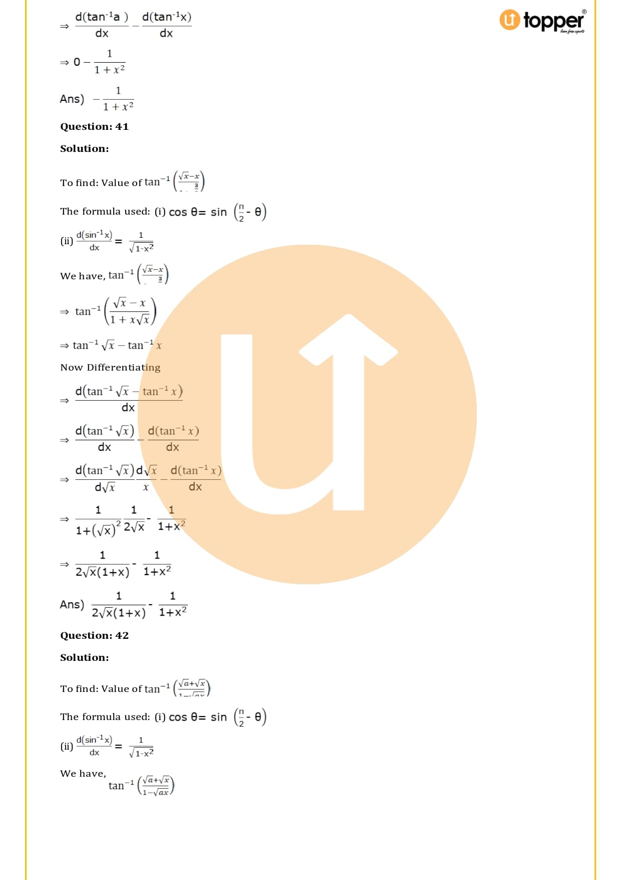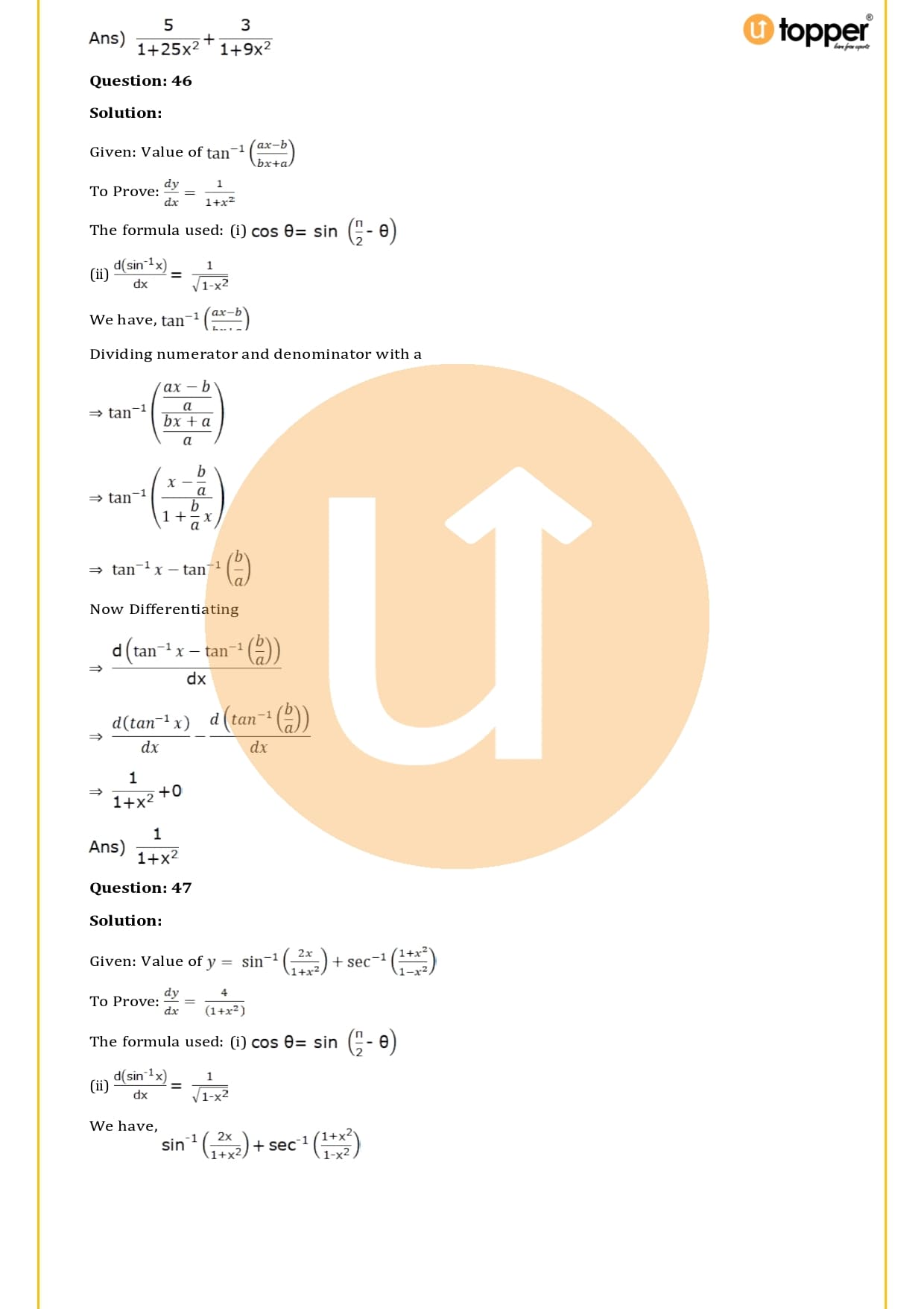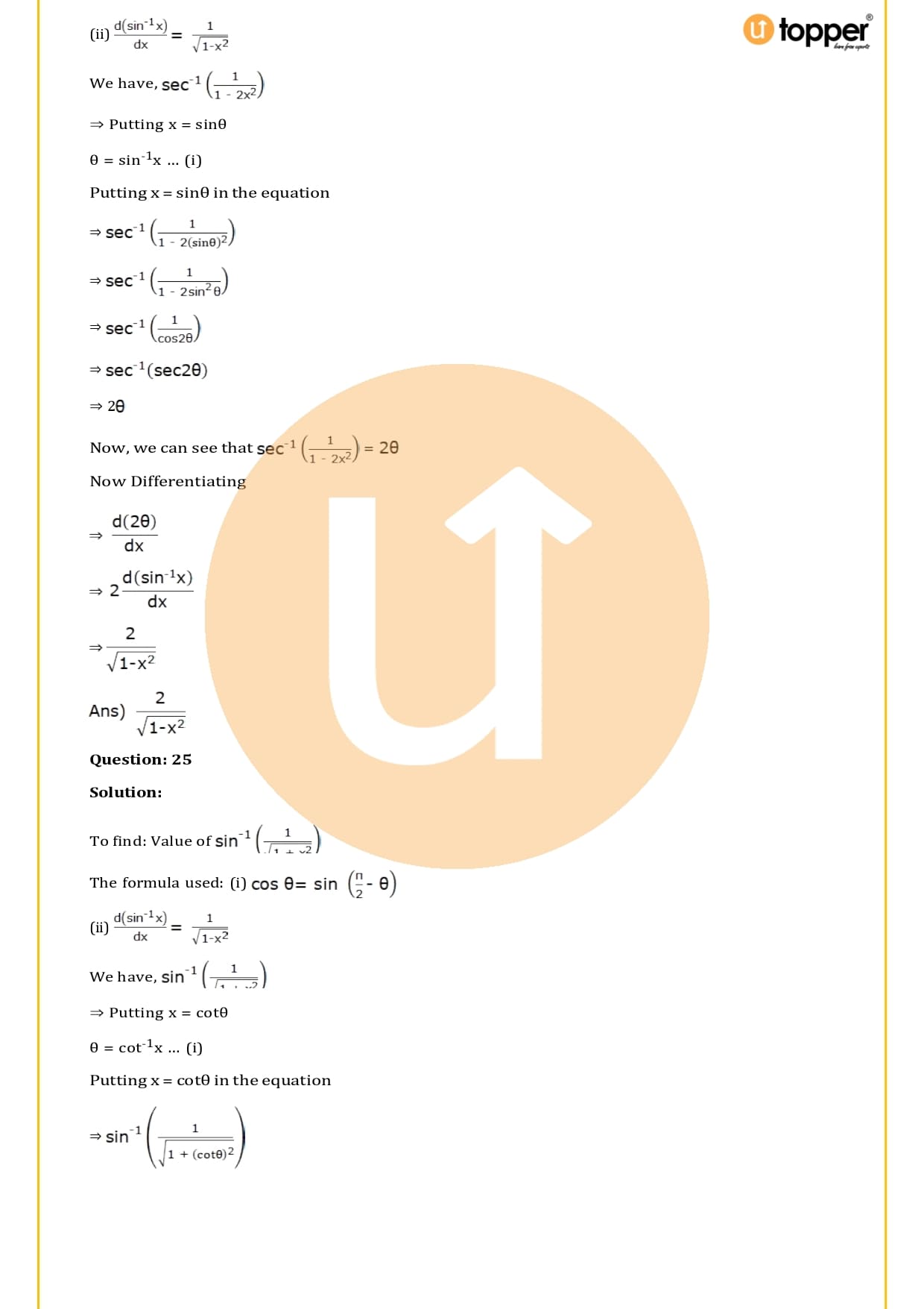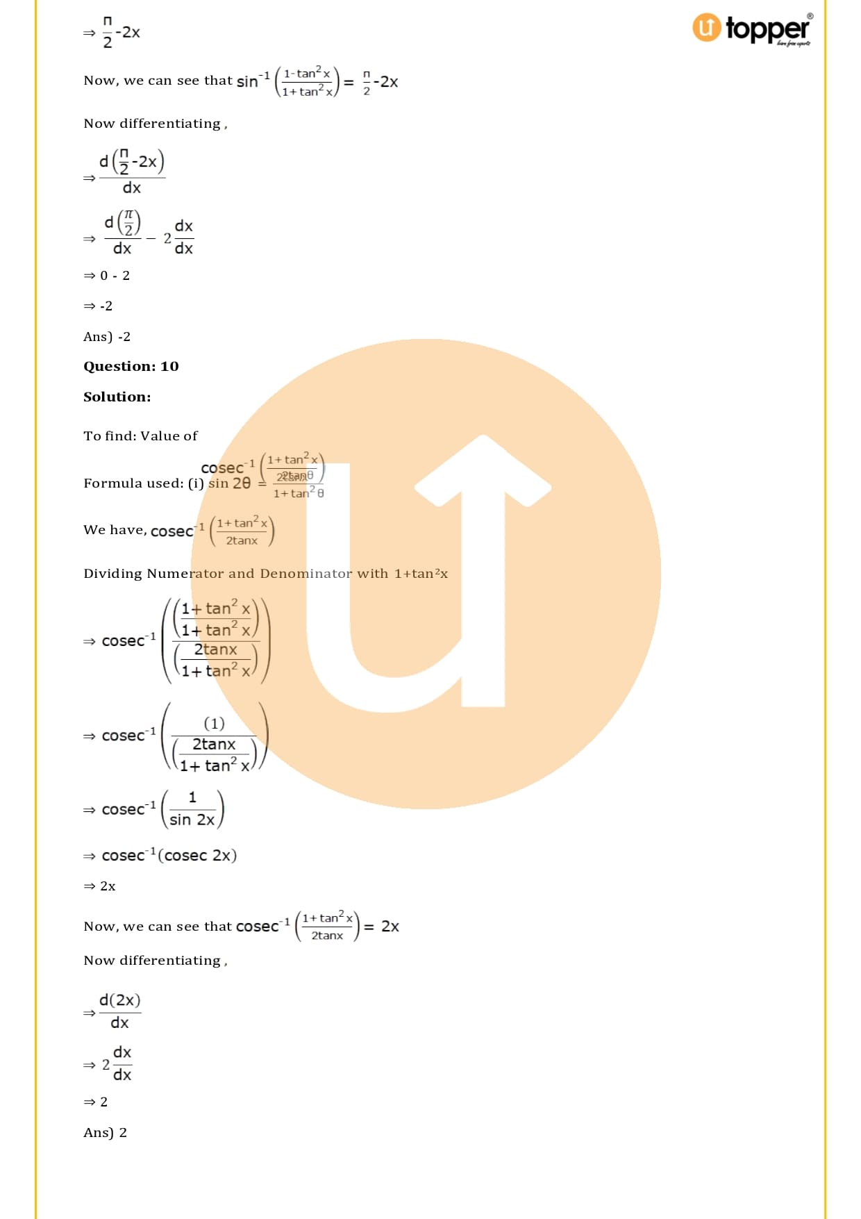 Ans – Trigonometric ratios are the same thing as inverse trigonometry functions. Here are the formulas from RS Aggarwal Class 12 Solutions Chapter 10 on Differentiation for the derivative of inverse trigonometric functions: