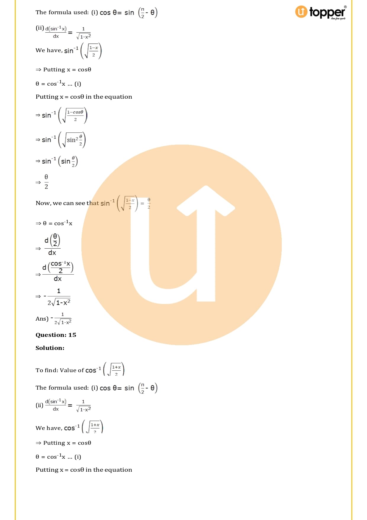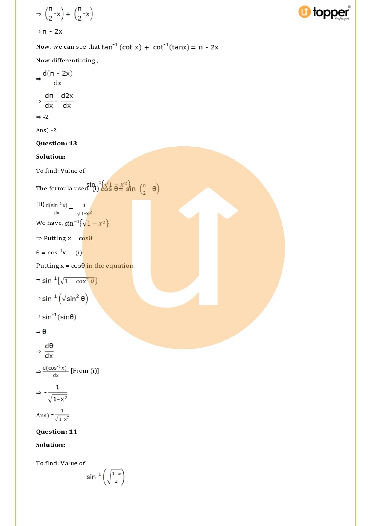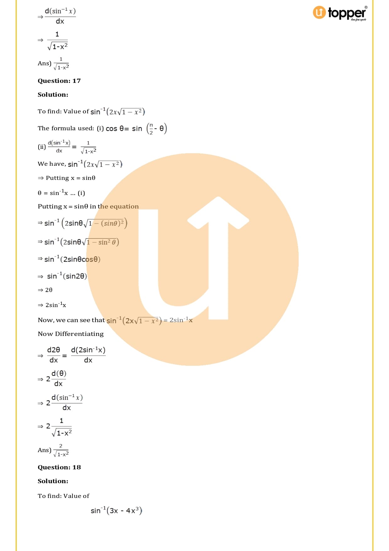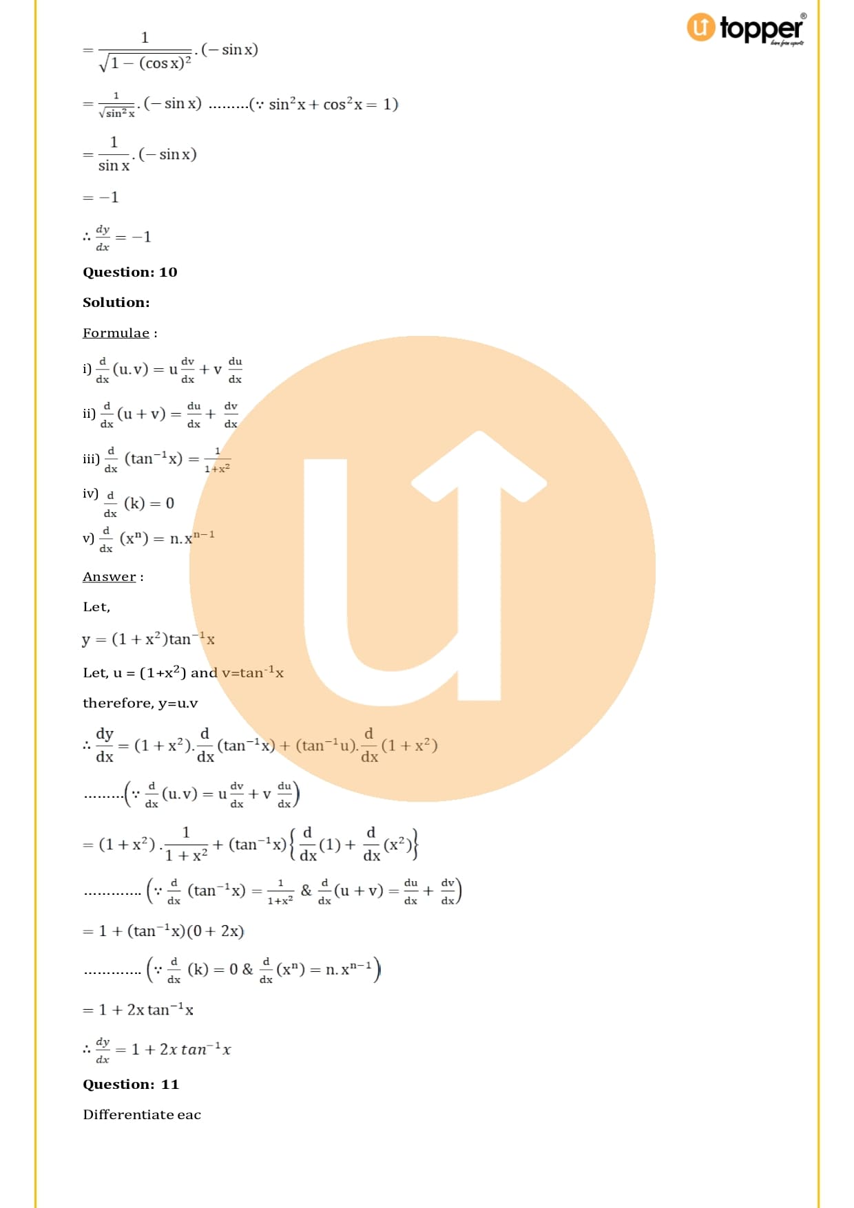 Ans – Trigonometric ratios are the same thing as inverse trigonometry functions. Here are the formulas from RS Aggarwal Class 12 Solutions Chapter 10 on Differentiation for the derivative of inverse trigonometric functions: