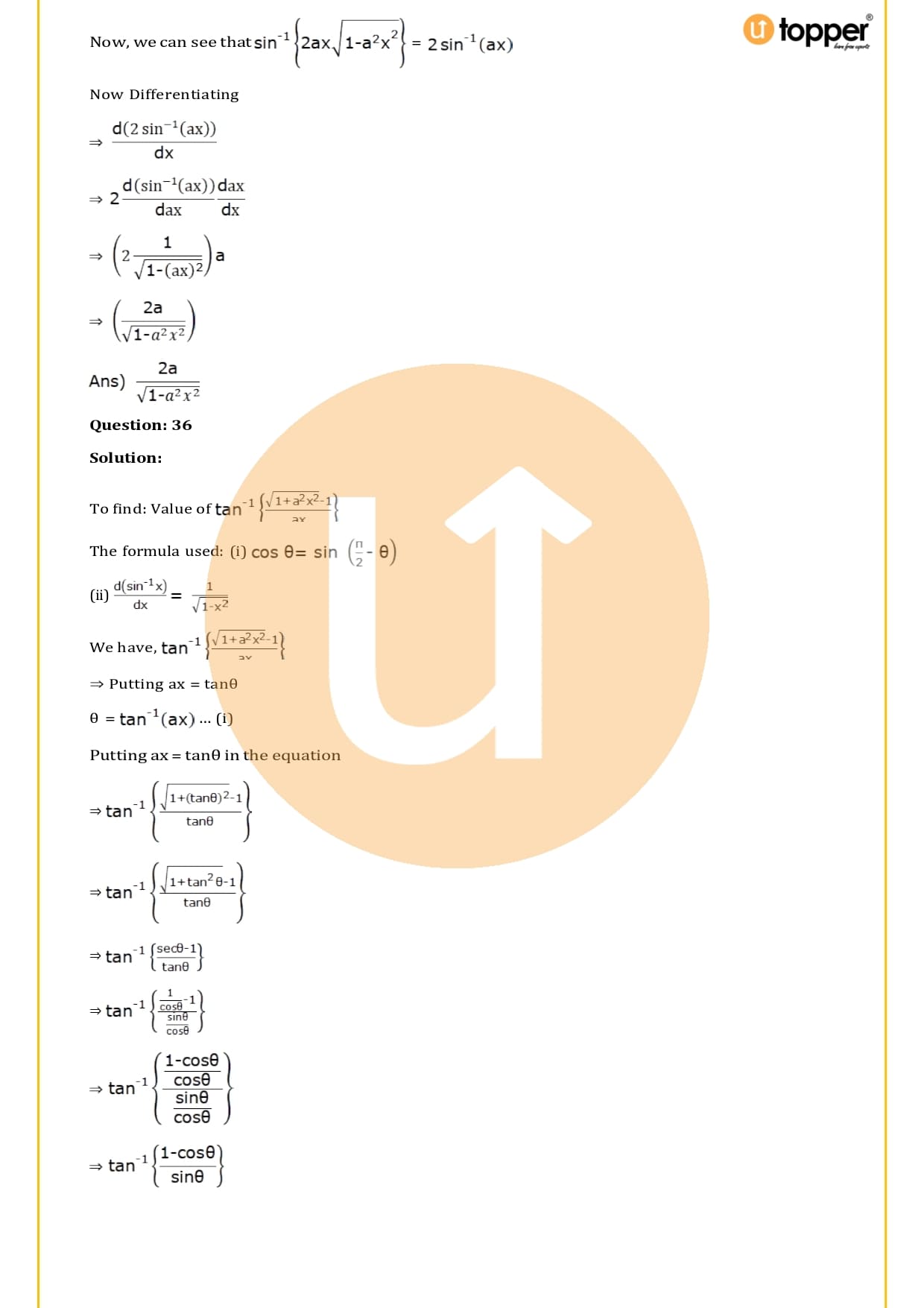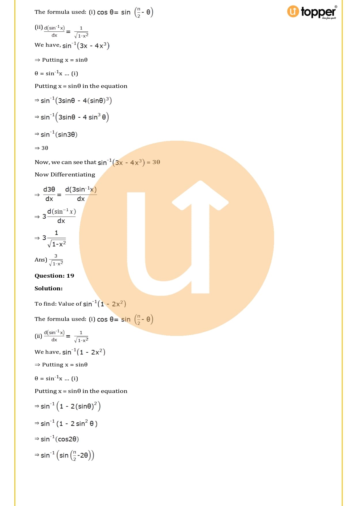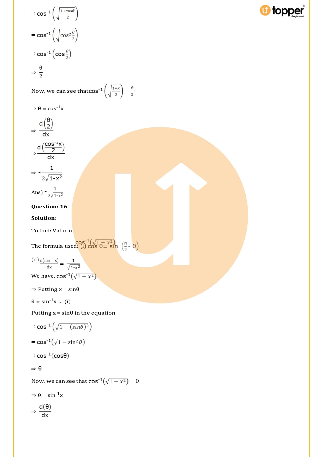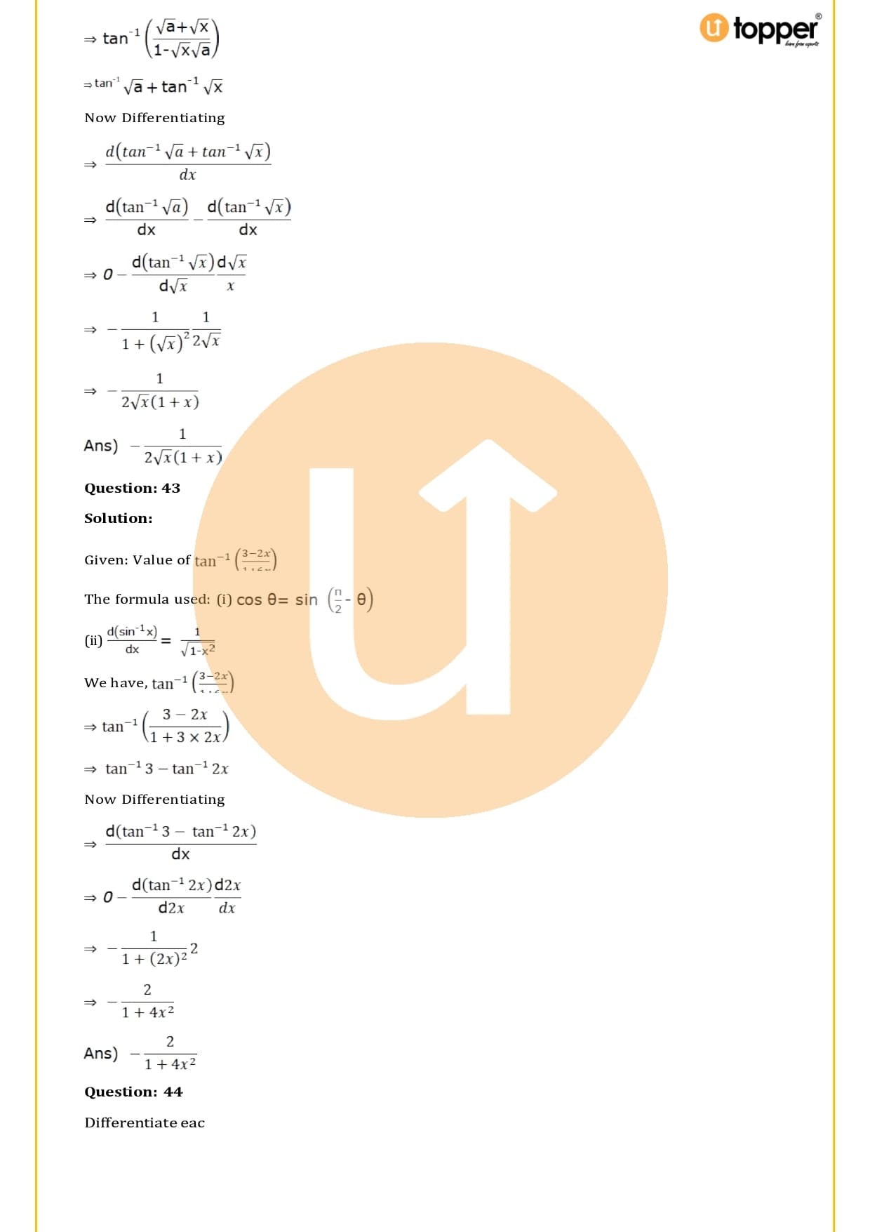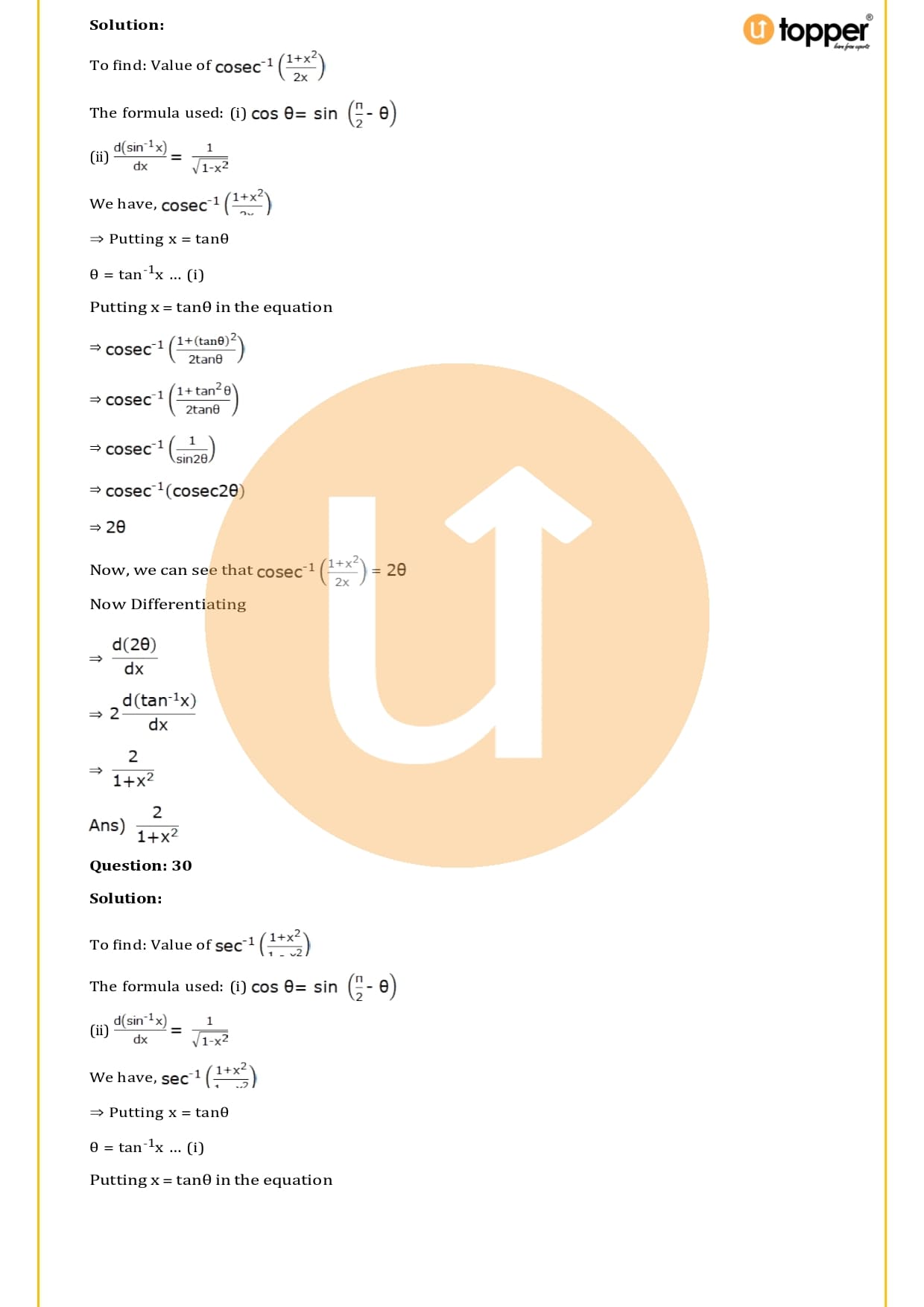 Ans – Trigonometric ratios are the same thing as inverse trigonometry functions. Here are the formulas from RS Aggarwal Class 12 Solutions Chapter 10 on Differentiation for the derivative of inverse trigonometric functions: