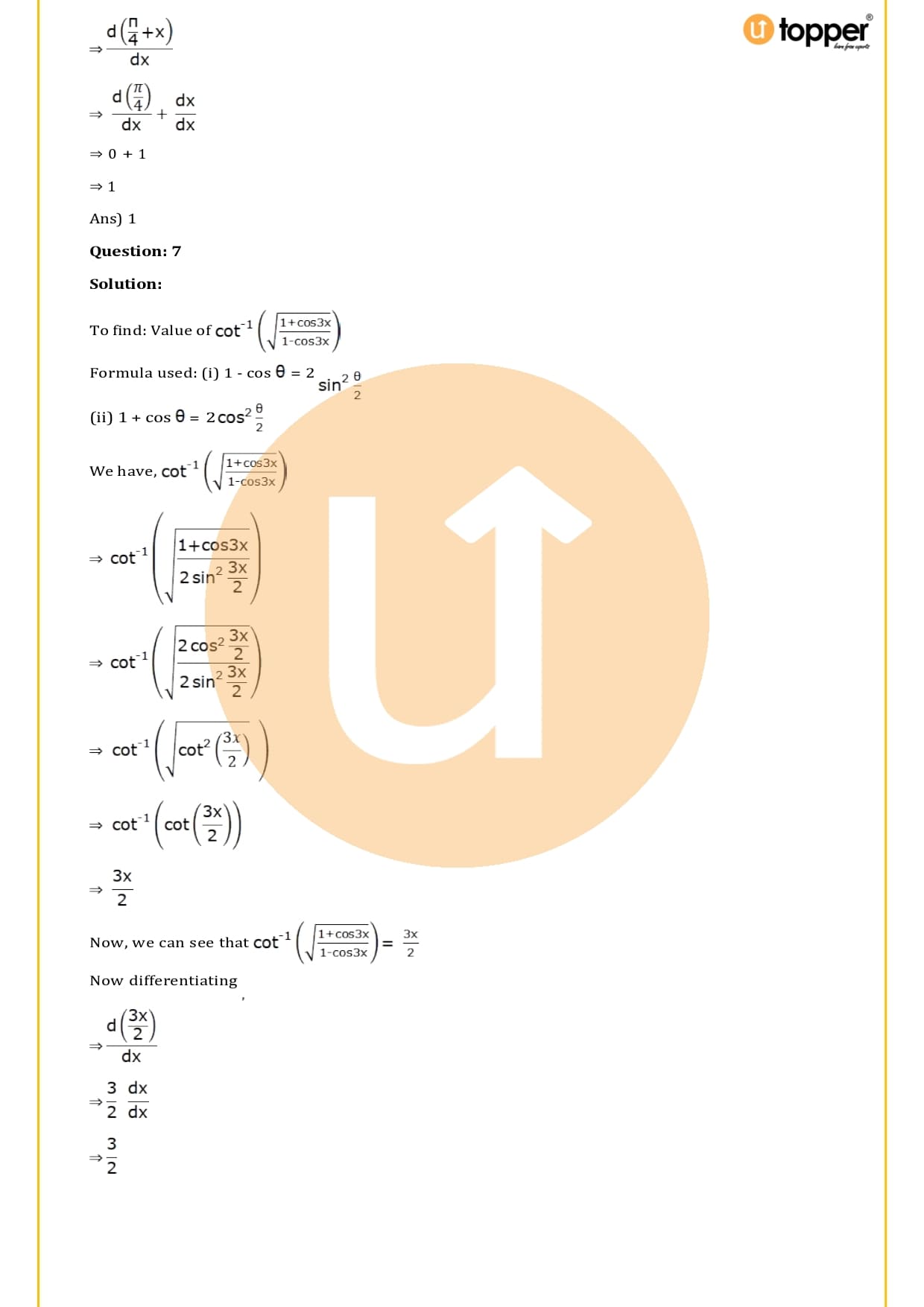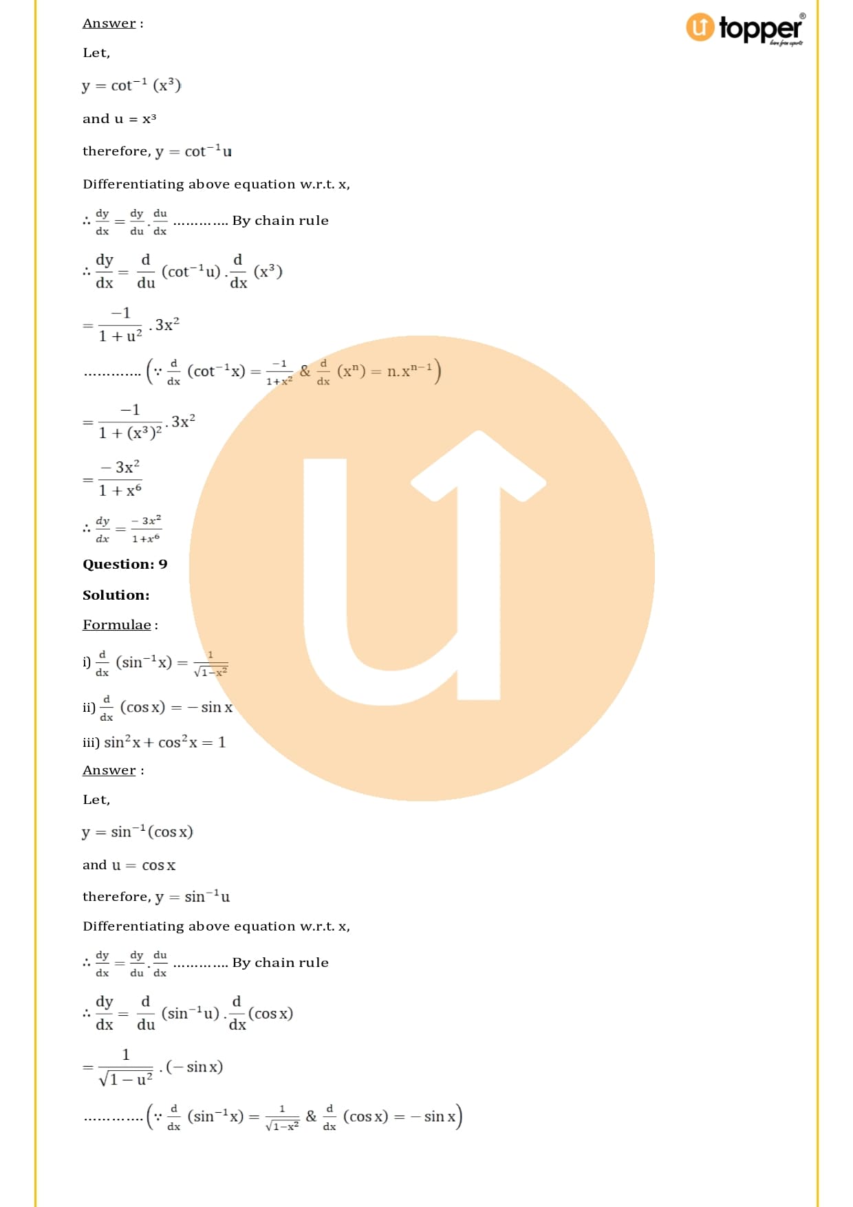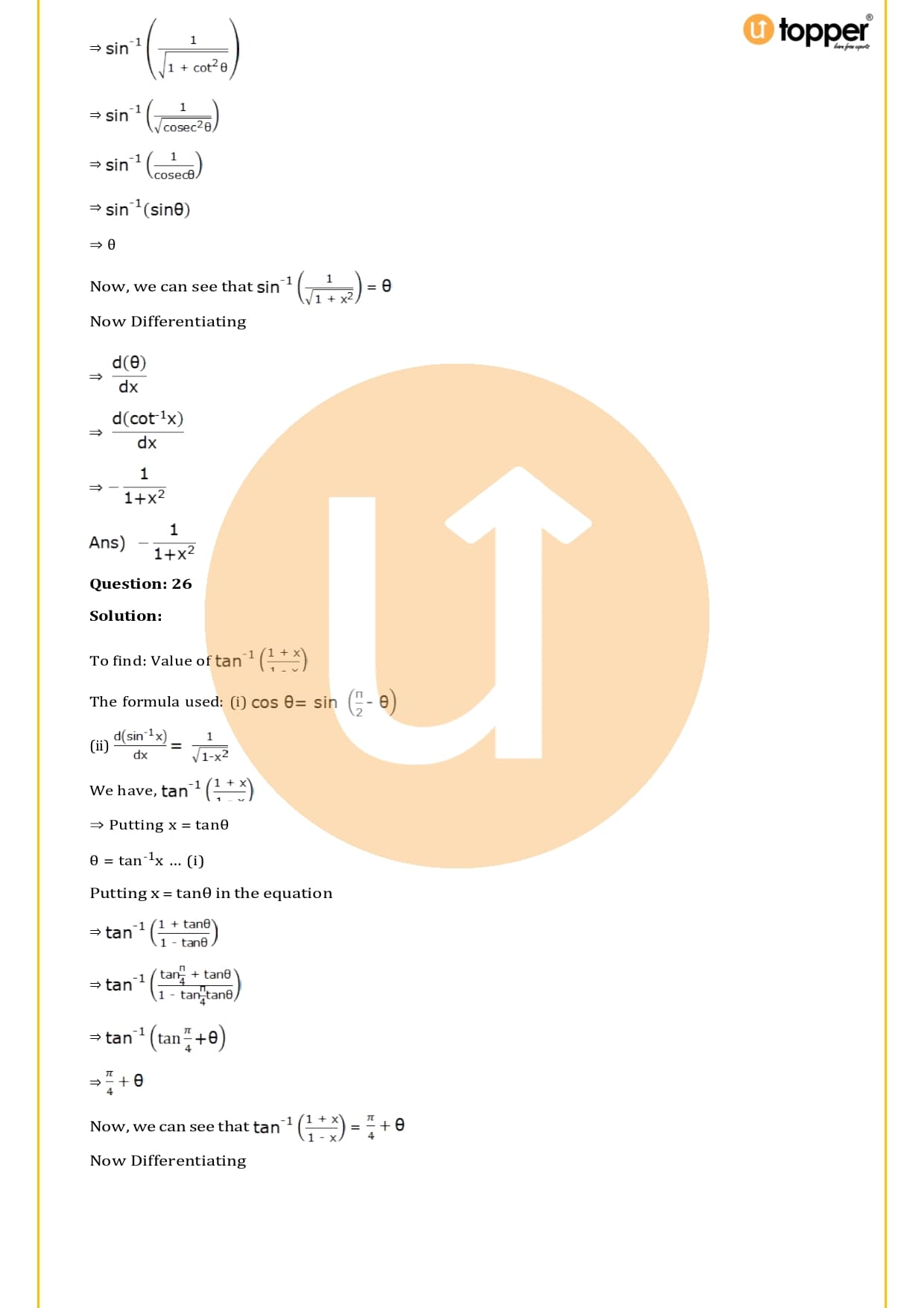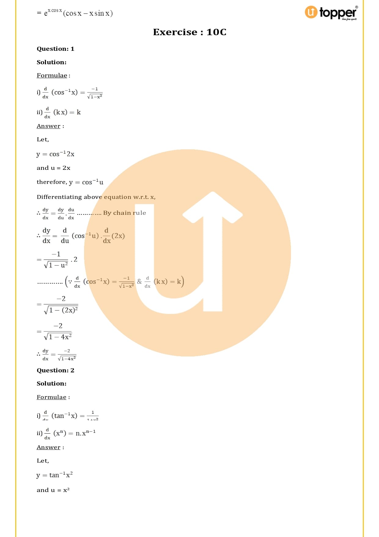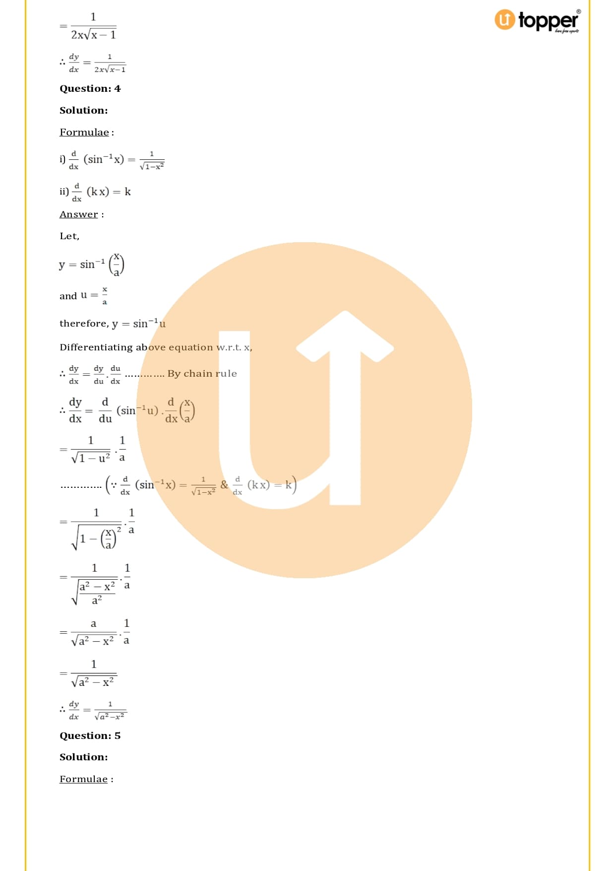 Ans – Trigonometric ratios are the same thing as inverse trigonometry functions. Here are the formulas from RS Aggarwal Class 12 Solutions Chapter 10 on Differentiation for the derivative of inverse trigonometric functions: