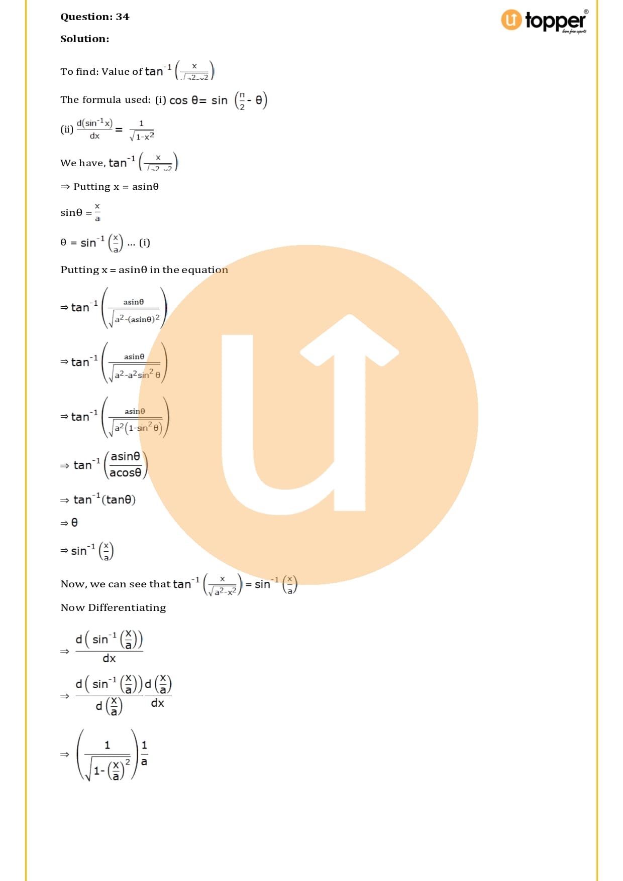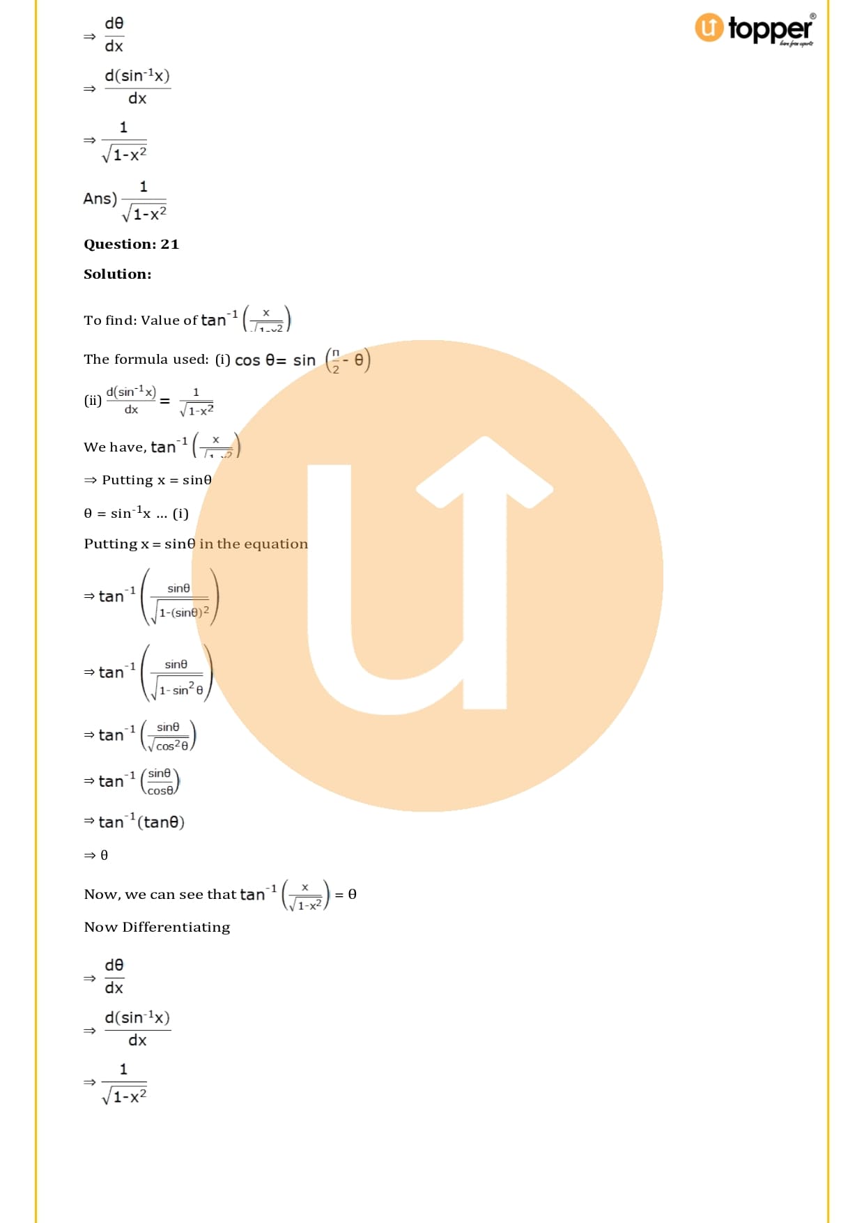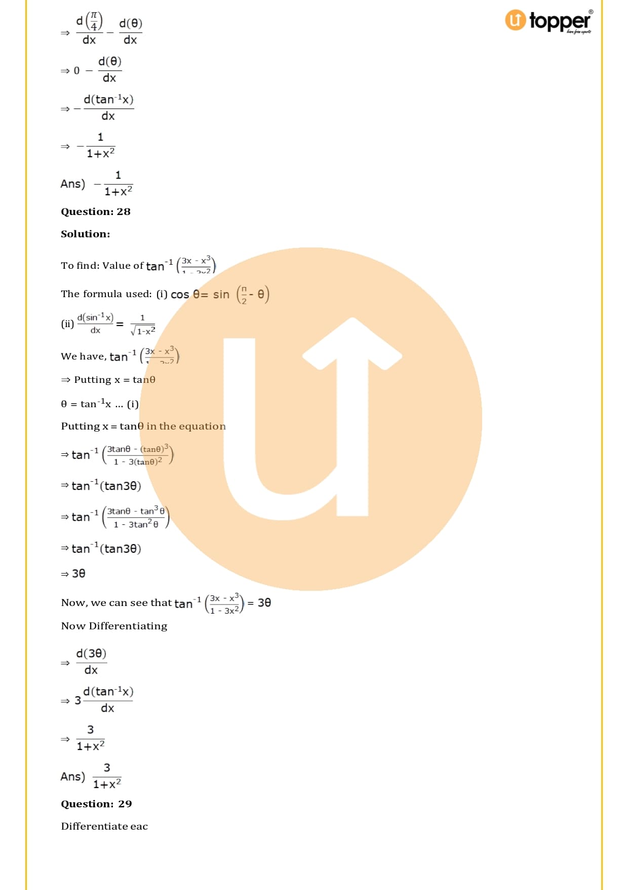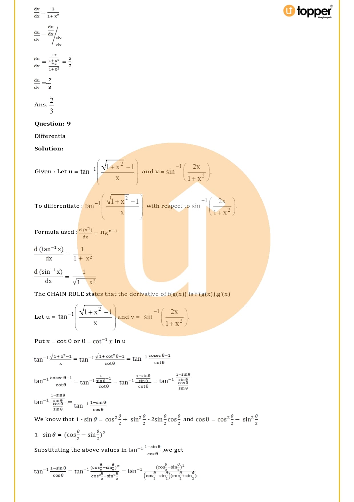 Ans – Trigonometric ratios are the same thing as inverse trigonometry functions. Here are the formulas from RS Aggarwal Class 12 Solutions Chapter 10 on Differentiation for the derivative of inverse trigonometric functions:
